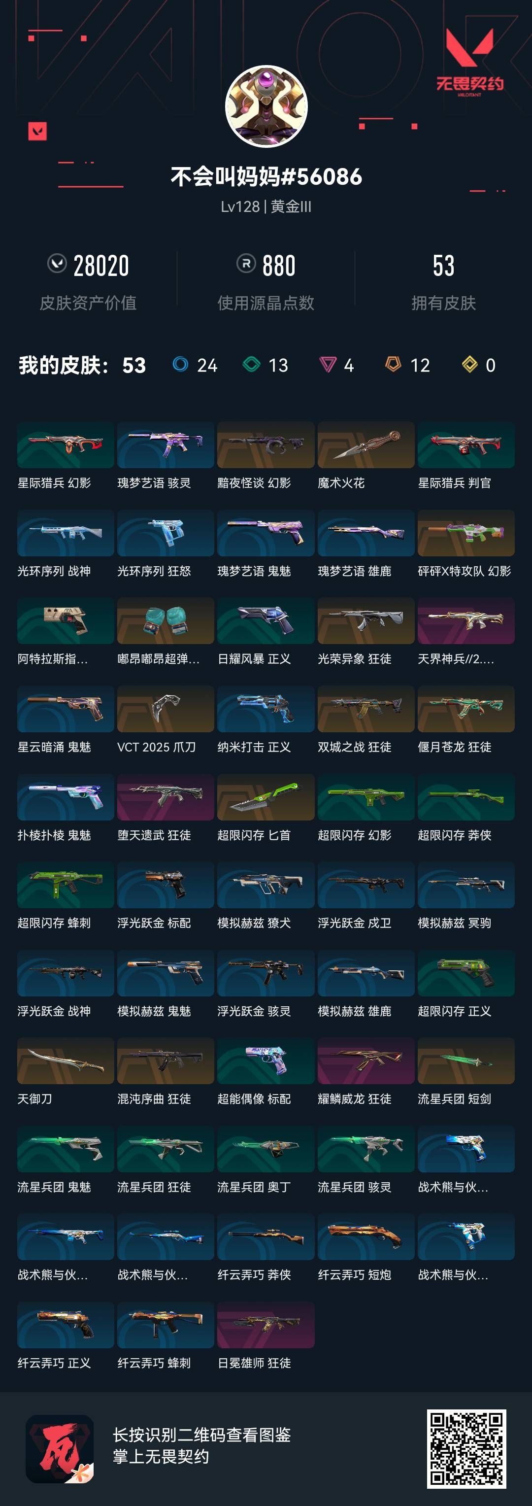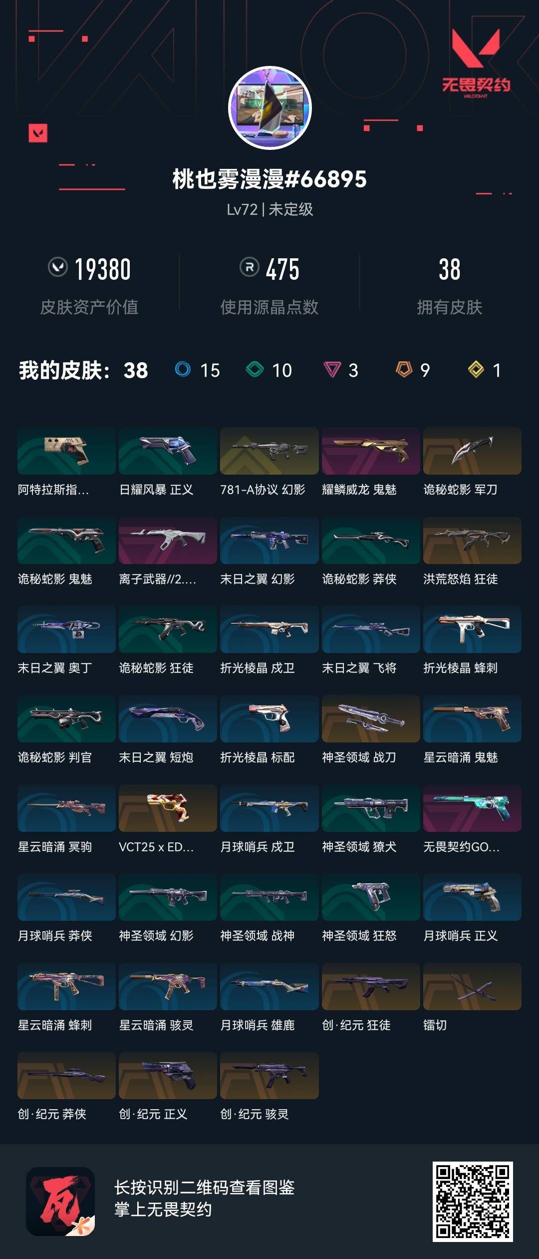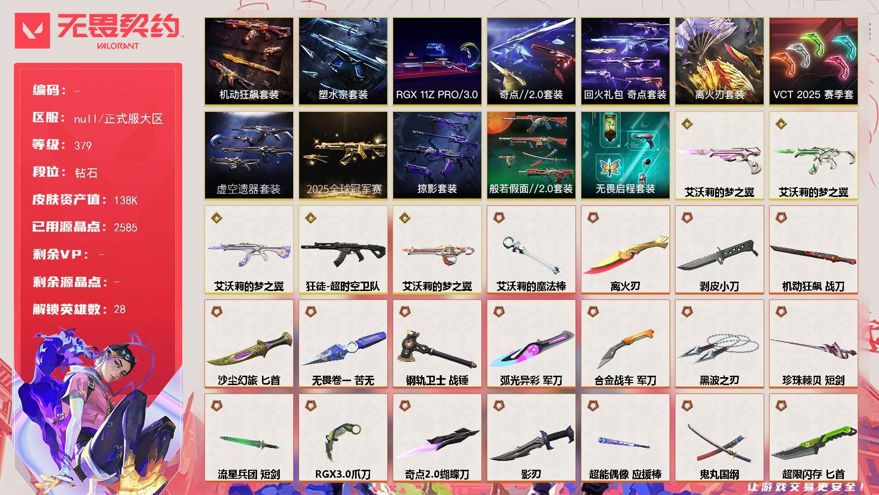【游戏多多】 正式服大区 等级379 28英雄 262皮肤 64限定 5终极 20卓越 【套装】:离火刃套装,艾沃莉的梦之翼套装,机动狂飙套装,塑水宗套装,2025全球冠军赛套装,虚空遗器套装,VCT 2025 赛季套装,RGX 11z Pro//3.0套装,奇点//2.0套装,回火礼包:奇点套装【英雄】:幻棱,炼狱,维斯,暮蝶,钛狐,壹决,铁臂,捷风,雷兹,幽影,不死鸟,贤者,猎枭,蝰蛇,零,芮娜,奇乐,尚勃勒,霓虹,斯凯,夜露,星礈,K/O,海神,盖可,黑梦,钢锁【近战武器】:近战武器-无畏契约GO!第一卷 苦无,近战武器-剥皮小刀,近战武器-离火刃,近战武器-黑波之刃,近战武器-艾沃莉的魔法棒,近战武器-珍珠棘贝 短剑,近战武器-流星兵团 短剑,近战武器-钢轨卫士 战锤,近战武器-合金战车 军刀,近战武器-弧光异彩 军刀【狂徒】:狂徒-艾沃莉的梦之翼,狂徒-2023全球冠军赛,狂徒-归零者,狂徒-洪荒怒焰,狂徒-机动狂飙,狂徒-全息波普//2.0,狂徒-塑水宗,狂徒-偃月苍龙,狂徒-盖世英雄,狂徒-盖亚的复仇【幻影】:幻影-砰砰X特攻队,幻影-奇点,幻影-千灵华绽,幻影-侦察力量,幻影-合金战车,幻影-噬源兽防卫工程,幻影-珍珠棘贝,幻影-战术小伙伴,幻影-虚空遗器,幻影-电音光谱【戍卫】:戍卫-破败军械,戍卫-钢轨卫士,戍卫-珍珠棘贝,戍卫-彩梦之城,戍卫-花漾粉红,戍卫-萌彩剪影,戍卫-掠影,戍卫-超能偶像,戍卫-浮光跃金,戍卫-逆冲蛮牛【獠犬】:獠犬-弧光异彩,獠犬-复古浪潮,獠犬-胡桃狂想,獠犬-数码咒术,獠犬-战术小伙伴,獠犬-般若假面//2.0,獠犬-神圣领域,獠犬-采蜜小蜂队,獠犬-模拟赫兹,獠犬-逆冲蛮牛【冥驹】:冥驹-千灵华绽,冥驹-盖世英雄,冥驹-无垠星环,冥驹-复古浪潮,冥驹-胡桃狂想,冥驹-花漾粉红,冥驹-掠影,冥驹-荒土机兵,冥驹-模拟赫兹,冥驹-星云暗涌【飞将】:飞将-塑水宗,飞将-合金战车,飞将-沙尘幻旅,飞将-信手涂鸦,飞将-光导纤维,飞将-聚合之力,飞将-战术熊与伙伴们,飞将-末日之翼【莽侠】:莽侠-深海水族,莽侠-RGX 11z Pro//3.0,莽侠-超限闪存,莽侠-诡秘蛇影,莽侠-纤云弄巧,莽侠-月球哨兵【战神】:战神-般若假面//2.0,战神-盖亚的复仇//2.0,战神-神圣领域,战神-采蜜小蜂队,战神-浮光跃金,战神-萌彩剪影,战神-深海水族,战神-数码咒术【奥丁】:奥丁 砰砰X特攻队,奥丁 信手涂鸦,奥丁 战术小伙伴,奥丁 流星兵团,奥丁 纳米打击,奥丁 末日之翼 【奥丁】:奥丁-艾沃莉的梦之翼,奥丁-砰砰X特攻队,奥丁-信手涂鸦,奥丁-战术小伙伴,奥丁-流星兵团,奥丁-纳米打击,奥丁-末日之翼【判官】:判官-白日幻梦,判官-多边形,判官-萌彩剪影,判官-数码咒术,判官-虚空遗器,判官-超能偶像,判官-诡秘蛇影,判官-采蜜小蜂队,判官-纳米打击x【雄鹿】:雄鹿-机动狂飙,雄鹿-彩梦之城,雄鹿-复古浪潮,雄鹿-模拟赫兹,雄鹿-逆冲蛮牛,雄鹿-月球哨兵【骇灵】:骇灵-艾沃莉的梦之翼,骇灵-奇点,骇灵-塑水宗,骇灵-沙尘幻旅,骇灵-珍珠棘贝,骇灵-光导纤维,骇灵-花漾粉红,骇灵-信手涂鸦,骇灵-荒土机兵,骇灵-流星兵团【蜂刺】:蜂刺-机动狂飙,蜂刺-合金战车,蜂刺-弧光异彩,蜂刺-胡桃狂想,蜂刺-深海水族,蜂刺-战术小伙伴,蜂刺-超限闪存,蜂刺-聚合之力,蜂刺-纤云弄巧,蜂刺-星云暗涌【标配】:标配-赛博迷城,标配-彩梦之城,标配-超能冲撞,标配-光导纤维,标配-最终庇护,标配-超能偶像,标配-荒土机兵,标配-浮光跃金,标配-战术熊与伙伴们,标配-折光棱晶【VCT手枪】:标配-VCT x KRÜ【正义】:正义-RGX 11z Pro//3.0,正义-机动狂飙,正义-奇点,正义-塑水宗,正义-西部未来,正义-虚空遗器,正义-掠影,正义-超限闪存,正义-合金战车,正义-沙尘幻旅【鬼魅】:鬼魅-艾沃莉的梦之翼,鬼魅-盖亚的复仇,鬼魅-异彩晶棱,鬼魅-光导纤维,鬼魅-胡桃狂想,鬼魅-数码咒术,鬼魅-信手涂鸦,鬼魅-奇点//2.0,鬼魅-流星兵团,鬼魅-诡秘蛇影【狂怒】:狂怒-钢轨卫士,狂怒-珍珠棘贝,狂怒-花漾粉红,狂怒-萌彩剪影,狂怒-般若假面//2.0,狂怒-神圣领域,狂怒-聚合之力,狂怒-逆冲蛮牛,狂怒-战术熊与伙伴们【短炮】:短炮-钢轨卫士,短炮-弧光异彩,短炮-深海水族,短炮-纤云弄巧,短炮-末日之翼【详情请看截图,皮肤可能含有某些特权皮肤,具体以游戏内实际拥有为准】