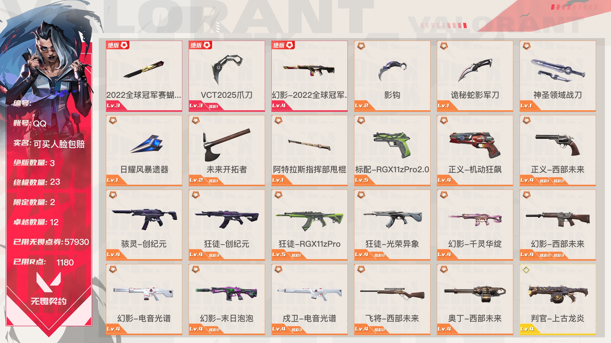 【游戏多多】 【可包人脸】【6tnj3b1fd】lv128|钻石iii, 刀皮数量8,呛皮数量88(绝版3限定23终极2卓越12);皮肤资产价值57930,已用r点1180;【刀皮】:近战武器-2022全球冠军赛蝴蝶刀,近战武器-vct2025爪刀,近战武器-影钩,近战武器-诡秘蛇影军刀,近战武器-神圣领域战刀,近战武器-日耀风暴遗器,近战武器-未来开拓者,近战武器-阿特拉斯指挥部甩棍; 【呛皮】:幻影-2022全球冠军赛,标配-rgx11zpro2.0,正义-机动狂飙,正义-西部未来,骇灵-创纪元,狂徒-创纪元,狂徒-rgx11zpro,狂徒-光荣异象,幻影-千灵华绽,幻影-西部未来,幻影-电音光谱,幻影-末日泡泡,戍卫-电音光谱,飞将-西部未来,奥丁-西部未来,判官-上古龙炎,狂徒-艾沃莉的梦之翼,鬼魅-盖亚的复仇,鬼魅-掠影2.0,骇灵-掠影2.0,狂徒-离子武器2.0,狂徒-堕天遗武,狂徒-盖世英雄,狂徒-起源,狂徒-奇幻朋克3.0,幻影-掠影2.0,獠犬-日冕雄师,冥驹-掠影,奥丁-掠影2.0,鬼魅-诡秘蛇影,判官-星际猎兵,判官-诡秘蛇影,狂徒-诡秘蛇影,幻影-星际猎兵,飞将-星际猎兵,莽侠-诡秘蛇影,鬼魅-数码咒术,狂徒-阿特拉斯指挥部,幻影-日耀风暴,幻影-神圣领域,獠犬-神圣领域,莽侠-阿特拉斯指挥部,正义-日耀风暴,标配-阿特拉斯指挥部,狂怒-神圣领域,骇灵-阿特拉斯指挥部,骇灵-日耀风暴,奥丁-日耀风暴,战神-神圣领域,狂徒-瑰梦艺语,幻影-悠闲猫生,幻影-末日之翼,戍卫-光环序列,戍卫-太空穿梭,戍卫-甜蜜战术,戍卫-折光棱晶,戍卫-月球哨兵,獠犬-悠闲猫生,獠犬-幻语魔咒,冥驹-光环序列,冥驹-甜蜜战术,冥驹-星云暗涌,莽侠-月球哨兵,飞将-悠闲猫生,飞将-幻语魔咒,飞将-末日之翼,正义-太空穿梭,正义-月球哨兵,鬼魅-瑰梦艺语,鬼魅-甜蜜战术,鬼魅-星云暗涌,标配-折光棱晶,短炮-悠闲猫生,短炮-末日之翼,狂怒-光环序列,狂怒-幻语魔咒,骇灵-瑰梦艺语,骇灵-星云暗涌,蜂刺-折光棱晶,蜂刺-星云暗涌,判官-太空穿梭,判官-甜蜜战术,雄鹿-瑰梦艺语,雄鹿-幻语魔咒,雄鹿-月球哨兵,奥丁-末日之翼,战神-光环序列,战神-太空穿梭;【热门卡面】:双城之战金克丝卡面,势不可挡星礈卡面,vct2025cn联赛卡面,vct2025太平洋联赛卡面,vct2025美洲联赛卡面,vct2025emea联赛卡面,西部未来卡面,双城之战拥抱卡面;【热门挂饰】:蓄势待滚挂饰,v25第三幕超凡挂饰,神中神挂饰,vct2025cn联赛挂饰,vct2025太平洋联赛挂饰,vct2025emea联赛挂饰,vct2025美洲联赛挂饰,西部未来挂饰,双城之战小蛋糕挂饰,袖珍捷风挂饰,鱼骨头挂饰,双城之战魄罗挂饰,幸运中国结挂饰;【热门喷漆】:2022全球冠军赛喷漆,捷风跳peek喷漆,真烦人喷漆,西部未来喷漆,双击点赞喷漆,醒狮贺春喷漆,纸箱小猫喷漆,没有资金喷漆;详情看图【皮肤可能含有某些特权皮肤,具体以游戏内实际拥有为准】【qq】【可买人脸包赔】【官方截图】