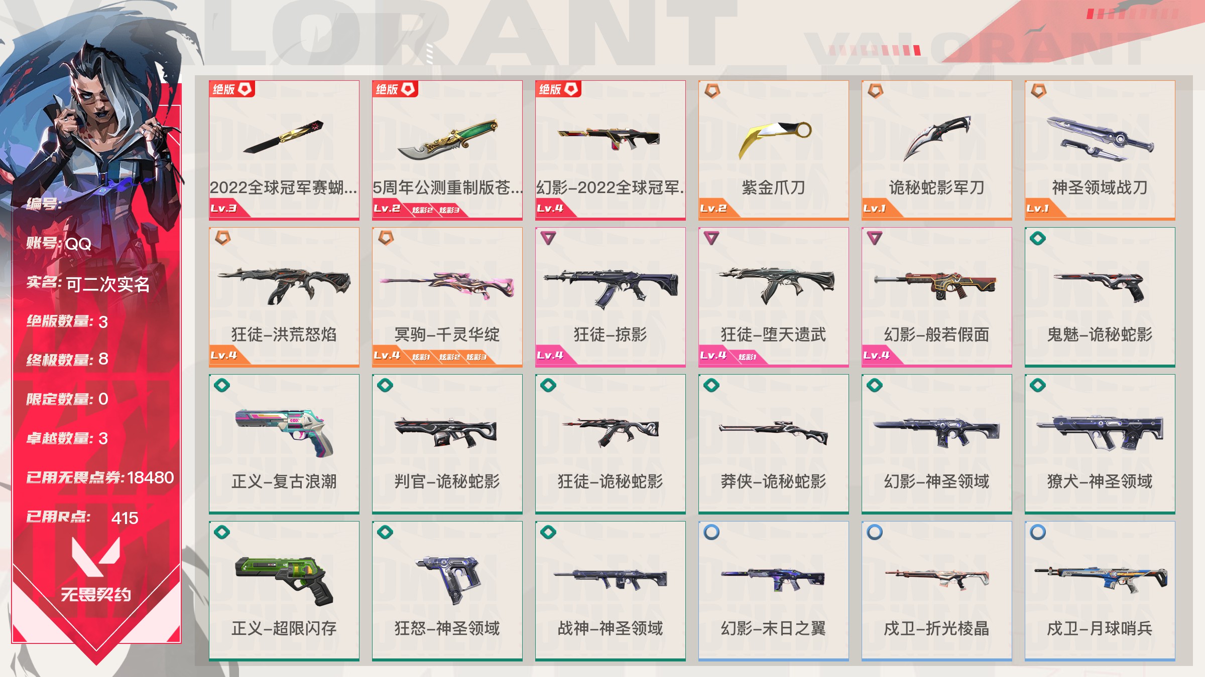 【游戏多多】 【可二次实名】【6ztq6gh2b】lv112|未定级, 刀皮数量10,呛皮数量77(绝版4限定22终极1卓越5);皮肤资产价值45420,已用r点1055;【刀皮】:近战武器-2022全球冠军赛蝴蝶刀,近战武器-vct2025爪刀,近战武器-魔术火花,近战武器-诡秘蛇影军刀,近战武器-神之刃,近战武器-神圣领域战刀,近战武器-双生獠牙,近战武器-日耀风暴遗器,近战武器-阿特拉斯指挥部甩棍,近战武器-星际猎兵短剑; 【呛皮】:狂徒-2025全球冠军赛,幻影-2022全球冠军赛,标配-电音光谱,正义-西部未来,骇灵-光明哨兵2.0,狂徒-塑水宗,狂徒-洪荒怒焰,狂徒-rgx11zpro,幻影-千灵华绽,戍卫-破败军械,獠犬-混沌序曲2.0,冥驹-rgx11zpro2.0,鬼魅-超时空卫队,雄鹿-起源,狂徒-掠影,狂徒-日冕雄师,狂徒-紫阙金琅,幻影-侦察力量,标配-星际猎兵,鬼魅-诡秘蛇影,判官-星际猎兵,判官-诡秘蛇影,狂徒-诡秘蛇影,幻影-星际猎兵,飞将-星际猎兵,莽侠-诡秘蛇影,狂徒-阿特拉斯指挥部,幻影-日耀风暴,幻影-神圣领域,獠犬-神圣领域,莽侠-阿特拉斯指挥部,正义-日耀风暴,标配-阿特拉斯指挥部,狂怒-神圣领域,骇灵-阿特拉斯指挥部,骇灵-日耀风暴,奥丁-日耀风暴,战神-神圣领域,狂徒-瑰梦艺语,幻影-悠闲猫生,幻影-末日之翼,戍卫-光环序列,戍卫-太空穿梭,戍卫-甜蜜战术,戍卫-折光棱晶,戍卫-月球哨兵,獠犬-悠闲猫生,獠犬-幻语魔咒,冥驹-光环序列,冥驹-甜蜜战术,冥驹-星云暗涌,莽侠-月球哨兵,飞将-悠闲猫生,飞将-幻语魔咒,飞将-末日之翼,正义-太空穿梭,正义-月球哨兵,鬼魅-瑰梦艺语,鬼魅-甜蜜战术,鬼魅-星云暗涌,标配-折光棱晶,短炮-悠闲猫生,短炮-末日之翼,狂怒-光环序列,狂怒-幻语魔咒,骇灵-瑰梦艺语,骇灵-星云暗涌,蜂刺-折光棱晶,蜂刺-星云暗涌,判官-太空穿梭,判官-甜蜜战术,雄鹿-瑰梦艺语,雄鹿-幻语魔咒,雄鹿-月球哨兵,奥丁-末日之翼,战神-光环序列,战神-太空穿梭;【热门卡面】:许愿星砂卡面,势不可挡星礈卡面,vct2025cn联赛卡面,vct2025太平洋联赛卡面,vct2025美洲联赛卡面,vct2025emea联赛卡面;【热门挂饰】:蓄势待滚挂饰,神中神挂饰,vct2025cn联赛挂饰,vct2025太平洋联赛挂饰,vct2025emea联赛挂饰,vct2025美洲联赛挂饰;【热门喷漆】:比心喷漆,放下武器喷漆,秘笈顺序喷漆,2022全球冠军赛喷漆,捷风跳peek喷漆,买装还是存钱喷漆,真烦人喷漆;详情看图【皮肤可能含有某些特权皮肤,具体以游戏内实际拥有为准】【qq】【可二次实名】【官方截图】