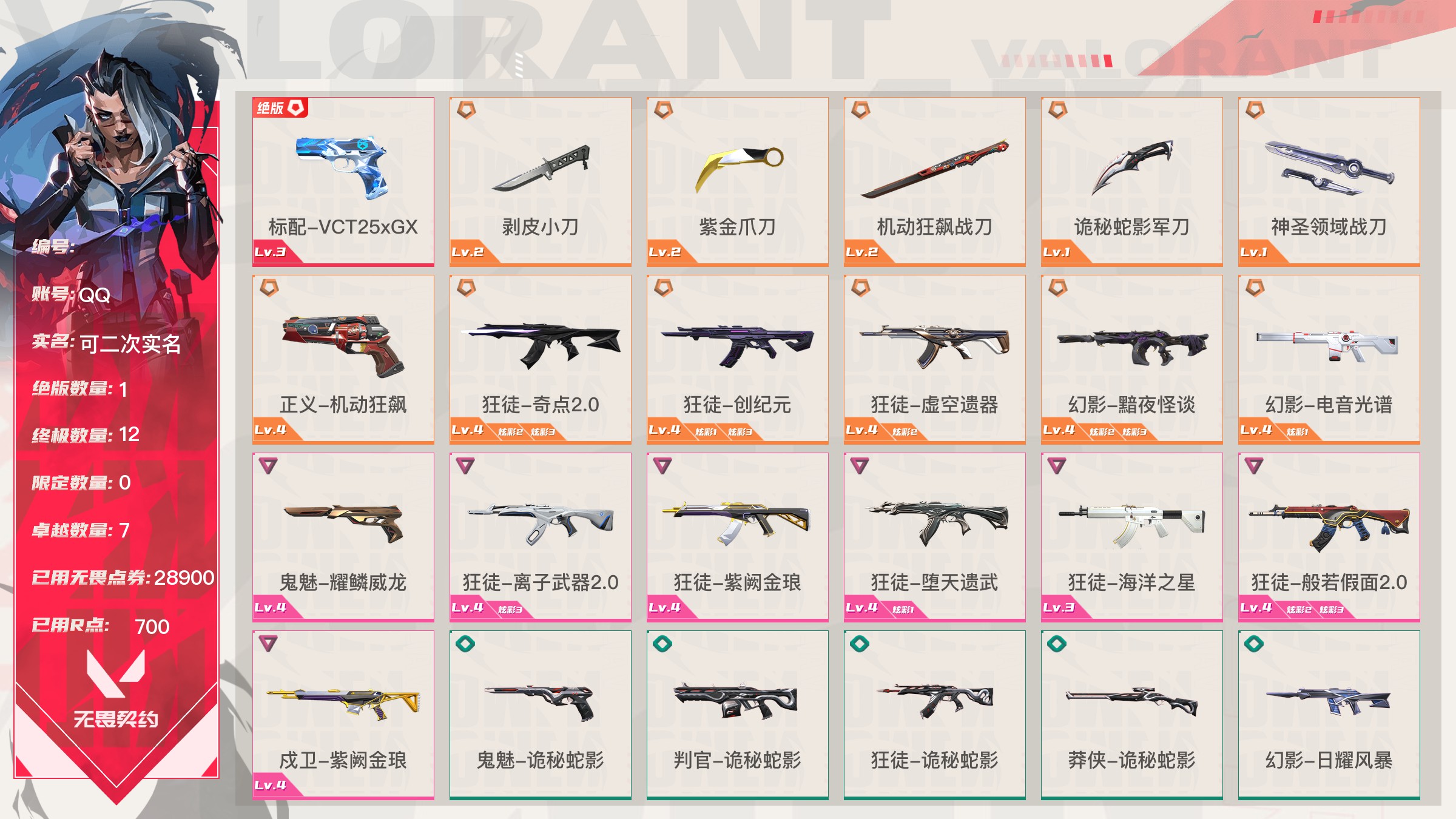 【游戏多多】 【可二次实名】【6tnj32a2h】lv182|未定级, 刀皮数量5,呛皮数量49(绝版1限定12终极0卓越7);皮肤资产价值28900,已用r点700;【刀皮】:近战武器-剥皮小刀,近战武器-紫金爪刀,近战武器-机动狂飙战刀,近战武器-诡秘蛇影军刀,近战武器-神圣领域战刀; 【呛皮】:标配-vct25xgx,正义-机动狂飙,狂徒-奇点2.0,狂徒-创纪元,狂徒-虚空遗器,幻影-黯夜怪谈,幻影-电音光谱,鬼魅-耀鳞威龙,狂徒-离子武器2.0,狂徒-紫阙金琅,狂徒-堕天遗武,狂徒-海洋之星,狂徒-般若假面2.0,戍卫-紫阙金琅,鬼魅-诡秘蛇影,判官-诡秘蛇影,狂徒-诡秘蛇影,莽侠-诡秘蛇影,幻影-日耀风暴,幻影-神圣领域,獠犬-神圣领域,正义-超限闪存,狂怒-神圣领域,骇灵-日耀风暴,奥丁-日耀风暴,战神-神圣领域,幻影-末日之翼,戍卫-甜蜜战术,戍卫-折光棱晶,戍卫-月球哨兵,獠犬-幻语魔咒,冥驹-星云暗涌,莽侠-月球哨兵,飞将-幻语魔咒,飞将-末日之翼,正义-月球哨兵,正义-纳米打击,鬼魅-甜蜜战术,鬼魅-星云暗涌,标配-折光棱晶,短炮-末日之翼,狂怒-幻语魔咒,骇灵-星云暗涌,蜂刺-折光棱晶,蜂刺-星云暗涌,判官-甜蜜战术,雄鹿-幻语魔咒,雄鹿-月球哨兵,奥丁-末日之翼;【热门卡面】:势不可挡不死鸟卡面,势不可挡星礈卡面,vct25xgx卡面,双城之战金克丝卡面,双城之战拥抱卡面;【热门挂饰】:双城之战魄罗挂饰,神中神挂饰,vctxgx挂饰,珍珠奶茶挂饰,金属蝶翼挂饰,双城之战小蛋糕挂饰,终章ko小金人挂饰;【热门喷漆】:vctxgx喷漆,真烦人喷漆,来点朋克喷漆,买装还是存钱喷漆,小丑猫喷漆,醒狮贺春喷漆;详情看图【皮肤可能含有某些特权皮肤,具体以游戏内实际拥有为准】【qq】【可二次实名】【官方截图】