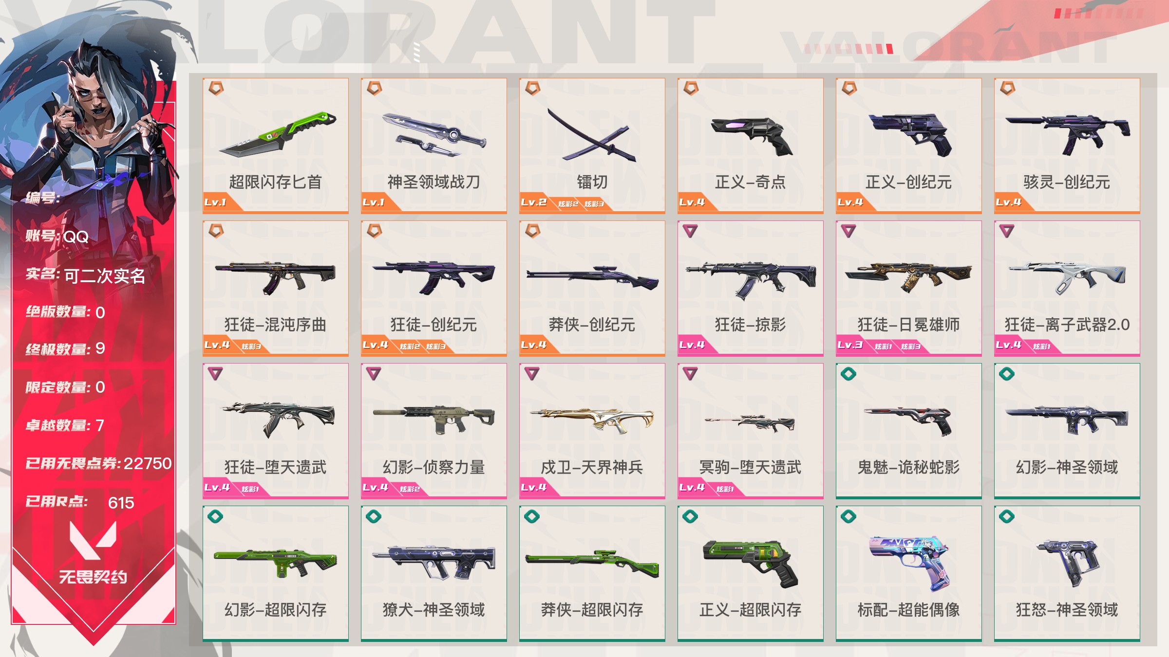 【游戏多多】 【可二次实名】【6tnj3cbfb】lv156|未定级, 刀皮数量3,呛皮数量40(绝版0限定9终极0卓越7);皮肤资产价值22750,已用r点615;【刀皮】:近战武器-超限闪存匕首,近战武器-神圣领域战刀,近战武器-镭切; 【呛皮】:正义-奇点,正义-创纪元,骇灵-创纪元,狂徒-混沌序曲,狂徒-创纪元,莽侠-创纪元,狂徒-掠影,狂徒-日冕雄师,狂徒-离子武器2.0,狂徒-堕天遗武,幻影-侦察力量,戍卫-天界神兵,冥驹-堕天遗武,鬼魅-诡秘蛇影,幻影-神圣领域,幻影-超限闪存,獠犬-神圣领域,莽侠-超限闪存,正义-超限闪存,标配-超能偶像,狂怒-神圣领域,蜂刺-超限闪存,战神-神圣领域,戍卫-月球哨兵,戍卫-浮光跃金,獠犬-模拟赫兹,冥驹-星云暗涌,冥驹-模拟赫兹,莽侠-月球哨兵,正义-月球哨兵,正义-纳米打击,鬼魅-星云暗涌,鬼魅-模拟赫兹,标配-浮光跃金,骇灵-星云暗涌,骇灵-浮光跃金,蜂刺-星云暗涌,雄鹿-月球哨兵,雄鹿-模拟赫兹,战神-浮光跃金;【热门卡面】:势不可挡ko卡面,势不可挡星礈卡面,势不可挡贤者卡面,双城之战金克丝卡面,情人节不死鸟卡面,双城之战拥抱卡面,势不可挡不死鸟卡面;【热门挂饰】:神中神挂饰,创纪元挂饰,双城之战小蛋糕挂饰,致命一击挂饰,鱼骨头挂饰,终章ko小金人挂饰,袖珍捷风挂饰,糖葫芦挂饰;【热门喷漆】:飓刃涂鸦喷漆,福星高照喷漆,真烦人喷漆,皮蛋呼呼喷漆,小丑猫喷漆,买装还是存钱喷漆;详情看图【皮肤可能含有某些特权皮肤,具体以游戏内实际拥有为准】【qq】【可二次实名】【官方截图】