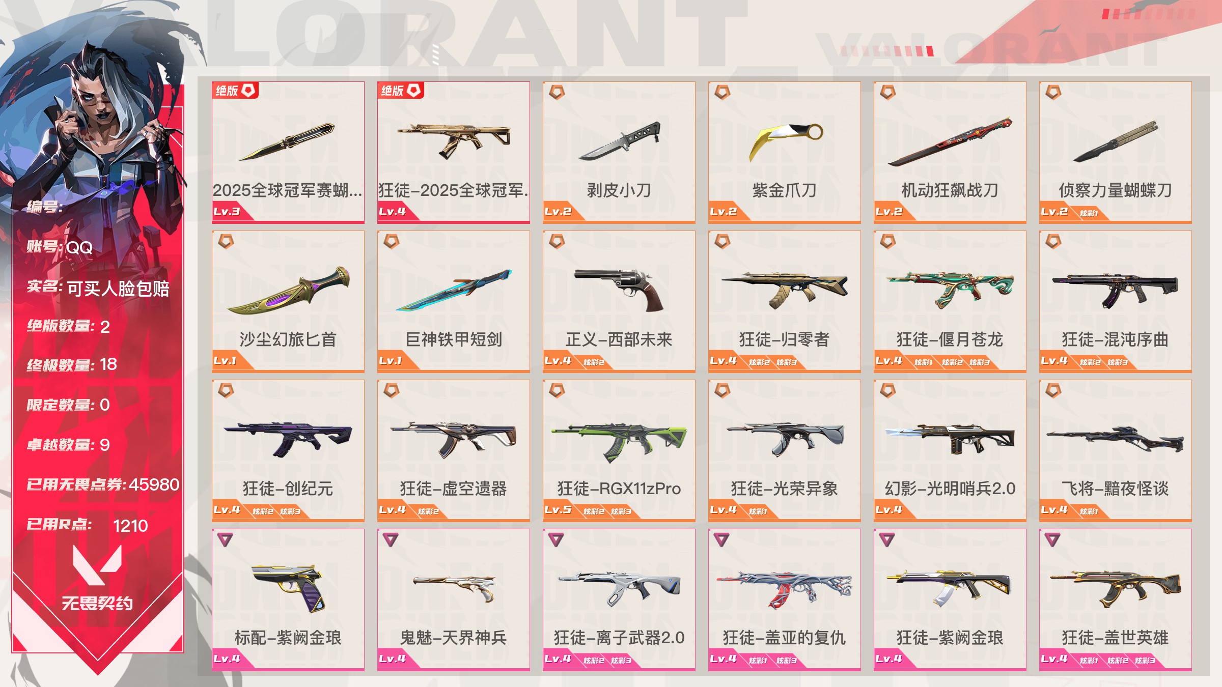 【游戏多多】 【可包人脸】【6tnj3eddg】lv307|超凡i, 刀皮数量27,呛皮数量204(绝版9限定57终极3卓越27);皮肤资产价值138410,已用r点2650;【刀皮】:近战武器-2025全球冠军赛蝴蝶刀,近战武器-2022全球冠军赛蝴蝶刀,近战武器-vct2025爪刀,近战武器-显卡3.0爪刀,近战武器-闪耀之星荧光棒,近战武器-鬼丸国纲,近战武器-影钩,近战武器-魔术火花,近战武器-奇点2.0蝴蝶刀,近战武器-紫金爪刀,近战武器-超限闪存匕首,近战武器-夜刃诡镰,近战武器-威龙之刃,近战武器-天御刀,近战武器-沙尘幻旅匕首,近战武器-钢轨卫士战锤,近战武器-珍珠棘贝短剑,近战武器-流星兵团短剑,近战武器-荒土机兵热能刀,近战武器-诡秘蛇影军刀,近战武器-神圣领域战刀,近战武器-镭切,近战武器-光荣异象歧途,近战武器-日耀风暴遗器,近战武器-未来开拓者,近战武器-阿特拉斯指挥部甩棍,近战武器-星际猎兵短剑; 【呛皮】:标配-vct25xprx,标配-vctxprx,标配-vctxedg,狂徒-2025全球冠军赛,狂徒-双城之战,幻影-2022全球冠军赛,标配-光荣异象,鬼魅-奇点2.0,正义-奇点,正义-创纪元,正义-西部未来,骇灵-创纪元,蜂刺-末日泡泡,判官-光荣异象,狂徒-全息波普2.0,狂徒-奇点2.0,狂徒-塑水宗,狂徒-光明哨兵,狂徒-偃月苍龙,狂徒-混沌序曲,狂徒-创纪元,狂徒-rgx11zpro,狂徒-光荣异象,幻影-千灵华绽,幻影-西部未来,幻影-电音光谱,冥驹-光荣异象,飞将-西部未来,莽侠-创纪元,奥丁-西部未来,狂徒-艾沃莉的梦之翼,狂徒-超时空卫队,幻影-781-a协议,鬼魅-耀鳞威龙,鬼魅-天界神兵,鬼魅-掠影2.0,正义-离子武器,狂怒-般若假面2.0,骇灵-掠影2.0,雄鹿-起源,狂徒-掠影,狂徒-日冕雄师,狂徒-离子武器2.0,狂徒-盖亚的复仇,狂徒-堕天遗武,狂徒-耀鳞威龙,狂徒-般若假面2.0,狂徒-奇幻朋克3.0,幻影-侦察力量,幻影-般若假面,幻影-掠影2.0,幻影-奇幻朋克3.0,戍卫-天界神兵,獠犬-般若假面2.0,冥驹-离子武器,冥驹-堕天遗武,奥丁-紫阙金琅2.0,奥丁-掠影2.0,战神-盖亚的复仇2.0,战神-般若假面2.0,标配-星际猎兵,鬼魅-诡秘蛇影,正义-复古浪潮,正义-沙尘幻旅,短炮-钢轨卫士,狂怒-钢轨卫士,骇灵-流星兵团,骇灵-沙尘幻旅,判官-星际猎兵,判官-诡秘蛇影,雄鹿-复古浪潮,狂徒-诡秘蛇影,狂徒-钢轨卫士,狂徒-沙尘幻旅,幻影-星际猎兵,戍卫-钢轨卫士,獠犬-复古浪潮,冥驹-复古浪潮,飞将-星际猎兵,飞将-沙尘幻旅,莽侠-诡秘蛇影,标配-光导纤维,鬼魅-光导纤维,鬼魅-胡桃狂想,鬼魅-灵魂消声者,短炮-深海水族,狂怒-珍珠棘贝,狂怒-萌彩剪影,骇灵-珍珠棘贝,骇灵-光导纤维,蜂刺-深海水族,蜂刺-战术小伙伴,蜂刺-胡桃狂想,判官-萌彩剪影,幻影-珍珠棘贝,幻影-战术小伙伴,戍卫-珍珠棘贝,戍卫-萌彩剪影,獠犬-战术小伙伴,獠犬-胡桃狂想,冥驹-胡桃狂想,飞将-光导纤维,莽侠-深海水族,奥丁-战术小伙伴,战神-深海水族,战神-萌彩剪影,狂徒-阿特拉斯指挥部,狂徒-荒土机兵,狂徒-超能偶像,狂徒-流星兵团,幻影-日耀风暴,幻影-神圣领域,幻影-超限闪存,戍卫-超能偶像,獠犬-神圣领域,冥驹-荒土机兵,莽侠-阿特拉斯指挥部,莽侠-超限闪存,正义-日耀风暴,正义-超限闪存,鬼魅-流星兵团,标配-阿特拉斯指挥部,标配-荒土机兵,标配-超能偶像,狂怒-神圣领域,骇灵-阿特拉斯指挥部,骇灵-日耀风暴,骇灵-荒土机兵,蜂刺-超限闪存,判官-超能偶像,奥丁-日耀风暴,奥丁-流星兵团,战神-神圣领域,狂徒-瑰梦艺语,幻影-悠闲猫生,幻影-末日之翼,幻影-纳米打击,幻影-聚合之力,戍卫-光环序列,戍卫-太空穿梭,戍卫-甜蜜战术,戍卫-折光棱晶,戍卫-月球哨兵,戍卫-逆冲蛮牛,戍卫-浮光跃金,戍卫-战术熊与伙伴们,獠犬-悠闲猫生,獠犬-幻语魔咒,獠犬-逆冲蛮牛,獠犬-模拟赫兹,獠犬-采蜜小蜂队,冥驹-光环序列,冥驹-甜蜜战术,冥驹-星云暗涌,冥驹-模拟赫兹,莽侠-月球哨兵,莽侠-纤云弄巧,飞将-悠闲猫生,飞将-幻语魔咒,飞将-末日之翼,飞将-聚合之力,飞将-战术熊与伙伴们,正义-太空穿梭,正义-月球哨兵,正义-纳米打击,正义-纤云弄巧,鬼魅-瑰梦艺语,鬼魅-甜蜜战术,鬼魅-星云暗涌,鬼魅-模拟赫兹,鬼魅-采蜜小蜂队,标配-折光棱晶,标配-浮光跃金,标配-战术熊与伙伴们,短炮-悠闲猫生,短炮-末日之翼,短炮-纤云弄巧,狂怒-光环序列,狂怒-幻语魔咒,狂怒-逆冲蛮牛,狂怒-聚合之力,狂怒-战术熊与伙伴们,骇灵-瑰梦艺语,骇灵-星云暗涌,骇灵-浮光跃金,蜂刺-折光棱晶,蜂刺-星云暗涌,蜂刺-聚合之力,蜂刺-纤云弄巧,判官-太空穿梭,判官-甜蜜战术,判官-纳米打击,判官-采蜜小蜂队,雄鹿-瑰梦艺语,雄鹿-幻语魔咒,雄鹿-月球哨兵,雄鹿-逆冲蛮牛,雄鹿-模拟赫兹,奥丁-末日之翼,奥丁-纳米打击,战神-光环序列,战神-太空穿梭,战神-浮光跃金,战神-采蜜小蜂队;【热门卡面】:势不可挡捷风卡面,vct25xprx卡面,星宿灿烂猎枭卡面,情人节猎枭卡面,vct2025cn联赛卡面,vct2025太平洋联赛卡面,vct2025美洲联赛卡面,vct2025emea联赛卡面,势不可挡星礈卡面,西部未来卡面,势不可挡贤者卡面,分崩离析卡面,双城之战拥抱卡面,万圣夜卡面,vctcn首冠卡面,清风徐来卡面,超能偶像卡面,情人节捷风卡面,vctxprx卡面,虹吸式咖啡壶卡面,逆向独行卡面,势不可挡盖可卡面,耀鳞威龙卡面,双城之战金克丝卡面,势不可挡ko卡面;【热门挂饰】:薰衣草之心挂饰,爱与和平挂饰,光荣异象挂饰,神中神挂饰,vct2025cn联赛挂饰,vct2025太平洋联赛挂饰,vct2025emea联赛挂饰,vct2025美洲联赛挂饰,完美图案挂饰,西部未来挂饰,新