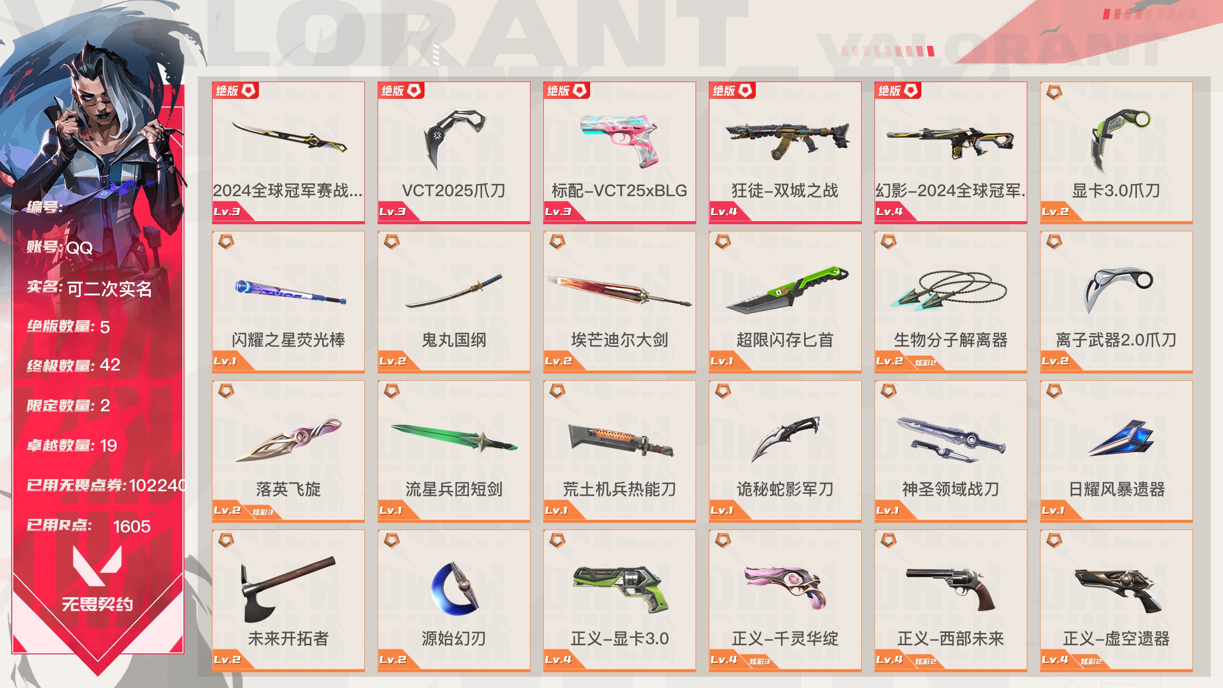 【游戏多多】 【可二次实名】【6tnj3hec1】lv277|超凡i, 刀皮数量17,呛皮数量130(绝版5限定42终极2卓越19);皮肤资产价值102240,已用r点1605;【刀皮】:近战武器-2024全球冠军赛战刀,近战武器-vct2025爪刀,近战武器-显卡3.0爪刀,近战武器-闪耀之星荧光棒,近战武器-鬼丸国纲,近战武器-埃芒迪尔大剑,近战武器-超限闪存匕首,近战武器-生物分子解离器,近战武器-离子武器2.0爪刀,近战武器-落英飞旋,近战武器-流星兵团短剑,近战武器-荒土机兵热能刀,近战武器-诡秘蛇影军刀,近战武器-神圣领域战刀,近战武器-日耀风暴遗器,近战武器-未来开拓者,近战武器-源始幻刃; 【呛皮】:标配-vct25xblg,狂徒-双城之战,幻影-2024全球冠军赛,正义-显卡3.0,正义-千灵华绽,正义-西部未来,正义-虚空遗器,判官-千灵华绽,判官-虚空遗器,狂徒-塑水宗,狂徒-机动狂飙,狂徒-光明哨兵,狂徒-偃月苍龙,狂徒-混沌序曲,狂徒-创纪元,狂徒-虚空遗器,狂徒-噬影者,幻影-千灵华绽,幻影-西部未来,幻影-虚空遗器,幻影-电音光谱,冥驹-千灵华绽,飞将-西部未来,莽侠-显卡3.0,奥丁-西部未来,狂徒-艾沃莉的梦之翼,獠犬-781-a协议,鬼魅-耀鳞威龙,正义-日冕雄师,狂怒-离子武器2.0,狂怒-般若假面2.0,骇灵-离子武器2.0,蜂刺-天界神兵,雄鹿-日冕雄师,狂徒-掠影,狂徒-日冕雄师,狂徒-离子武器2.0,狂徒-盖亚的复仇,狂徒-紫阙金琅,狂徒-海洋之星,狂徒-般若假面2.0,戍卫-天界神兵,獠犬-日冕雄师,獠犬-般若假面2.0,战神-离子武器2.0,战神-般若假面2.0,鬼魅-诡秘蛇影,骇灵-流星兵团,判官-诡秘蛇影,狂徒-诡秘蛇影,莽侠-诡秘蛇影,狂徒-荒土机兵,狂徒-超能偶像,狂徒-流星兵团,幻影-日耀风暴,幻影-神圣领域,幻影-超限闪存,戍卫-超能偶像,獠犬-神圣领域,冥驹-荒土机兵,莽侠-超限闪存,正义-日耀风暴,正义-超限闪存,鬼魅-流星兵团,标配-阿特拉斯指挥部,标配-荒土机兵,标配-超能偶像,狂怒-神圣领域,骇灵-日耀风暴,骇灵-荒土机兵,蜂刺-超限闪存,判官-超能偶像,奥丁-日耀风暴,奥丁-流星兵团,战神-神圣领域,幻影-末日之翼,幻影-纳米打击,幻影-聚合之力,戍卫-甜蜜战术,戍卫-折光棱晶,戍卫-月球哨兵,戍卫-逆冲蛮牛,戍卫-浮光跃金,戍卫-战术熊与伙伴们,獠犬-幻语魔咒,獠犬-逆冲蛮牛,獠犬-模拟赫兹,獠犬-采蜜小蜂队,冥驹-甜蜜战术,冥驹-星云暗涌,冥驹-模拟赫兹,莽侠-月球哨兵,莽侠-纤云弄巧,飞将-幻语魔咒,飞将-末日之翼,飞将-聚合之力,飞将-战术熊与伙伴们,正义-月球哨兵,正义-纳米打击,正义-纤云弄巧,鬼魅-甜蜜战术,鬼魅-星云暗涌,鬼魅-模拟赫兹,鬼魅-采蜜小蜂队,标配-折光棱晶,标配-浮光跃金,标配-战术熊与伙伴们,短炮-末日之翼,短炮-纤云弄巧,狂怒-幻语魔咒,狂怒-逆冲蛮牛,狂怒-聚合之力,狂怒-战术熊与伙伴们,骇灵-星云暗涌,骇灵-浮光跃金,蜂刺-折光棱晶,蜂刺-星云暗涌,蜂刺-聚合之力,蜂刺-纤云弄巧,判官-甜蜜战术,判官-纳米打击,判官-采蜜小蜂队,雄鹿-幻语魔咒,雄鹿-月球哨兵,雄鹿-逆冲蛮牛,雄鹿-模拟赫兹,奥丁-末日之翼,奥丁-纳米打击,战神-浮光跃金,战神-采蜜小蜂队;【热门卡面】:势不可挡幽影卡面,噬影者卡面,势不可挡零卡面,vct2025cn联赛卡面,vct2025太平洋联赛卡面,vct2025美洲联赛卡面,vct2025emea联赛卡面,西部未来卡面,势不可挡星礈卡面,vct25xblg卡面,势不可挡ko卡面,分崩离析卡面,许愿星砂卡面,双城之战拥抱卡面,vctcn首冠卡面,虹吸式咖啡壶卡面,清风徐来卡面,2024全球冠军赛卡面,rgx11zpro3.0卡面,超能偶像卡面,双城之战金克丝卡面,梦之翼露娜猫卡面,贤者之泪卡面,千灵华绽卡面,九命灵猫卡面;【热门挂饰】:飞刀挂饰,v25第三幕神话挂饰,打不烂的挂饰,神中神挂饰,双城之战魄罗挂饰,vct2025cn联赛挂饰,vct2025太平洋联赛挂饰,vct2025emea联赛挂饰,vct2025美洲联赛挂饰,科尔宾之光挂饰,809特遣队挂饰,西部未来挂饰,薰衣草之心挂饰,vctxblg挂饰,第九季神话挂饰,双城之战小蛋糕挂饰,终章ko小金人挂饰,鱼骨头挂饰,蓄势待滚挂饰,袖珍捷风挂饰,2024全球冠军赛挂饰,rgx11zpro3.0挂饰,糖葫芦挂饰,超能偶像挂饰,迷你机甲挂饰,云开见日挂饰,千灵华绽挂饰;【热门喷漆】:捷风喷漆,捷风跳peek喷漆,无人之境喷漆,继续摇滚喷漆,秘笈顺序喷漆,比心喷漆,西部未来喷漆,真烦人喷漆,幽影猫猫舞喷漆,vctxblg喷漆,进击的章鱼2喷漆,悲与喜喷漆,鼻尖上的蝴蝶喷漆,皮蛋呼呼喷漆,小丑猫喷漆,2024全球冠军赛喷漆,rgx11zpro3.0喷漆,调大音量喷漆,超能偶像喷漆,开心到爆炸喷漆,皮蛋萌舞喷漆,买装还是存钱喷漆,别挡我的路喷漆,醒狮贺春喷漆;详情看图【皮肤可能含有某些特权皮肤,具体以游戏内实际拥有为准】【qq】【可二次实名】【官方截图】