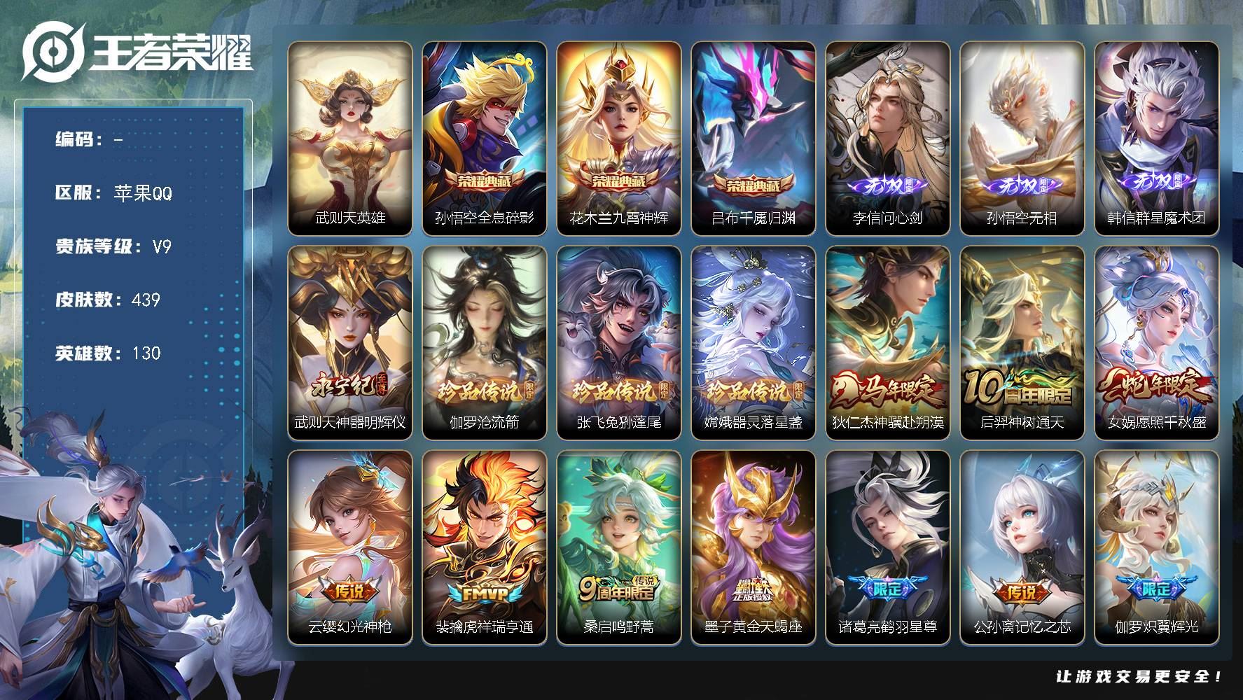 【游戏多多】 【可包人脸】苹果Q V9 至尊星耀II段位 130英雄 439皮肤 3典藏 0珍品无双 4无双 3珍品传说 35传说 128史诗大区:苹果Q,营地:2145056354,贵族等级:9,【热门皮肤】:,【限定皮肤】:女娲补天,海月海之女神,大乔微风如诗,影百相守梦,明世隐百晓客,狄仁杰神骥·赴朔漠,伽罗沧流箭,敖隐赤刃凌霄,艾琳女武神,虞姬溯影追猎,小乔线条小狗,孙尚香时之恋人,鲁班七号班班快跑,孙权径山谋武,蚩奼极光幻客,周瑜线条小狗,桑启线条小狗,项羽九幽镇关,牛魔星界战将,曹操逐霄之志,亚瑟荣光之誓,后羿神树通天,莱西奥踏浪烽翎,云中君云械蓝图,高渐离落日弦歌,周瑜百相守梦,孙策百相守梦,庄周锦麟游梦,甄姬逆浪荇歌,空空儿戏梦巡演,白起死霸装,后羿石田雨龙,姬小满小满鸭,沈梦溪鸭鸭历险记,刘禅鸭鸭历险记,雅典娜潮玩士官长,露娜命运加冕,大乔猫狗日记,干将莫邪久胜战神,李信一念神魔,张飞兔狲·蓬尾,诸葛亮鹤羽星尊,雅典娜黎明之约,阿古朵布丁狗之约,马可波罗潮玩牛仔,张良灵野札记,戈娅危途狂花,狂铁龙之律动,钟馗虚灵犬护,苏烈春野闲踪,小乔秘证寻踪,刘备浪漫序章,阿轲化蝶舞,戈娅玫蓝誓约,明世隐景韶洛都,赵怀真器灵·浮梦炉,嫦娥器灵·落星盏,裴擒虎祥瑞亨通,女娲愿照·千秋盛,少司缘灵卦秘语,达摩爆裂喵拳,姜子牙星梦巡礼,东皇太一金福满堂,太乙真人谧流熔炉,西施雪境奇遇,典韦铁骨偃魂,影魅影绮裳,苍苍林狼骑,百里守约百相守梦,老夫子百相守梦,东皇太一噬灭天穹,桑启鸣野蒿,杨玉环遇见飞天,鲁班大师乓乓大师,姜子牙天穹之誓,大乔绒语心约,周瑜熔金海岸,安琪拉魔法小厨娘,杨戬破阵·退雄兵,貂蝉长夏之忆【荣耀典藏】:武则天,吕布千魇归渊,花木兰九霄神辉,孙悟空全息碎影【截图或标题展示段位不代表实际段位,赛季更新等不可抗拒因素发生变化、时限道具不保证所剩时间,详情请看截图哦~】