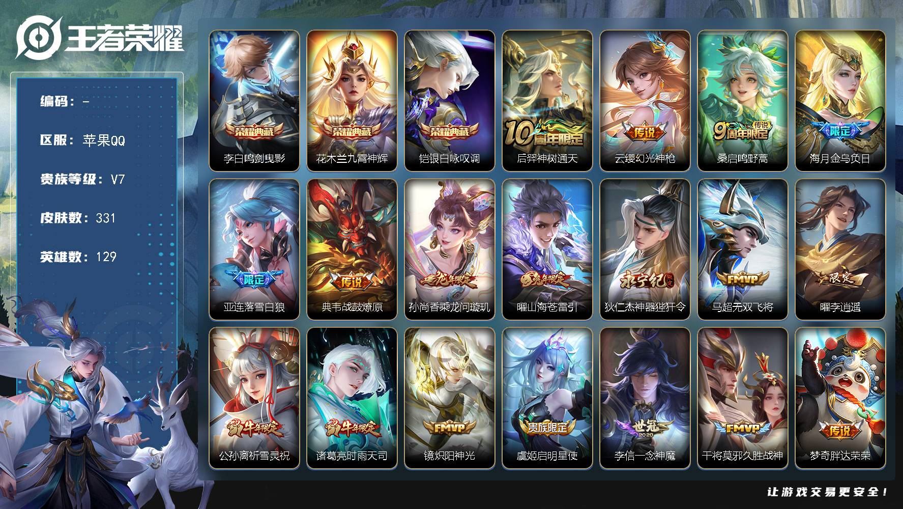 【游戏多多】 【可包人脸】苹果Q V7 永恒钻石II段位 129英雄 331皮肤 3典藏 0珍品无双 0无双 0珍品传说 23传说 101史诗大区:苹果Q,营地:1714180311,贵族等级:7,【热门皮肤】:,【限定皮肤】:雅典娜黎明之约,兰陵王雾影缉谜,干将莫邪久胜战神,弈星万物之道,鲁班七号班班快跑,周瑜线条小狗,项羽九幽镇关,蚩奼极光幻客,亚瑟荣光之誓,刘备纽约教父,曹操逐霄之志,米莱狄胡桃异想国,莱西奥光弋星穹,明世隐往忆晖光,后羿神树通天,少司缘巫礼祀神,艾琳鹤鸣心笺,杨玉环遇见飞天,孙权径山谋武,哪吒罗小黑战记,桑启青衿临川,孙悟空至尊宝,公孙离涂山容容,鬼谷子克喵,云中君云械蓝图,莱西奥踏浪烽翎,刘备汉昭烈帝,庄周锦麟游梦,甄姬逆浪荇歌,白起死霸装,后羿石田雨龙,姬小满小满鸭,露娜命运加冕,牛魔西部大镖客,狂铁龙之律动,阿古朵布丁狗之约,刘备万事如意,张良灵野札记,钟馗虚灵犬护,苏烈春野闲踪,扁鹊救世之瞳,刘备浪漫序章,阿轲化蝶舞,戈娅玫蓝誓约,明世隐景韶洛都,姜子牙星梦巡礼,百里玄策原初追逐者,太乙真人谧流熔炉,西施雪境奇遇,狂铁命运角斗场,典韦铁骨偃魂,大乔守护之力,苍苍林狼骑,牛魔星界战将,孙膑天使之翼,李白敏锐之力,干将莫邪雾都夜雨,宫本武藏未来纪元,武则天东方不败,姬小满妄想食味,桑启鸣野蒿,裴擒虎李小龙,刘禅秘密基地,东皇太一噬灭天穹,盘古敬我三分,周瑜赤莲之焰,鲁班大师乓乓大师,李元芳黑猫爱糖果,蔡文姬夏日便利店,安琪拉心灵骇客,刘邦虎啸剑宗,沈梦溪鲨炮海盗猫,大乔绒语心约,虞姬夏日便利店,姜子牙天穹之誓,周瑜熔金海岸,芈月浮光幕影,貂蝉长夏之忆,刘备异域游侠,镜青焰无极【荣耀典藏】:铠银白咏叹调,李白鸣剑·曳影,花木兰九霄神辉【截图或标题展示段位不代表实际段位,赛季更新等不可抗拒因素发生变化、时限道具不保证所剩时间,详情请看截图哦~】