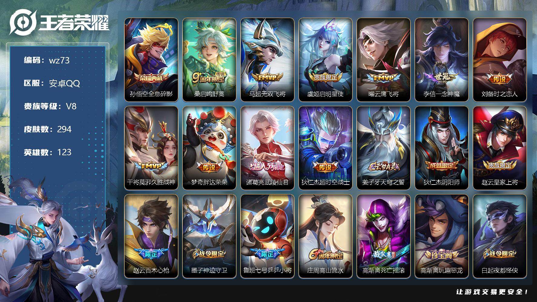 【游戏多多】 【可二次实名】【wz73】【商品标题】:安卓Q-V8-最强王者段位-123英雄-294皮肤-1典藏-0珍品无双-0无双-0珍品传说-10传说-89史诗 【荣耀典藏】:孙悟空全息碎影 【传说皮肤】:桑启鸣野蒿,马超无双飞将,虞姬启明星使,曜云鹰飞将,李信一念神魔,刘备时之恋人,干将莫邪久胜战神,梦奇胖达荣荣,诸葛亮武陵仙君,狄仁杰超时空战士 【限定皮肤】:姜子牙天穹之誓,狄仁杰阴阳师,赵云皇家上将,赵云百木心枪,墨子神迹守卫,鲁班七号乒乒小将,庄周高山流水,高渐离死亡摇滚,高渐离玩趣恶龙,白起夜都怪侠,芈月幻夜卜梦,元歌云间偶戏,狄仁杰魔术师,狄仁杰万华元夜,达摩星际陆战队,达摩沙漠行僧,项羽海滩派对,老夫子醍醐杖,老夫子航海奇遇记,程咬金演武夺筹,刘邦夺宝奇兵,韩信傲雪梅枪,王昭君午后时光,兰陵王金庭之子,亚瑟潮玩骑士王,孙悟空至尊宝,孙悟空大圣娶亲,孙悟空孙行者,后羿圣弓游侠,刘备百相守梦,李元芳云中旅人,虞姬启明星使,钟馗驱傩正仪,干将莫邪真爱魔法,雅典娜黎明之约,鬼谷子原初探秘者,鬼谷子五谷丰年,诸葛亮武陵仙君,黄忠火炮绅士,苏烈千军破阵,百里玄策原初追逐者,百里守约朱雀志,梦奇顽趣,沈梦溪大漠名商,明世隐疑决卦,明世隐吟游魔法,裴擒虎李小龙,裴擒虎擒涛扼浪,狂铁电玩高手,米莱狄胡桃异想国,云中君纤云弄巧,伽罗天狼溯光者,猪八戒猪悟能,上官婉儿梁祝,嫦娥拒霜思,鲁班大师探海日志,桑启海盐诗旅,艾琳女武神,艾琳流音漫舞,司空震地狱燃心,阿古朵江河有灵,张良古海寻踪,蒙犽百解令,蒙恬荣光圣徽,鬼谷子天穹祈灯,姬小满妄想食味,刘邦剑破天穹,程咬金群星魔术团,刘备异域游侠,周瑜熔金海岸 【年限皮肤】:百里守约朱雀志,马超神威 【赛季限定】:狄仁杰万华元夜,达摩沙漠行僧,老夫子醍醐杖,程咬金演武夺筹,兰陵王金庭之子,张良古海寻踪,李元芳云中旅人,钟馗驱傩正仪,雅典娜黎明之约,鬼谷子原初探秘者,苏烈千军破阵,百里玄策原初追逐者,梦奇顽趣,沈梦溪大漠名商,明世隐疑决卦,裴擒虎擒涛扼浪,鲁班大师探海日志,桑启海盐诗旅,鬼谷子天穹祈灯,蒙恬荣光圣徽,刘邦剑破天穹,姜子牙天穹之誓 【战令限定】:墨子神迹守卫,白起夜都怪侠,芈月幻夜卜梦,元歌云间偶戏,达摩星际陆战队,老夫子航海奇遇记,刘邦夺宝奇兵,王昭君午后时光,艾琳流音漫舞,亚瑟潮玩骑士王,后羿圣弓游侠,干将莫邪真爱魔法,黄忠火炮绅士,明世隐吟游魔法,狂铁电玩高手,米莱狄胡桃异想国,司空震地狱燃心 【史诗皮肤】:鲁班七号电玩小子,露娜紫霞仙子,阿轲暗夜猫娘,赵云皇家上将,赵云未来纪元,貂蝉圣诞恋歌,甄姬冰雪圆舞曲,王昭君偶像歌手,狄仁杰魔术师,廉颇地狱岩魂,宫本武藏鬼剑武藏,孙尚香水果甜心,嬴政暗夜贵公子,嬴政摇滚巨星,妲己魅力维加斯,妲己女仆咖啡,墨子金属风暴,吕布圣诞狂欢,刘禅绅士熊喵,曹操幽灵船长,吕布末日机甲,张飞乱世虎臣,孙悟空至尊宝,花木兰水晶猎龙者,刘邦德古拉伯爵,夏侯惇乘风破浪,小乔缤纷独角兽,兰陵王暗隐猎兽者,诸葛亮黄金分割率,亚瑟心灵战警,百里守约特工魅影,铠曙光守护者,蔡文姬舞动绿茵,刘禅天才门将,李元芳逐浪之夏,程咬金功夫厨神,白起星夜王子,阿轲节奏热浪,孙策猫狗日记,大乔猫狗日记,百里守约朱雀志,孙悟空大圣娶亲,狄仁杰鹰眼统帅,上官婉儿梁祝,娜可露露晚萤,小乔青蛇,橘右京修罗,马超神威,孙尚香时之恋人,百里玄策原初追逐者,裴擒虎李小龙,云中君纤云弄巧,元歌云间偶戏,米莱狄胡桃异想国,百里玄策热力回旋,老夫子航海奇遇记,伽罗天狼溯光者,鲁班七号乒乒小将,干将莫邪真爱魔法,孙悟空孙行者,猪八戒猪悟能,庄周高山流水,司马懿暗渊魔法,嫦娥拒霜思,黄忠火炮绅士,雅典娜黎明之约,韩信傲雪梅枪,夏洛特永昼,赵云百木心枪,澜赏金猎手,明世隐吟游魔法,狂铁电玩高手,鬼谷子五谷丰年,梦奇顽趣,刘备百相守梦,刘禅电玩爆裂旋风,司空震地狱燃心,阿古朵江河有灵,蒙犽百解令,蒙恬荣光圣徽,姬小满妄想食味,黄忠怒海争锋,孙膑茶境仙,阿轲化蝶舞,刘禅鸭鸭历险记,狂铁龙之律动,后羿石田雨龙,黄忠百相守梦,公孙离涂山容容 【其他皮肤】:项羽海滩派对,韩信教廷特使,韩信街头霸王,露娜哥特玫瑰,阿轲爱心护理,达摩大发明家,赵云忍炎影,芈月红桃皇后,艾琳女武神,程咬金星际陆战队,白起白色死神,牛魔西部大镖客,扁鹊化身博士,扁鹊救世之瞳,宫本武藏未来纪元,安琪拉玩偶对对碰,孙膑天使之翼,姜子牙时尚教父,妲己少女阿狸,典韦黄金武士,达摩拳王,花木兰兔女郎,张飞五福同心,甄姬花好人间,刘备万事如意,宫本武藏万象初新,后羿阿尔法小队,狄仁杰阴阳师,刘备纽约教父,高渐离死亡摇滚,刘备汉昭烈帝,关羽龙腾万里,墨子进击墨子号,钟无艳海滩丽影,宫本武藏霸王丸,王昭君幻想奇妙夜,狂铁命运角斗场,老夫子功夫老勺,牛魔制霸全明星,孙尚香