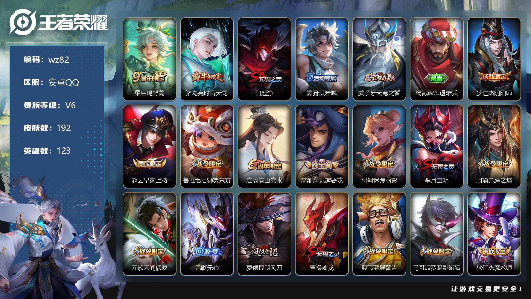 【游戏多多】 【可二次实名】【wz82】【商品标题】:安卓Q-V6-最强王者段位-123英雄-192皮肤-0典藏-0珍品无双-0无双-0珍品传说-2传说-52史诗 【传说皮肤】:桑启鸣野蒿,诸葛亮时雨天司 【限定皮肤】:白起狰,蒙犽顽岩魄,姜子牙天穹之誓,杨戬破阵退雄兵,狄仁杰阴阳师,赵云皇家上将,鲁班七号狮舞东方,庄周高山流水,高渐离玩趣恶龙,阿轲迷踪丽影,芈月重明,周瑜赤莲之焰,元歌云间偶戏,元歌无心,夏侯惇朔风刀,曹操烛龙,典韦蓝屏警告,马可波罗暗影游猎,狄仁杰魔术师,狄仁杰万华元夜,达摩沙漠行僧,项羽海滩派对,老夫子醍醐杖,程咬金演武夺筹,刘邦夺宝奇兵,兰陵王驯魔猎人,兰陵王金庭之子,亚瑟潮玩骑士王,孙悟空至尊宝,牛魔御旌,李元芳云中旅人,钟馗神迹守卫,钟馗驱傩正仪,杨玉环遇见飞天,女娲朔望之晖,干将莫邪胡桃夹子,雅典娜黎明之约,太乙真人饕餮,鬼谷子原初探秘者,鬼谷子五谷丰年,诸葛亮时雨天司,苏烈千军破阵,弈星混沌棋,沈梦溪大漠名商,明世隐疑决卦,裴擒虎李小龙,裴擒虎擒涛扼浪,狂铁御狮,米莱狄御霄,云中君纤云弄巧,盾山御銮,猪八戒西部大镖客,猪八戒猪悟能,上官婉儿梁祝,鲁班大师探海日志,桑启海盐诗旅,艾琳流音漫舞,司空震地狱燃心,阿古朵江河有灵,张良古海寻踪,鬼谷子天穹祈灯,沈梦溪龙舞盛年,刘邦剑破天穹,程咬金群星魔术团,周瑜熔金海岸 【年限皮肤】:诸葛亮时雨天司 【赛季限定】:白起狰,芈月重明,夏侯惇朔风刀,曹操烛龙,狄仁杰万华元夜,达摩沙漠行僧,老夫子醍醐杖,程咬金演武夺筹,兰陵王金庭之子,张良古海寻踪,牛魔御旌,李元芳云中旅人,钟馗驱傩正仪,雅典娜黎明之约,太乙真人饕餮,鬼谷子原初探秘者,苏烈千军破阵,弈星混沌棋,沈梦溪大漠名商,明世隐疑决卦,裴擒虎擒涛扼浪,狂铁御狮,米莱狄御霄,盾山御銮,鲁班大师探海日志,桑启海盐诗旅,鬼谷子天穹祈灯,刘邦剑破天穹,姜子牙天穹之誓 【战令限定】:鲁班七号狮舞东方,阿轲迷踪丽影,周瑜赤莲之焰,元歌云间偶戏,典韦蓝屏警告,马可波罗暗影游猎,刘邦夺宝奇兵,兰陵王驯魔猎人,艾琳流音漫舞,亚瑟潮玩骑士王,钟馗神迹守卫,女娲朔望之晖,猪八戒西部大镖客,司空震地狱燃心 【史诗皮肤】:鲁班七号电玩小子,赵云皇家上将,赵云未来纪元,貂蝉圣诞恋歌,甄姬冰雪圆舞曲,王昭君偶像歌手,狄仁杰魔术师,宫本武藏鬼剑武藏,孙尚香水果甜心,妲己魅力维加斯,妲己女仆咖啡,墨子金属风暴,吕布圣诞狂欢,李白千年之狐,张飞乱世虎臣,孙悟空至尊宝,花木兰水晶猎龙者,夏侯惇乘风破浪,小乔缤纷独角兽,兰陵王暗隐猎兽者,诸葛亮黄金分割率,亚瑟心灵战警,安琪拉心灵骇客,百里守约特工魅影,铠曙光守护者,程咬金功夫厨神,白起星夜王子,阿轲节奏热浪,杨玉环遇见飞天,典韦蓝屏警告,鲁班七号狮舞东方,狄仁杰鹰眼统帅,兰陵王驯魔猎人,上官婉儿梁祝,不知火舞魅语,阿轲迷踪丽影,马可波罗暗影游猎,裴擒虎李小龙,云中君纤云弄巧,元歌云间偶戏,猪八戒猪悟能,庄周高山流水,雅典娜黎明之约,鬼谷子五谷丰年,元歌无心,刘禅电玩爆裂旋风,司空震地狱燃心,阿古朵江河有灵,蒙犽顽岩魄,黄忠百相守梦,西施织梦人,公孙离涂山容容 【其他皮肤】:项羽海滩派对,韩信教廷特使,韩信街头霸王,露娜哥特玫瑰,阿轲爱心护理,达摩大发明家,赵云忍炎影,程咬金星际陆战队,白起白色死神,武则天东方不败,扁鹊化身博士,宫本武藏未来纪元,安琪拉玩偶对对碰,孙膑天使之翼,妲己少女阿狸,典韦黄金武士,亚瑟死亡骑士,达摩拳王,花木兰兔女郎,张飞五福同心,甄姬花好人间,刘备万事如意,宫本武藏万象初新,后羿阿尔法小队,狄仁杰阴阳师,刘备纽约教父,关羽龙腾万里,白起狰,钟无艳海滩丽影,太乙真人饕餮,曹操烛龙,芈月重明,老夫子功夫老勺,孙尚香沉稳之力,李白敏锐之力,鬼谷子幻乐之宴,狂铁御狮,苏烈坚韧之力,大乔守护之力,米莱狄御霄,明世隐虹云星官,牛魔御旌,女娲朔望之晖,钟馗神迹守卫,盾山御銮,高渐离玩趣恶龙,沈梦溪鲨炮海盗猫,夏侯惇朔风刀,周瑜赤莲之焰,弈星混沌棋,哪吒次元突破,明世隐疑决卦,刘邦夺宝奇兵,盾山圆桌骑士,老夫子醍醐杖,猪八戒西部大镖客,狂铁特工战影,鬼谷子原初探秘者,狄仁杰万华元夜,亚瑟潮玩骑士王,刘禅秘密基地,杨戬次元傲视,程咬金演武夺筹,张良缤纷绘卷,钟馗驱傩正仪,鲁班大师乓乓大师,苏烈千军破阵,干将莫邪胡桃夹子,达摩沙漠行僧,程咬金无双福将,兰陵王金庭之子,沈梦溪大漠名商,李元芳云中旅人,桑启海盐诗旅,猪八戒潮玩探月行,裴擒虎擒涛扼浪,太乙真人劲辣红锅,鲁班大师探海日志,李元芳妄想特派,艾琳流音漫舞,张良古海寻踪,钟无艳聚星闪耀,亚连破局者,鬼谷子天穹祈灯,廉颇功夫炙烤,沈梦溪龙舞盛年,刘邦剑破天穹,程咬金群星魔术团,大司命暗都幽影,杨戬破阵退雄兵,姜子牙天穹之誓,周瑜熔金海岸,盘古敬我三分,东皇太一