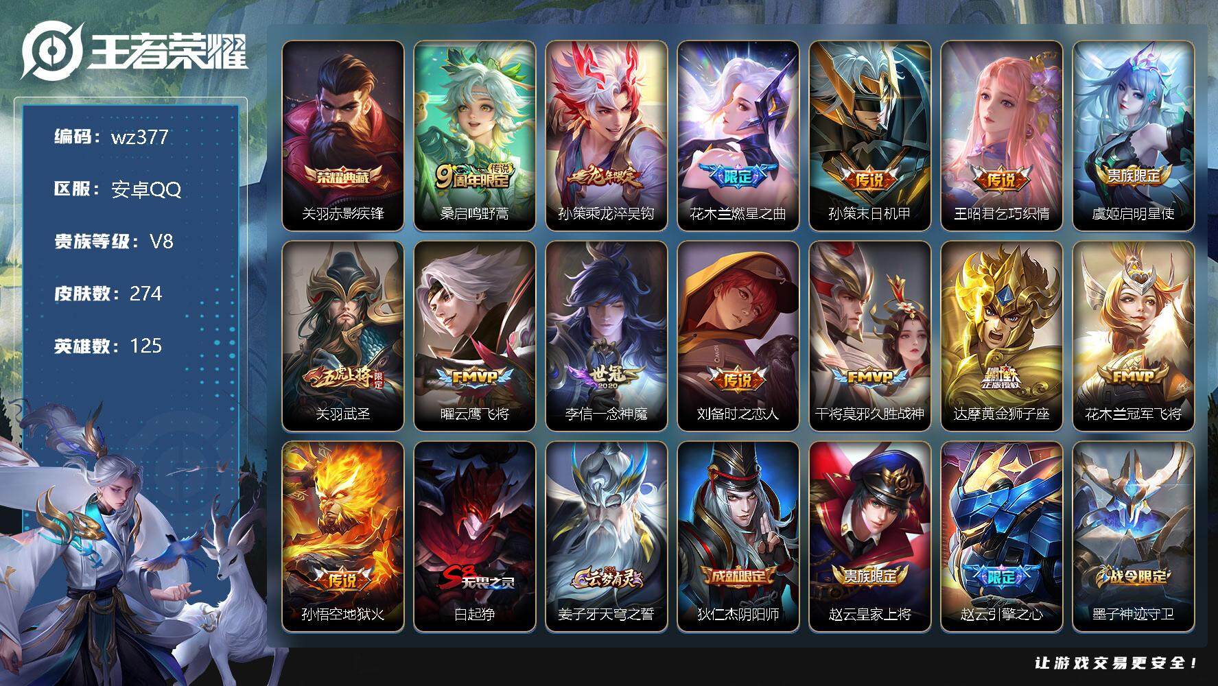 【游戏多多】 【可二次实名】【wz377】【商品标题】:安卓Q-V8-最强王者段位-125英雄-274皮肤-1典藏-0珍品无双-0无双-0珍品传说-14传说-68史诗 【荣耀典藏】:关羽赤影疾锋 【传说皮肤】:桑启鸣野蒿,孙策乘龙淬吴钩,花木兰燃星之曲,孙策末日机甲,王昭君乞巧织情,虞姬启明星使,关羽武圣,曜云鹰飞将,李信一念神魔,刘备时之恋人,干将莫邪久胜战神,达摩黄金狮子座,花木兰冠军飞将,孙悟空地狱火 【限定皮肤】:白起狰,姜子牙天穹之誓,狄仁杰阴阳师,赵云皇家上将,赵云引擎之心,墨子神迹守卫,嬴政白昼王子,孙尚香蔷薇恋人,高渐离玩趣恶龙,芈月重明,吕布猎兽之王,吕布御风骁将,夏侯惇朔风刀,曹操烛龙,典韦穷奇,狄仁杰魔术师,狄仁杰万华元夜,达摩沙漠行僧,项羽海滩派对,老夫子醍醐杖,老夫子航海奇遇记,关羽冰锋战神,关羽武圣,关羽百相守梦,程咬金演武夺筹,兰陵王金庭之子,花木兰青春决赛季,花木兰瑞麟志,花木兰默契交锋,花木兰燃星之曲,孙悟空至尊宝,牛魔御旌,李元芳云中旅人,虞姬启明星使,钟馗驱傩正仪,杨玉环遇见飞天,雅典娜黎明之约,蔡文姬繁星吟游,太乙真人饕餮,鬼谷子原初探秘者,鬼谷子五谷丰年,苏烈千军破阵,百里玄策原初追逐者,弈星混沌棋,梦奇顽趣,沈梦溪大漠名商,明世隐疑决卦,裴擒虎李小龙,裴擒虎擒涛扼浪,狂铁御狮,米莱狄御霄,盾山御銮,上官婉儿梁祝,嫦娥拒霜思,嫦娥暖冬兔眠,西施至美乘鲤谣,鲁班大师探海日志,桑启海盐诗旅,暃星界游侠,艾琳女武神,艾琳流音漫舞,司空震地狱燃心,阿古朵江河有灵,张良古海寻踪,蒙犽百解令,蒙恬荣光圣徽,鬼谷子天穹祈灯,大乔乘龙忆丹青,孙策乘龙淬吴钩,刘邦剑破天穹,周瑜熔金海岸 【年限皮肤】:花木兰瑞麟志,吕布御风骁将,关羽武圣,大乔乘龙忆丹青,孙策乘龙淬吴钩 【赛季限定】:白起狰,芈月重明,夏侯惇朔风刀,曹操烛龙,典韦穷奇,狄仁杰万华元夜,达摩沙漠行僧,老夫子醍醐杖,程咬金演武夺筹,兰陵王金庭之子,张良古海寻踪,牛魔御旌,李元芳云中旅人,钟馗驱傩正仪,雅典娜黎明之约,太乙真人饕餮,鬼谷子原初探秘者,苏烈千军破阵,百里玄策原初追逐者,弈星混沌棋,梦奇顽趣,沈梦溪大漠名商,明世隐疑决卦,裴擒虎擒涛扼浪,狂铁御狮,米莱狄御霄,盾山御銮,鲁班大师探海日志,桑启海盐诗旅,鬼谷子天穹祈灯,蒙恬荣光圣徽,刘邦剑破天穹,姜子牙天穹之誓 【战令限定】:墨子神迹守卫,嬴政白昼王子,吕布猎兽之王,老夫子航海奇遇记,艾琳流音漫舞,嫦娥暖冬兔眠,司空震地狱燃心,暃星界游侠 【史诗皮肤】:露娜紫霞仙子,赵云皇家上将,貂蝉圣诞恋歌,甄姬冰雪圆舞曲,狄仁杰魔术师,廉颇地狱岩魂,宫本武藏鬼剑武藏,孙尚香蔷薇恋人,孙尚香水果甜心,嬴政摇滚巨星,妲己魅力维加斯,妲己女仆咖啡,墨子金属风暴,刘禅绅士熊喵,曹操幽灵船长,李白千年之狐,吕布末日机甲,张飞乱世虎臣,关羽冰锋战神,孙悟空至尊宝,赵云引擎之心,花木兰水晶猎龙者,刘邦德古拉伯爵,夏侯惇乘风破浪,小乔缤纷独角兽,兰陵王暗隐猎兽者,诸葛亮黄金分割率,雅典娜冰冠公主,安琪拉心灵骇客,花木兰青春决赛季,百里守约特工魅影,铠曙光守护者,刘禅天才门将,李元芳逐浪之夏,程咬金功夫厨神,白起星夜王子,阿轲节奏热浪,杨玉环遇见飞天,嬴政白昼王子,孙策猫狗日记,花木兰瑞麟志,狄仁杰鹰眼统帅,上官婉儿梁祝,蔡文姬繁星吟游,橘右京修罗,百里玄策原初追逐者,裴擒虎李小龙,吕布御风骁将,花木兰默契交锋,老夫子航海奇遇记,杨戬天秀启明,沈梦溪月团寄思,嫦娥拒霜思,雅典娜黎明之约,澜赏金猎手,鬼谷子五谷丰年,梦奇顽趣,暃星界游侠,关羽百相守梦,司空震地狱燃心,阿古朵江河有灵,西施至美乘鲤谣,蒙犽百解令,蒙恬荣光圣徽,大乔乘龙忆丹青,牛魔星界战将,狂铁龙之律动,黄忠百相守梦 【其他皮肤】:项羽海滩派对,韩信教廷特使,韩信街头霸王,露娜哥特玫瑰,阿轲爱心护理,达摩大发明家,赵云忍炎影,芈月红桃皇后,艾琳女武神,程咬金爱与正义,白起白色死神,牛魔西部大镖客,扁鹊化身博士,宫本武藏未来纪元,安琪拉玩偶对对碰,孙膑天使之翼,妲己少女阿狸,典韦黄金武士,亚瑟死亡骑士,花木兰兔女郎,张飞五福同心,甄姬花好人间,刘备万事如意,宫本武藏万象初新,后羿阿尔法小队,狄仁杰阴阳师,刘备纽约教父,刘备汉昭烈帝,李元芳黑猫爱糖果,关羽龙腾万里,白起狰,钟无艳海滩丽影,太乙真人饕餮,宫本武藏霸王丸,曹操烛龙,王昭君幻想奇妙夜,芈月重明,狂铁命运角斗场,老夫子功夫老勺,孙尚香沉稳之力,典韦穷奇,鬼谷子幻乐之宴,狂铁御狮,苏烈坚韧之力,大乔守护之力,项羽科学大爆炸,米莱狄御霄,吕布猎兽之王,明世隐虹云星官,庄周奇妙博物学,牛魔御旌,小乔丁香结,吕布野性能量,盾山御銮,孙膑归虚梦演,高渐离玩趣恶龙,沈梦溪鲨炮海盗猫,姜子牙炽热元素使,夏侯惇朔风刀,弈星混沌棋,哪吒次元