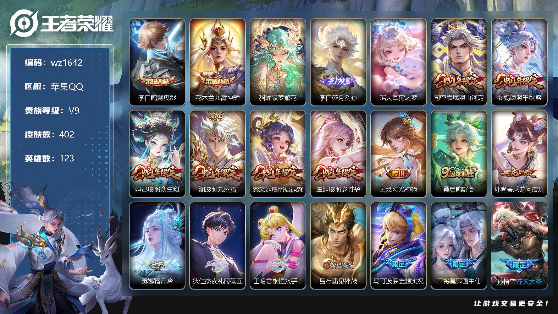 【游戏多多】 【可二次实名】【wz1642】【商品标题】:苹果Q-V9-最强王者段位-123英雄-402皮肤-2典藏-1珍品无双-1无双-1珍品传说-37传说-114史诗 【英雄全皮】:达摩全皮,刘邦全皮,李信全皮,蒙恬全皮,司空震全皮,赵怀真全皮,戈娅全皮,影全皮 【荣耀典藏】:李白鸣剑曳影,花木兰九霄神辉 【珍品无双】:貂蝉馥梦繁花 【无双皮肤】:李白碎月剑心 【珍品传说】:瑶大耳狗之梦 【传说皮肤】:司空震愿照山河定,女娲愿照千秋盛,妲己愿照众生和,澜愿照九州拓,蔡文姬愿照福禄聚,虞姬愿照岁时盈,云缨幻光神枪,桑启鸣野蒿,孙尚香乘龙问璇玑,露娜霜月吟,狄仁杰夜礼服假面,王昭君永恒水手月亮,吕布遇见神鼓,马可波罗妄想实况,干将莫邪画中仙,孙悟空齐天大圣,曜山海苍雷引,李信山海炽霜斩,马超无双飞将,赵云淬星耀世,王昭君乞巧织情,小乔音你心动,公孙离祈雪灵祝,诸葛亮时雨天司,铠绛天战甲,镜炽阳神光,虞姬启明星使,曜云鹰飞将,李信一念神魔,伽罗太华,貂蝉猫影幻舞,虞姬云霓雀翎,达摩黄金狮子座,百里玄策白虎志,貂蝉仲夏夜之梦,孙尚香末日机甲,孙悟空地狱火 【限定皮肤】:暃埋骨钱,蔡文姬夏日便利店,大乔绒语心约,虞姬夏日便利店,姜子牙天穹之誓,杨戬破阵退雄兵,狄仁杰阴阳师,赵云皇家上将,赵云百木心枪,墨子神迹守卫,孙尚香蔷薇恋人,阿轲迷踪丽影,扁鹊奇幻香踪,吕布遇见神鼓,元歌云间偶戏,元歌无心,夏侯惇朔风刀,典韦蓝屏警告,典韦岱宗,马可波罗暗影游猎,马可波罗妄想实况,狄仁杰魔术师,狄仁杰万华元夜,达摩星际陆战队,达摩沙漠行僧,项羽海滩派对,老夫子醍醐杖,老夫子航海奇遇记,程咬金演武夺筹,刘邦夺宝奇兵,韩信傲雪梅枪,王昭君午后时光,兰陵王金庭之子,花木兰青春决赛季,亚瑟潮玩骑士王,孙悟空美猴王,孙悟空至尊宝,孙悟空大圣娶亲,孙悟空齐天大圣,后羿辉光之辰,李元芳云中旅人,虞姬启明星使,钟馗驱傩正仪,杨戬潮玩骑兵,女娲朔望之晖,干将莫邪冰霜恋舞曲,干将莫邪画中仙,雅典娜单词大作战,雅典娜黎明之约,鬼谷子原初探秘者,鬼谷子五谷丰年,诸葛亮时雨天司,苏烈千军破阵,百里玄策白虎志,百里玄策原初追逐者,弈星混沌棋,公孙离祈雪灵祝,沈梦溪大漠名商,明世隐疑决卦,裴擒虎李小龙,裴擒虎擒涛扼浪,狂铁电玩高手,米莱狄胡桃异想国,瑶山海碧波行,云中君纤云弄巧,李信山海炽霜斩,伽罗太华,猪八戒西部大镖客,上官婉儿梁祝,上官婉儿天狼绘梦者,嫦娥拒霜思,嫦娥暖冬兔眠,曜山海苍雷引,西施玲珑珍味,蒙犽狂想玩偶喵,鲁班大师探海日志,镜匿光追影者,桑启海盐诗旅,暃星界游侠,戈娅驭风魔法,艾琳女武神,艾琳流音漫舞,赵怀真鹤归松栖,司空震地狱燃心,阿古朵江河有灵,张良古海寻踪,王昭君永恒水手月亮,狄仁杰夜礼服假面,蒙犽百解令,蒙恬荣光圣徽,高渐离燃音魔法,妲己灵卜魔法,鬼谷子天穹祈灯,李白碎月剑心,孙尚香乘龙问璇玑,鲁班七号蔬乡物语,李元芳蔬乡物语,刘邦剑破天穹,上官婉儿群星魔术团,程咬金群星魔术团,关羽决胜骁骑,镜青焰无极,项羽苍威无极,刘备异域游侠,周瑜熔金海岸 【年限皮肤】:百里玄策白虎志,孙悟空美猴王,后羿辉光之辰,公孙离祈雪灵祝,诸葛亮时雨天司,伽罗太华,典韦岱宗,马超神威,瑶山海碧波行,李信山海炽霜斩,曜山海苍雷引,孙尚香乘龙问璇玑 【赛季限定】:夏侯惇朔风刀,狄仁杰万华元夜,达摩沙漠行僧,老夫子醍醐杖,程咬金演武夺筹,兰陵王金庭之子,张良古海寻踪,李元芳云中旅人,钟馗驱傩正仪,雅典娜黎明之约,鬼谷子原初探秘者,苏烈千军破阵,百里玄策原初追逐者,弈星混沌棋,沈梦溪大漠名商,明世隐疑决卦,裴擒虎擒涛扼浪,鲁班大师探海日志,桑启海盐诗旅,鬼谷子天穹祈灯,蒙恬荣光圣徽,刘邦剑破天穹,姜子牙天穹之誓 【战令限定】:墨子神迹守卫,蔡文姬夏日便利店,虞姬夏日便利店,阿轲迷踪丽影,扁鹊奇幻香踪,元歌云间偶戏,典韦蓝屏警告,马可波罗暗影游猎,达摩星际陆战队,老夫子航海奇遇记,刘邦夺宝奇兵,王昭君午后时光,艾琳流音漫舞,亚瑟潮玩骑士王,杨戬潮玩骑兵,女娲朔望之晖,雅典娜单词大作战,狂铁电玩高手,米莱狄胡桃异想国,猪八戒西部大镖客,嫦娥暖冬兔眠,西施玲珑珍味,蒙犽狂想玩偶喵,司空震地狱燃心,暃星界游侠,戈娅驭风魔法,高渐离燃音魔法,妲己灵卜魔法,鲁班七号蔬乡物语,李元芳蔬乡物语,镜青焰无极,项羽苍威无极 【史诗皮肤】:鲁班七号电玩小子,项羽苍穹之光,露娜紫霞仙子,阿轲暗夜猫娘,赵云皇家上将,赵云未来纪元,貂蝉圣诞恋歌,甄姬冰雪圆舞曲,王昭君偶像歌手,狄仁杰魔术师,廉颇地狱岩魂,宫本武藏鬼剑武藏,孙尚香蔷薇恋人,孙尚香水果甜心,嬴政暗夜贵公子,嬴政摇滚巨星,妲己魅力维加斯,妲己女仆咖啡,墨子金属风暴,吕布圣诞狂欢,曹操幽灵船长,李白千年之狐,孙悟空至尊宝,花木兰水晶猎龙者,刘邦德古拉伯爵,夏侯惇乘风破浪,