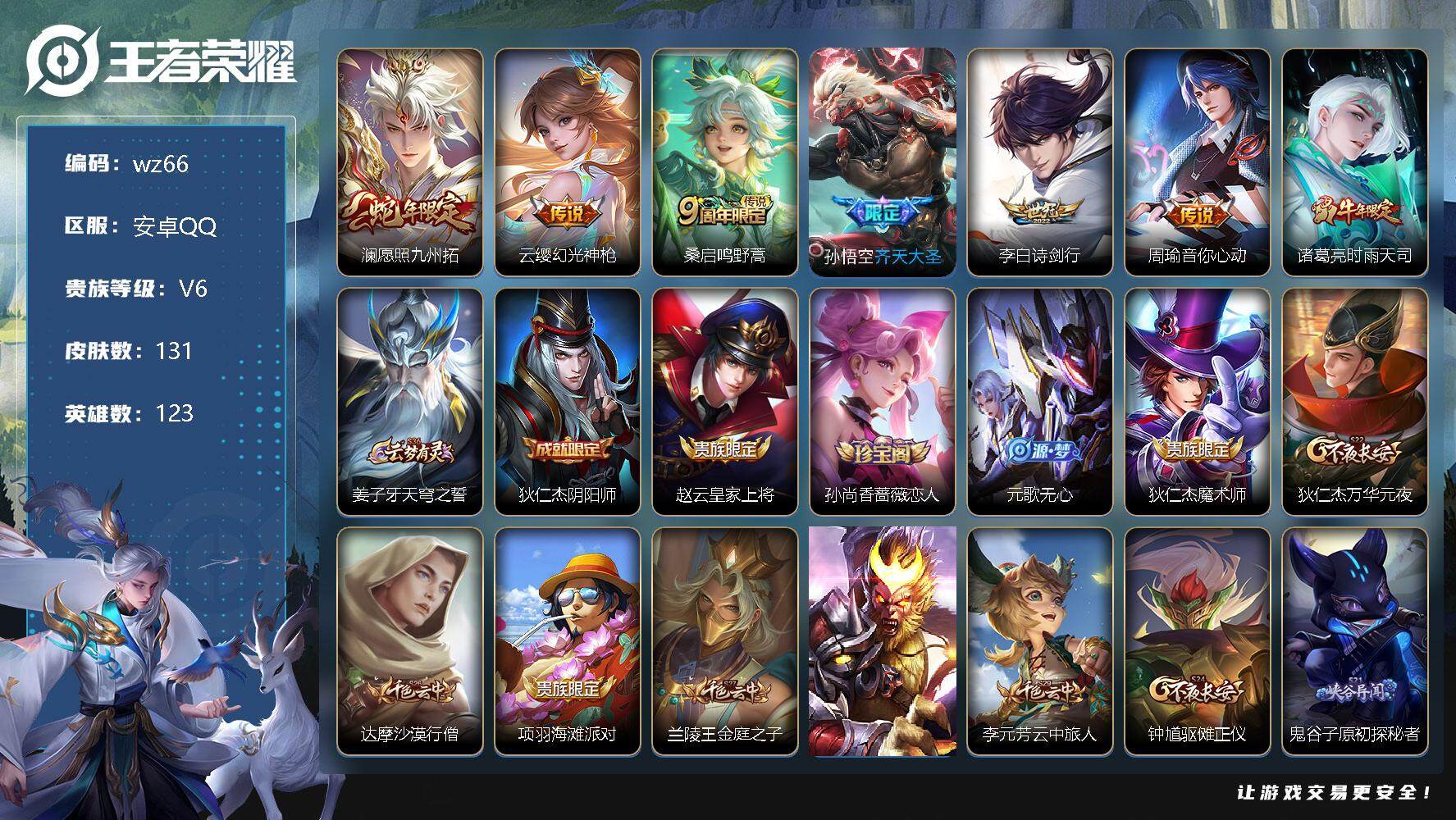 【游戏多多】 【可二次实名】【wz66】【商品标题】:安卓Q-V6-最强王者段位-123英雄-131皮肤-0典藏-0珍品无双-0无双-0珍品传说-7传说-37史诗 【传说皮肤】:澜愿照九州拓,云缨幻光神枪,桑启鸣野蒿,孙悟空齐天大圣,李白诗剑行,周瑜音你心动,诸葛亮时雨天司 【限定皮肤】:姜子牙天穹之誓,狄仁杰阴阳师,赵云皇家上将,孙尚香蔷薇恋人,元歌无心,狄仁杰魔术师,狄仁杰万华元夜,达摩沙漠行僧,项羽海滩派对,兰陵王金庭之子,孙悟空齐天大圣,李元芳云中旅人,钟馗驱傩正仪,鬼谷子原初探秘者,鬼谷子五谷丰年,诸葛亮时雨天司,百里玄策原初追逐者,沈梦溪大漠名商,明世隐疑决卦,裴擒虎李小龙,裴擒虎擒涛扼浪,鲁班大师探海日志,桑启海盐诗旅,张良古海寻踪,鬼谷子天穹祈灯,姬小满妄想食味,刘邦剑破天穹 【年限皮肤】:诸葛亮时雨天司 【赛季限定】:狄仁杰万华元夜,达摩沙漠行僧,兰陵王金庭之子,张良古海寻踪,李元芳云中旅人,钟馗驱傩正仪,鬼谷子原初探秘者,百里玄策原初追逐者,沈梦溪大漠名商,明世隐疑决卦,裴擒虎擒涛扼浪,鲁班大师探海日志,桑启海盐诗旅,鬼谷子天穹祈灯,刘邦剑破天穹,姜子牙天穹之誓 【史诗皮肤】:赵云皇家上将,赵云未来纪元,貂蝉圣诞恋歌,甄姬冰雪圆舞曲,狄仁杰魔术师,宫本武藏鬼剑武藏,孙尚香蔷薇恋人,孙尚香水果甜心,嬴政暗夜贵公子,妲己魅力维加斯,墨子龙骑士,墨子金属风暴,吕布圣诞狂欢,曹操幽灵船长,李白千年之狐,吕布末日机甲,张飞乱世虎臣,花木兰水晶猎龙者,兰陵王暗隐猎兽者,百里守约特工魅影,铠曙光守护者,李元芳逐浪之夏,白起星夜王子,阿轲节奏热浪,狄仁杰鹰眼统帅,橘右京修罗,百里玄策原初追逐者,裴擒虎李小龙,澜赏金猎手,鬼谷子五谷丰年,元歌无心,姬小满妄想食味,赵怀真器灵浮梦炉,阿轲化蝶舞,狂铁龙之律动,周瑜百相守梦,黄忠百相守梦 【其他皮肤】:项羽海滩派对,韩信教廷特使,韩信街头霸王,露娜哥特玫瑰,赵云白执事,赵云忍炎影,白起白色死神,牛魔西部大镖客,武则天东方不败,典韦黄金武士,亚瑟死亡骑士,达摩拳王,花木兰兔女郎,张飞五福同心,甄姬花好人间,刘备万事如意,宫本武藏万象初新,后羿阿尔法小队,狄仁杰阴阳师,刘备纽约教父,刘备汉昭烈帝,老夫子功夫老勺,孙尚香沉稳之力,诸葛亮掌控之力,李白敏锐之力,明世隐虹云星官,沈梦溪鲨炮海盗猫,姜子牙炽热元素使,哪吒次元突破,明世隐疑决卦,鬼谷子原初探秘者,狄仁杰万华元夜,钟馗驱傩正仪,鲁班大师乓乓大师,达摩沙漠行僧,兰陵王金庭之子,沈梦溪大漠名商,蒙恬蔚蓝守将,李元芳云中旅人,戈娅危途狂花,桑启海盐诗旅,海月幻泉雾影,猪八戒潮玩探月行,裴擒虎擒涛扼浪,太乙真人劲辣红锅,鲁班大师探海日志,姬小满零食大作战,李元芳妄想特派,张良古海寻踪,亚连破局者,鬼谷子天穹祈灯,刘邦剑破天穹,姜子牙天穹之誓,东皇太一噬灭天穹,干将莫邪雾都夜雨,苍苍林狼骑,太乙真人谧流熔炉,典韦铁骨偃魂,影魅影绮裳,姜子牙星梦巡礼,戈娅玫蓝誓约,钟馗虚灵犬护,露娜命运加冕,白起死霸装,甄姬逆浪荇歌,孙策百相守梦,莱西奥踏浪烽翎,鬼谷子克喵,兰陵王隐刃,李元芳特种部队,虞姬加勒比小姐,马可波罗激情绿茵,哪吒三太子,干将莫邪第七人偶,铠龙域领主,公孙离花间舞,元歌午夜歌剧院,孙策海之征途,司马懿魇语军师,上官婉儿修竹墨客,瑶森,曜归虚梦演,马超幸存者,澜孤猎,司空震启蛰,云缨赤焰之缨,金蝉前尘 【内测皮肤】:孙尚香蔷薇恋人 【营地ID】:1887028388