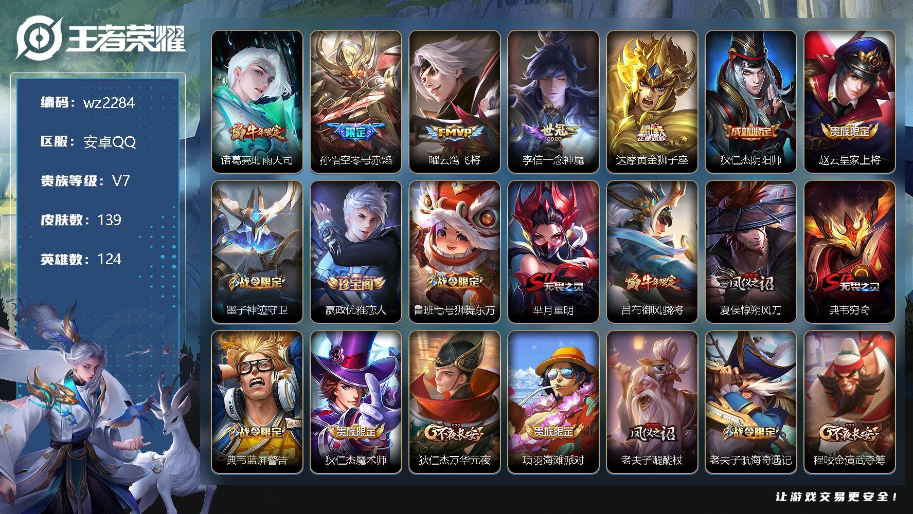 【游戏多多】 【可二次实名】【wz2284】安卓Q-V7-最强王者段位-124英雄-139皮肤-0典藏-0珍品无双-0无双-0珍品传说-5传说-30史诗 【传说皮肤】:诸葛亮时雨天司,孙悟空零号赤焰,曜云鹰飞将,李信一念神魔,达摩黄金狮子座 【限定皮肤】:狄仁杰阴阳师,赵云皇家上将,墨子神迹守卫,嬴政优雅恋人,鲁班七号狮舞东方,芈月重明,吕布御风骁将,夏侯惇朔风刀,典韦穷奇,典韦蓝屏警告,狄仁杰魔术师,狄仁杰万华元夜,项羽海滩派对,老夫子醍醐杖,老夫子航海奇遇记,程咬金演武夺筹,韩信逐梦之影,兰陵王金庭之子,孙悟空至尊宝,孙悟空零号赤焰,牛魔御旌,虞姬霸王别姬,钟馗神迹守卫,钟馗驱傩正仪,女娲朔望之晖,雅典娜单词大作战,雅典娜黎明之约,鬼谷子原初探秘者,诸葛亮时雨天司,苏烈千军破阵,弈星混沌棋,明世隐疑决卦,裴擒虎李小龙,狂铁御狮,米莱狄御霄,伽罗天狼溯光者,蒙犽狂想玩偶喵,张良古海寻踪,鬼谷子天穹祈灯 【年限皮肤】:吕布御风骁将,诸葛亮时雨天司 【赛季限定】:芈月重明,夏侯惇朔风刀,典韦穷奇,狄仁杰万华元夜,老夫子醍醐杖,程咬金演武夺筹,兰陵王金庭之子,张良古海寻踪,牛魔御旌,钟馗驱傩正仪,雅典娜黎明之约,鬼谷子原初探秘者,苏烈千军破阵,弈星混沌棋,明世隐疑决卦,狂铁御狮,米莱狄御霄,鬼谷子天穹祈灯 【战令限定】:墨子神迹守卫,鲁班七号狮舞东方,典韦蓝屏警告,老夫子航海奇遇记,钟馗神迹守卫,女娲朔望之晖,雅典娜单词大作战,蒙犽狂想玩偶喵 【史诗皮肤】:赵云皇家上将,王昭君偶像歌手,狄仁杰魔术师,宫本武藏鬼剑武藏,孙尚香水果甜心,嬴政优雅恋人,墨子龙骑士,曹操幽灵船长,张飞乱世虎臣,虞姬霸王别姬,孙悟空至尊宝,韩信逐梦之影,百里守约特工魅影,铠曙光守护者,蔡文姬舞动绿茵,白起星夜王子,典韦蓝屏警告,鲁班七号狮舞东方,狄仁杰鹰眼统帅,不知火舞魅语,橘右京修罗,蒙犽狂想玩偶喵,裴擒虎李小龙,吕布御风骁将,百里玄策热力回旋,老夫子航海奇遇记,伽罗天狼溯光者,雅典娜黎明之约,狂铁龙之律动,黄忠百相守梦 【其他皮肤】:项羽海滩派对,韩信教廷特使,韩信街头霸王,露娜哥特玫瑰,达摩大发明家,赵云白执事,赵云忍炎影,芈月红桃皇后,程咬金星际陆战队,白起白色死神,牛魔西部大镖客,扁鹊化身博士,妲己少女阿狸,典韦黄金武士,亚瑟死亡骑士,达摩拳王,花木兰兔女郎,张飞五福同心,刘备万事如意,宫本武藏万象初新,狄仁杰阴阳师,刘备汉昭烈帝,关羽龙腾万里,钟无艳海滩丽影,宫本武藏霸王丸,芈月重明,典韦穷奇,狂铁御狮,苏烈坚韧之力,项羽科学大爆炸,米莱狄御霄,明世隐虹云星官,牛魔御旌,女娲朔望之晖,吕布野性能量,钟馗神迹守卫,夏侯惇朔风刀,弈星混沌棋,哪吒次元突破,明世隐疑决卦,盾山圆桌骑士,老夫子醍醐杖,鬼谷子原初探秘者,雅典娜单词大作战,狄仁杰万华元夜,杨戬次元傲视,程咬金演武夺筹,钟馗驱傩正仪,墨子神迹守卫,鲁班大师乓乓大师,苏烈千军破阵,兰陵王金庭之子,猪八戒潮玩探月行,张良古海寻踪,鬼谷子天穹祈灯,钟馗虚灵犬护,露娜命运加冕,甄姬逆浪荇歌,莱西奥踏浪烽翎,鬼谷子克喵,哪吒罗小黑战记,鲁班七号福禄兄弟,高渐离金属狂潮,老夫子潮流仙人,王昭君精灵公主,曹操超能战警,小乔万圣前夜,孙膑未来旅行,孙悟空西部大镖客,后羿精灵王,兰陵王隐刃,钟馗地府判官,李元芳特种部队,刘邦圣殿之光,虞姬加勒比小姐,关羽天启骑士,夏侯惇战争骑士,马可波罗激情绿茵,苍维京掠夺者,杨戬埃及法老,黄忠芝加哥教父,大乔伊势巫女,东皇太一东海龙王,干将莫邪第七人偶,铠龙域领主,百里守约绝影神枪,百里玄策威尼斯狂欢,明世隐占星师,裴擒虎街头旋风,元歌午夜歌剧院,孙策海之征途,伽罗花见巫女,李信灼热之刃,上官婉儿修竹墨客,盘古创世神祝,云中君荷鲁斯之眼,曜归虚梦演,马超幸存者,蒙犽归虚梦演,镜冰刃幻境,蒙恬秩序猎龙将,司空震启蛰,云缨赤焰之缨,桑启画中游 【内测皮肤】:嬴政优雅恋人 【营地ID】:98816230