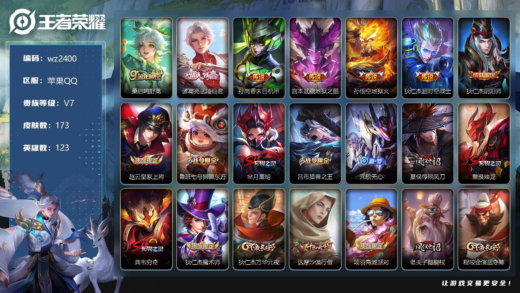 【游戏多多】 【可二次实名】【wz2400】苹果Q-V7-最强王者段位-123英雄-173皮肤-0典藏-0珍品无双-0无双-0珍品传说-6传说-39史诗 【传说皮肤】:桑启鸣野蒿,诸葛亮武陵仙君,孙尚香末日机甲,宫本武藏地狱之眼,孙悟空地狱火,狄仁杰超时空战士 【限定皮肤】:狄仁杰阴阳师,赵云皇家上将,鲁班七号狮舞东方,芈月重明,吕布猎兽之王,元歌无心,夏侯惇朔风刀,曹操烛龙,典韦穷奇,狄仁杰魔术师,狄仁杰万华元夜,达摩沙漠行僧,项羽海滩派对,老夫子醍醐杖,程咬金演武夺筹,韩信逐梦之影,韩信飞衡,孙悟空至尊宝,孙悟空大圣娶亲,牛魔御旌,李元芳云中旅人,钟馗神迹守卫,钟馗驱傩正仪,蔡文姬繁星吟游,鬼谷子原初探秘者,鬼谷子五谷丰年,诸葛亮武陵仙君,弈星混沌棋,梦奇顽趣,沈梦溪大漠名商,明世隐疑决卦,裴擒虎李小龙,裴擒虎擒涛扼浪,狂铁御狮,米莱狄御霄,云中君纤云弄巧,盾山御銮,鲁班大师探海日志,桑启海盐诗旅,艾琳女武神,张良古海寻踪,蒙恬荣光圣徽,鬼谷子天穹祈灯,刘邦剑破天穹 【年限皮肤】:韩信飞衡 【赛季限定】:芈月重明,夏侯惇朔风刀,曹操烛龙,典韦穷奇,狄仁杰万华元夜,达摩沙漠行僧,老夫子醍醐杖,程咬金演武夺筹,张良古海寻踪,牛魔御旌,李元芳云中旅人,钟馗驱傩正仪,鬼谷子原初探秘者,弈星混沌棋,梦奇顽趣,沈梦溪大漠名商,明世隐疑决卦,裴擒虎擒涛扼浪,狂铁御狮,米莱狄御霄,盾山御銮,鲁班大师探海日志,桑启海盐诗旅,鬼谷子天穹祈灯,蒙恬荣光圣徽,刘邦剑破天穹 【战令限定】:鲁班七号狮舞东方,吕布猎兽之王,钟馗神迹守卫 【史诗皮肤】:赵云皇家上将,赵云未来纪元,貂蝉圣诞恋歌,甄姬冰雪圆舞曲,狄仁杰魔术师,宫本武藏鬼剑武藏,孙尚香水果甜心,嬴政摇滚巨星,妲己魅力维加斯,墨子金属风暴,李白千年之狐,吕布末日机甲,孙悟空至尊宝,花木兰水晶猎龙者,韩信逐梦之影,夏侯惇乘风破浪,兰陵王暗隐猎兽者,雅典娜冰冠公主,安琪拉心灵骇客,铠曙光守护者,程咬金功夫厨神,白起星夜王子,孙策猫狗日记,孙悟空大圣娶亲,鲁班七号狮舞东方,狄仁杰鹰眼统帅,蔡文姬繁星吟游,韩信飞衡,橘右京修罗,裴擒虎李小龙,云中君纤云弄巧,鬼谷子五谷丰年,元歌无心,梦奇顽趣,蒙恬荣光圣徽,狂铁龙之律动,周瑜百相守梦,西施织梦人,公孙离涂山容容 【其他皮肤】:项羽海滩派对,韩信教廷特使,韩信街头霸王,露娜哥特玫瑰,阿轲爱心护理,达摩大发明家,赵云忍炎影,艾琳女武神,白起白色死神,武则天东方不败,扁鹊化身博士,妲己少女阿狸,典韦黄金武士,亚瑟死亡骑士,花木兰兔女郎,甄姬花好人间,狄仁杰阴阳师,刘备纽约教父,刘备汉昭烈帝,关羽龙腾万里,钟无艳海滩丽影,宫本武藏霸王丸,曹操烛龙,王昭君幻想奇妙夜,芈月重明,老夫子功夫老勺,孙尚香沉稳之力,典韦穷奇,诸葛亮掌控之力,鬼谷子幻乐之宴,狂铁御狮,苏烈坚韧之力,项羽科学大爆炸,米莱狄御霄,吕布猎兽之王,明世隐虹云星官,张良幽兰居士,牛魔御旌,小乔丁香结,吕布野性能量,钟馗神迹守卫,盾山御銮,孙膑归虚梦演,沈梦溪鲨炮海盗猫,姜子牙炽热元素使,夏侯惇朔风刀,弈星混沌棋,哪吒次元突破,明世隐疑决卦,盾山圆桌骑士,老夫子醍醐杖,鬼谷子原初探秘者,狄仁杰万华元夜,程咬金演武夺筹,钟馗驱傩正仪,鲁班大师乓乓大师,达摩沙漠行僧,程咬金无双福将,沈梦溪大漠名商,蒙恬蔚蓝守将,李元芳云中旅人,桑启海盐诗旅,海月幻泉雾影,猪八戒潮玩探月行,牛魔牛运亨通,裴擒虎擒涛扼浪,鲁班大师探海日志,张良古海寻踪,钟无艳聚星闪耀,鬼谷子天穹祈灯,廉颇功夫炙烤,刘邦剑破天穹,苍苍林狼骑,典韦铁骨偃魂,西施雪境奇遇,甄姬逆浪荇歌,孙策百相守梦,莱西奥踏浪烽翎,鬼谷子克喵,鲁班七号木偶奇遇记,项羽帝国元帅,露娜绯红之刃,钟无艳生化警戒,曹操死神来了,曹操超能战警,孙膑未来旅行,孙悟空西部大镖客,周瑜海军大将,后羿精灵王,兰陵王隐刃,李白范海辛,钟馗地府判官,李元芳特种部队,刘邦圣殿之光,虞姬加勒比小姐,关羽天启骑士,雅典娜战争女神,马可波罗激情绿茵,苍维京掠夺者,杨戬埃及法老,哪吒三太子,诸葛亮星航指挥官,黄忠芝加哥教父,干将莫邪第七人偶,铠龙域领主,百里守约绝影神枪,百里玄策威尼斯狂欢,梦奇美梦成真,女娲尼罗河女神,公孙离花间舞,杨玉环霓裳曲,裴擒虎街头旋风,米莱狄精准探案法,元歌午夜歌剧院,司马懿魇语军师,盾山极冰防御线,伽罗花见巫女,沈梦溪棒球奇才,李信灼热之刃,上官婉儿修竹墨客,曜归虚梦演,马超幸存者,蒙犽归虚梦演,镜冰刃幻境,澜孤猎,司空震启蛰,云缨赤焰之缨,金蝉前尘 【内测皮肤】:艾琳女武神 【营地ID】:464401739