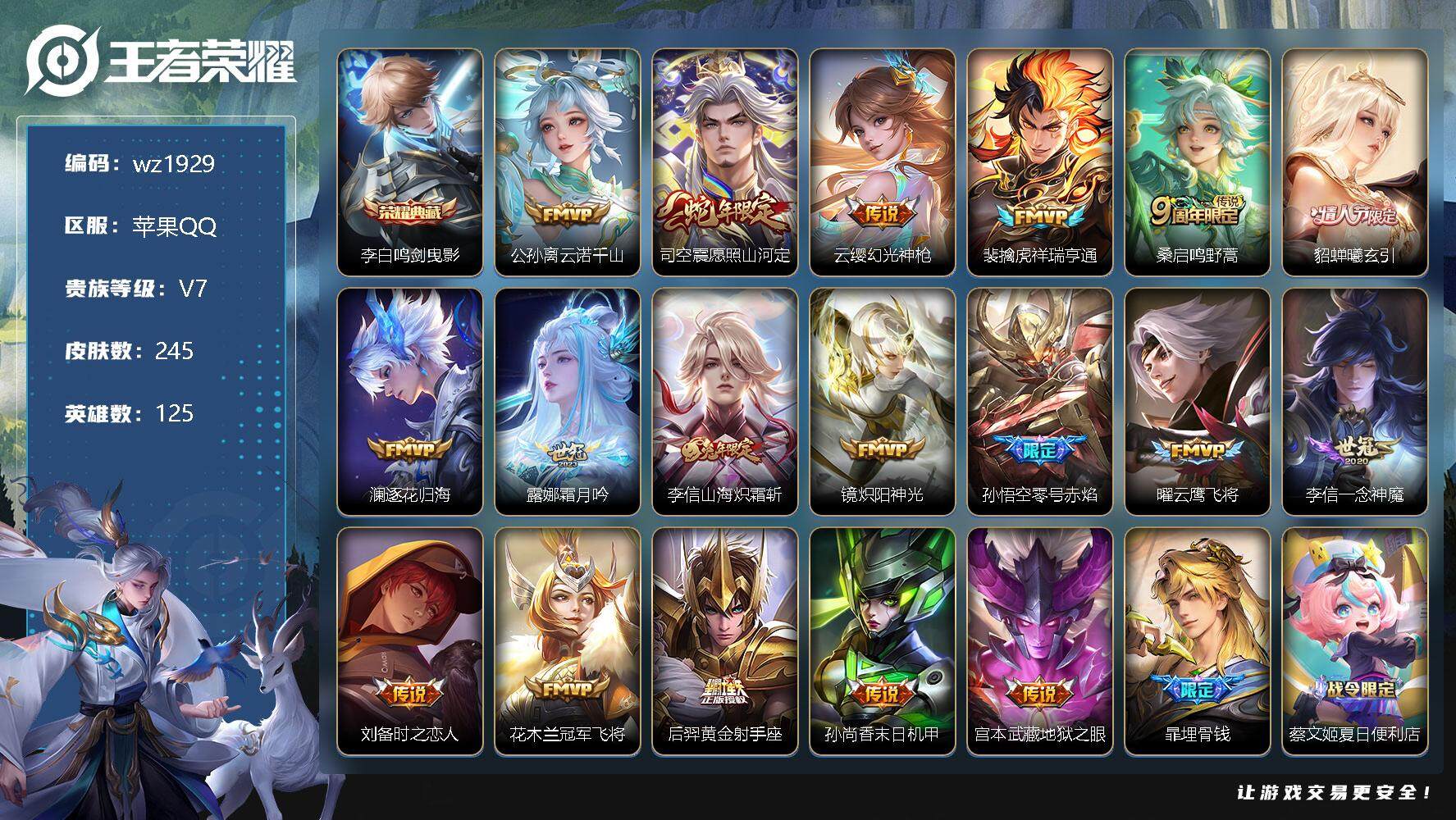 【游戏多多】 【可二次实名】【wz1929】苹果Q-V7-最强王者段位-125英雄-245皮肤-1典藏-0珍品无双-0无双-0珍品传说-18传说-74史诗 【英雄全皮】:李信全皮,蒙恬全皮,司空震全皮,空空儿全皮 【荣耀典藏】:李白鸣剑曳影 【传说皮肤】:公孙离云诺千山,司空震愿照山河定,云缨幻光神枪,裴擒虎祥瑞亨通,桑启鸣野蒿,貂蝉曦玄引,澜逐花归海,露娜霜月吟,李信山海炽霜斩,镜炽阳神光,孙悟空零号赤焰,曜云鹰飞将,李信一念神魔,刘备时之恋人,花木兰冠军飞将,后羿黄金射手座,孙尚香末日机甲,宫本武藏地狱之眼 【限定皮肤】:暃埋骨钱,蔡文姬夏日便利店,虞姬夏日便利店,姜子牙天穹之誓,狄仁杰阴阳师,廉颇寅虎御盾,赵云皇家上将,孙尚香蔷薇恋人,元歌云间偶戏,典韦岱宗,马可波罗逐梦之星,马可波罗暗影游猎,狄仁杰魔术师,狄仁杰万华元夜,达摩星际陆战队,达摩沙漠行僧,项羽海滩派对,老夫子醍醐杖,程咬金演武夺筹,露娜一生所爱,兰陵王金庭之子,亚瑟潮玩骑士王,孙悟空大圣娶亲,孙悟空零号赤焰,李元芳云中旅人,钟馗驱傩正仪,雅典娜单词大作战,雅典娜黎明之约,鬼谷子原初探秘者,鬼谷子五谷丰年,苏烈千军破阵,百里玄策原初追逐者,弈星混沌棋,梦奇顽趣,沈梦溪大漠名商,明世隐疑决卦,裴擒虎李小龙,裴擒虎擒涛扼浪,米莱狄御霄,米莱狄胡桃异想国,云中君纤云弄巧,李信山海炽霜斩,猪八戒西部大镖客,嫦娥拒霜思,蒙犽狂想玩偶喵,鲁班大师探海日志,桑启海盐诗旅,艾琳流音漫舞,司空震地狱燃心,阿古朵江河有灵,张良古海寻踪,蒙犽百解令,蒙恬荣光圣徽,高渐离燃音魔法,妲己灵卜魔法,鬼谷子天穹祈灯,姬小满妄想食味,貂蝉曦玄引,沈梦溪龙舞盛年,刘邦剑破天穹,周瑜熔金海岸 【年限皮肤】:廉颇寅虎御盾,典韦岱宗,马超神威,李信山海炽霜斩 【赛季限定】:狄仁杰万华元夜,达摩沙漠行僧,老夫子醍醐杖,程咬金演武夺筹,兰陵王金庭之子,张良古海寻踪,李元芳云中旅人,钟馗驱傩正仪,雅典娜黎明之约,鬼谷子原初探秘者,苏烈千军破阵,百里玄策原初追逐者,弈星混沌棋,梦奇顽趣,沈梦溪大漠名商,明世隐疑决卦,裴擒虎擒涛扼浪,米莱狄御霄,鲁班大师探海日志,桑启海盐诗旅,鬼谷子天穹祈灯,蒙恬荣光圣徽,刘邦剑破天穹,姜子牙天穹之誓 【战令限定】:蔡文姬夏日便利店,虞姬夏日便利店,元歌云间偶戏,马可波罗暗影游猎,达摩星际陆战队,艾琳流音漫舞,亚瑟潮玩骑士王,雅典娜单词大作战,米莱狄胡桃异想国,猪八戒西部大镖客,蒙犽狂想玩偶喵,司空震地狱燃心,高渐离燃音魔法,妲己灵卜魔法 【史诗皮肤】:露娜紫霞仙子,赵云皇家上将,赵云未来纪元,貂蝉圣诞恋歌,甄姬冰雪圆舞曲,王昭君偶像歌手,狄仁杰魔术师,廉颇地狱岩魂,宫本武藏鬼剑武藏,孙尚香蔷薇恋人,孙尚香水果甜心,嬴政暗夜贵公子,嬴政摇滚巨星,妲己魅力维加斯,妲己女仆咖啡,墨子龙骑士,墨子金属风暴,吕布圣诞狂欢,曹操幽灵船长,吕布末日机甲,张飞乱世虎臣,韩信白龙吟,花木兰水晶猎龙者,刘邦德古拉伯爵,夏侯惇乘风破浪,小乔缤纷独角兽,兰陵王暗隐猎兽者,马可波罗逐梦之星,雅典娜冰冠公主,安琪拉心灵骇客,百里守约特工魅影,铠曙光守护者,蔡文姬舞动绿茵,白起星夜王子,阿轲节奏热浪,露娜一生所爱,孙悟空大圣娶亲,伽罗箭羽风息,狄仁杰鹰眼统帅,典韦岱宗,不知火舞魅语,橘右京修罗,马超神威,马可波罗暗影游猎,蒙犽狂想玩偶喵,百里玄策原初追逐者,裴擒虎李小龙,云中君纤云弄巧,元歌云间偶戏,米莱狄胡桃异想国,杨戬天秀启明,司马懿暗渊魔法,嫦娥拒霜思,雅典娜黎明之约,廉颇寅虎御盾,鬼谷子五谷丰年,梦奇顽趣,司空震地狱燃心,阿古朵江河有灵,蒙犽百解令,妲己灵卜魔法,高渐离燃音魔法,蒙恬荣光圣徽,姬小满妄想食味,蔡文姬夏日便利店,暃埋骨钱,姬小满战舞者,百里守约百相守梦,赵怀真器灵浮梦炉,狄仁杰绮世丹青,阿轲化蝶舞,刘禅鸭鸭历险记,狂铁龙之律动,后羿石田雨龙,公孙离涂山容容 【其他皮肤】:项羽海滩派对,韩信教廷特使,韩信街头霸王,露娜哥特玫瑰,阿轲爱心护理,达摩大发明家,赵云白执事,赵云忍炎影,芈月红桃皇后,武则天东方不败,扁鹊化身博士,扁鹊救世之瞳,宫本武藏未来纪元,孙膑天使之翼,亚瑟死亡骑士,达摩拳王,花木兰兔女郎,张飞五福同心,甄姬花好人间,刘备万事如意,宫本武藏万象初新,后羿阿尔法小队,狄仁杰阴阳师,刘备纽约教父,刘备汉昭烈帝,关羽龙腾万里,钟无艳海滩丽影,老夫子功夫老勺,孙尚香沉稳之力,诸葛亮掌控之力,李白敏锐之力,鬼谷子幻乐之宴,苏烈坚韧之力,米莱狄御霄,明世隐虹云星官,小乔丁香结,吕布野性能量,孙膑归虚梦演,沈梦溪鲨炮海盗猫,姜子牙炽热元素使,弈星混沌棋,哪吒次元突破,明世隐疑决卦,盾山圆桌骑士,老夫子醍醐杖,猪八戒西部大镖客,狂铁特工战影,鬼谷子原初探秘者,雅典娜单词大作战,狄仁杰万华元夜,亚瑟潮玩骑士王
