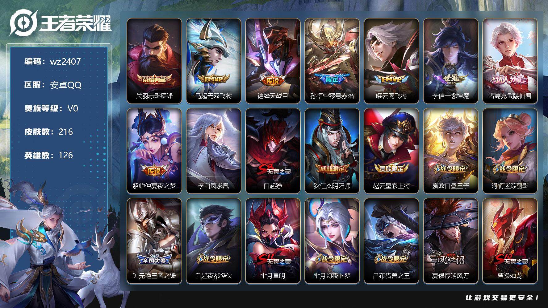 【游戏多多】 【可二次实名】【wz2407】安卓Q-V0-最强王者段位-126英雄-216皮肤-1典藏-0珍品无双-0无双-0珍品传说-8传说-56史诗 【英雄全皮】:影全皮 【荣耀典藏】:关羽赤影疾锋 【传说皮肤】:马超无双飞将,铠绛天战甲,孙悟空零号赤焰,曜云鹰飞将,李信一念神魔,诸葛亮武陵仙君,貂蝉仲夏夜之梦,李白凤求凰 【限定皮肤】:白起狰,狄仁杰阴阳师,赵云皇家上将,嬴政白昼王子,阿轲迷踪丽影,钟无艳王者之锤,白起夜都怪侠,芈月重明,芈月幻夜卜梦,吕布猎兽之王,夏侯惇朔风刀,曹操烛龙,典韦穷奇,典韦蓝屏警告,马可波罗山海玄木吟,狄仁杰魔术师,狄仁杰万华元夜,达摩沙漠行僧,项羽海滩派对,老夫子醍醐杖,程咬金演武夺筹,刘邦夺宝奇兵,韩信飞衡,王昭君午后时光,兰陵王金庭之子,孙悟空至尊宝,孙悟空大圣娶亲,孙悟空零号赤焰,孙悟空孙行者,牛魔御旌,后羿如梦令,李元芳银河之约,李元芳云中旅人,钟馗驱傩正仪,杨玉环遇见飞天,太乙真人饕餮,鬼谷子原初探秘者,鬼谷子五谷丰年,诸葛亮武陵仙君,黄忠火炮绅士,铠青龙志,苏烈千军破阵,百里玄策原初追逐者,弈星混沌棋,沈梦溪星空之诺,沈梦溪大漠名商,明世隐疑决卦,明世隐吟游魔法,裴擒虎李小龙,裴擒虎擒涛扼浪,狂铁御狮,狂铁电玩高手,米莱狄御霄,云中君纤云弄巧,盾山御銮,上官婉儿梁祝,上官婉儿天狼绘梦者,嫦娥拒霜思,嫦娥暖冬兔眠,鲁班大师探海日志,桑启海盐诗旅,暃星界游侠,艾琳女武神,张良古海寻踪,蒙犽百解令,鬼谷子天穹祈灯,刘邦剑破天穹,周瑜熔金海岸 【年限皮肤】:铠青龙志,李白凤求凰,韩信飞衡,马可波罗山海玄木吟 【赛季限定】:白起狰,芈月重明,夏侯惇朔风刀,曹操烛龙,典韦穷奇,狄仁杰万华元夜,达摩沙漠行僧,老夫子醍醐杖,程咬金演武夺筹,兰陵王金庭之子,张良古海寻踪,牛魔御旌,李元芳云中旅人,钟馗驱傩正仪,太乙真人饕餮,鬼谷子原初探秘者,苏烈千军破阵,百里玄策原初追逐者,弈星混沌棋,沈梦溪大漠名商,明世隐疑决卦,裴擒虎擒涛扼浪,狂铁御狮,米莱狄御霄,盾山御銮,鲁班大师探海日志,桑启海盐诗旅,鬼谷子天穹祈灯,刘邦剑破天穹 【战令限定】:嬴政白昼王子,阿轲迷踪丽影,白起夜都怪侠,芈月幻夜卜梦,吕布猎兽之王,典韦蓝屏警告,刘邦夺宝奇兵,王昭君午后时光,李元芳银河之约,黄忠火炮绅士,沈梦溪星空之诺,明世隐吟游魔法,狂铁电玩高手,嫦娥暖冬兔眠,暃星界游侠 【史诗皮肤】:阿轲暗夜猫娘,钟无艳王者之锤,赵云皇家上将,赵云未来纪元,貂蝉圣诞恋歌,王昭君偶像歌手,狄仁杰魔术师,宫本武藏鬼剑武藏,孙尚香水果甜心,妲己魅力维加斯,妲己女仆咖啡,墨子金属风暴,吕布末日机甲,张飞乱世虎臣,孙悟空至尊宝,花木兰水晶猎龙者,刘邦德古拉伯爵,夏侯惇乘风破浪,小乔缤纷独角兽,兰陵王暗隐猎兽者,亚瑟心灵战警,百里守约特工魅影,蔡文姬舞动绿茵,程咬金功夫厨神,白起星夜王子,杨玉环遇见飞天,嬴政白昼王子,孙策猫狗日记,铠青龙志,孙悟空大圣娶亲,典韦蓝屏警告,狄仁杰鹰眼统帅,上官婉儿梁祝,李元芳银河之约,韩信飞衡,后羿如梦令,阿轲迷踪丽影,橘右京修罗,孙尚香时之恋人,上官婉儿天狼绘梦者,百里玄策原初追逐者,裴擒虎李小龙,云中君纤云弄巧,孙悟空孙行者,嫦娥拒霜思,黄忠火炮绅士,夏洛特永昼,澜赏金猎手,明世隐吟游魔法,狂铁电玩高手,鬼谷子五谷丰年,暃星界游侠,马可波罗山海玄木吟,蒙犽百解令,百里守约百相守梦,公孙离涂山容容 【其他皮肤】:项羽海滩派对,韩信教廷特使,韩信街头霸王,露娜哥特玫瑰,阿轲致命风华,达摩大发明家,赵云忍炎影,艾琳女武神,白起白色死神,牛魔西部大镖客,扁鹊化身博士,安琪拉玩偶对对碰,妲己少女阿狸,亚瑟死亡骑士,达摩拳王,花木兰兔女郎,张飞五福同心,甄姬花好人间,刘备万事如意,宫本武藏万象初新,后羿阿尔法小队,狄仁杰阴阳师,刘备纽约教父,刘备汉昭烈帝,关羽龙腾万里,墨子进击墨子号,白起狰,钟无艳海滩丽影,太乙真人饕餮,宫本武藏霸王丸,曹操烛龙,王昭君幻想奇妙夜,芈月重明,老夫子功夫老勺,孙尚香沉稳之力,典韦穷奇,诸葛亮掌控之力,鬼谷子幻乐之宴,狂铁御狮,安琪拉如懿,苏烈坚韧之力,大乔守护之力,米莱狄御霄,吕布猎兽之王,明世隐虹云星官,张良幽兰居士,庄周奇妙博物学,牛魔御旌,小乔丁香结,吕布野性能量,盾山御銮,沈梦溪鲨炮海盗猫,姜子牙炽热元素使,夏侯惇朔风刀,沈梦溪星空之诺,弈星混沌棋,哪吒次元突破,明世隐疑决卦,刘邦夺宝奇兵,盾山圆桌骑士,老夫子醍醐杖,鬼谷子原初探秘者,狄仁杰万华元夜,刘禅秘密基地,程咬金演武夺筹,张良缤纷绘卷,盘古重装意志,钟馗驱傩正仪,鲁班大师乓乓大师,苏烈千军破阵,达摩沙漠行僧,芈月幻夜卜梦,程咬金无双福将,白起夜都怪侠,兰陵王金庭之子,刘禅唤灵魔甲,王昭君午后时光,沈梦溪大漠名商,蒙恬蔚蓝守将,李元芳云中旅人,桑启