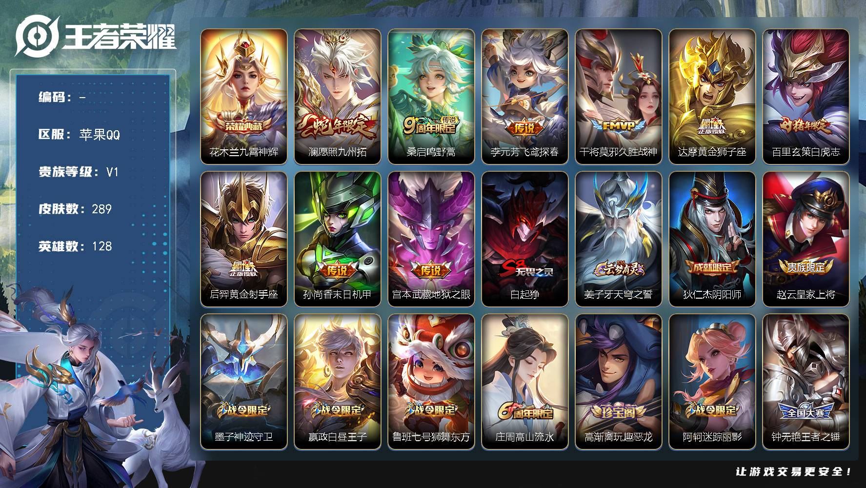【游戏多多】 【可包人脸】苹果Q V1 最强王者段位 128英雄 289皮肤 1典藏 0珍品无双 0无双 0珍品传说 9传说 83史诗大区:苹果Q,营地:231224672,贵族等级:1,【热门皮肤】:,【限定皮肤】:影百相守梦,蚩奼极光幻客,项羽九幽镇关,钟馗锁墨魂,兰陵王雾影缉谜,牛魔西部大镖客,甄姬花好人间,周瑜线条小狗,刘禅唤灵魔甲,云中君云械蓝图,艾琳鹤鸣心笺,公孙离涂山容容,周瑜熔金海岸,莱西奥西部游侠,大司命暗都幽影,海诺心动手记,李元芳妄想特派,镜青焰无极,项羽苍威无极,公孙离玉兔公主,程咬金群星魔术团,花木兰兔女郎,赵云白执事,刘邦剑破天穹,钟无艳春野之旅,沈梦溪龙舞盛年,狂铁特工战影,亚瑟心灵战警,芈月红桃皇后,关羽龙腾万里,朵莉亚金色潮汐,廉颇功夫炙烤,伽罗琥珀纪元,嫦娥漠中幻影,高渐离燃音魔法,海诺时空谍影,妲己灵卜魔法,鬼谷子天穹祈灯,太乙真人劲辣红锅,后羿完美运算,司空震地狱燃心,艾琳流音漫舞,阿古朵江河有灵,猪八戒潮玩探月行,亚连破局者,张良古海寻踪,钟无艳聚星闪耀,西施玲珑珍味,吕布野性能量,哪吒热血海滩,鲁班大师探海日志,孙策猫狗日记,李元芳云中旅人,程咬金无双福将,姜子牙炽热元素使,老夫子航海奇遇记,墨子神迹守卫,鲁班大师乓乓大师,姜子牙时尚教父,高渐离玩趣恶龙,韩信逐梦之影,钟馗驱傩正仪,孙膑归虚梦演,达摩星际陆战队,米莱狄胡桃异想国,苏烈坚韧之力,张良缤纷绘卷,程咬金演武夺筹,刘禅秘密基地,大乔守护之力,露娜瓷语鉴心,元歌云间偶戏,刘备汉昭烈帝,干将莫邪冰霜恋舞曲,亚瑟潮玩骑士王,杨戬次元傲视,狄仁杰万华元夜,鬼谷子幻乐之宴,安琪拉心灵骇客,云中君纤云弄巧【荣耀典藏】:花木兰九霄神辉【截图或标题展示段位不代表实际段位,赛季更新等不可抗拒因素发生变化、时限道具不保证所剩时间,详情请看截图哦~】