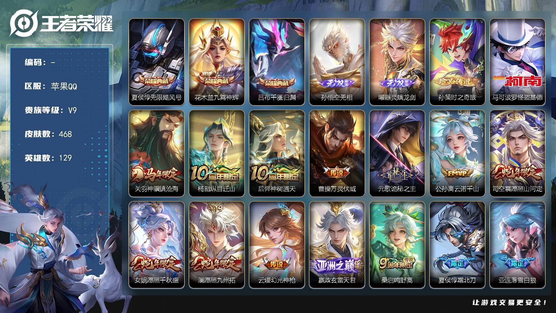 【游戏多多】 【可包人脸】苹果Q V9 最强王者段位 129英雄 468皮肤 3典藏 0珍品无双 2无双 2珍品传说 44传说 154史诗大区:苹果Q,营地:215629652,贵族等级:9,【热门皮肤】:,【限定皮肤】:海月海之女神,雅典娜执弈定局,影百相守梦,东皇太一灼幽烈阳,明世隐百晓客,钟馗锁墨魂,敖隐赤刃凌霄,关羽神骥·镇沧海,吕布舞狮寰,兰陵王雾影缉谜,鬼谷子谜偶窥秘,妲己灵卜魔法,虞姬溯影追猎,鲁班七号班班快跑,芈月浮光幕影,曜山海·苍雷引,妲己线条小狗,镜炽阳神光,小乔线条小狗,桑启线条小狗,周瑜线条小狗,项羽九幽镇关,兰陵王傩神司,明世隐往忆晖光,莱西奥光弋星穹,蚩奼极光幻客,亚连破局者,百里玄策罗小黑战记,曹操逐霄之志,杨戬纵目迁山,少司缘巫礼祀神,后羿神树通天,艾琳鹤鸣心笺,桑启鸣野蒿,孙权径山谋武,张良罗小黑战记,亚瑟荣光之誓,公孙离云诺千山,哪吒罗小黑战记,元歌诡秘之主,公孙离涂山容容,莱西奥踏浪烽翎,甄姬逆浪荇歌,云中君云械蓝图,庄周锦麟游梦,亚连落雪白狼,空空儿戏梦巡演,白起死霸装,老夫子圣诞老人,沈梦溪鸭鸭历险记,刘禅鸭鸭历险记,海诺时空谍影,后羿石田雨龙,姬小满小满鸭,狂铁龙之律动,牛魔星界战将,钟馗虚灵犬护,阿轲爱心护理,朵莉亚金色潮汐,扁鹊救世之瞳,高渐离燃音魔法,孙膑茶境仙,马超访茗客,上官婉儿妄想奇谈,刘备百相守梦,赵怀真器灵·浮梦炉,牛魔西部大镖客,少司缘灵卦秘语,达摩爆裂喵拳,女娲愿照·千秋盛,司空震愿照·山河定,澜愿照·九州拓,姬小满妄想食味,姜子牙星梦巡礼,西施雪境奇遇,吕布怒海麟威,夏洛特浮生妄,孙策时之奇旅,典韦铁骨偃魂,太乙真人谧流熔炉【荣耀典藏】:吕布千魇归渊,花木兰九霄神辉,夏侯惇无限飓风号【截图或标题展示段位不代表实际段位,赛季更新等不可抗拒因素发生变化、时限道具不保证所剩时间,详情请看截图哦~】