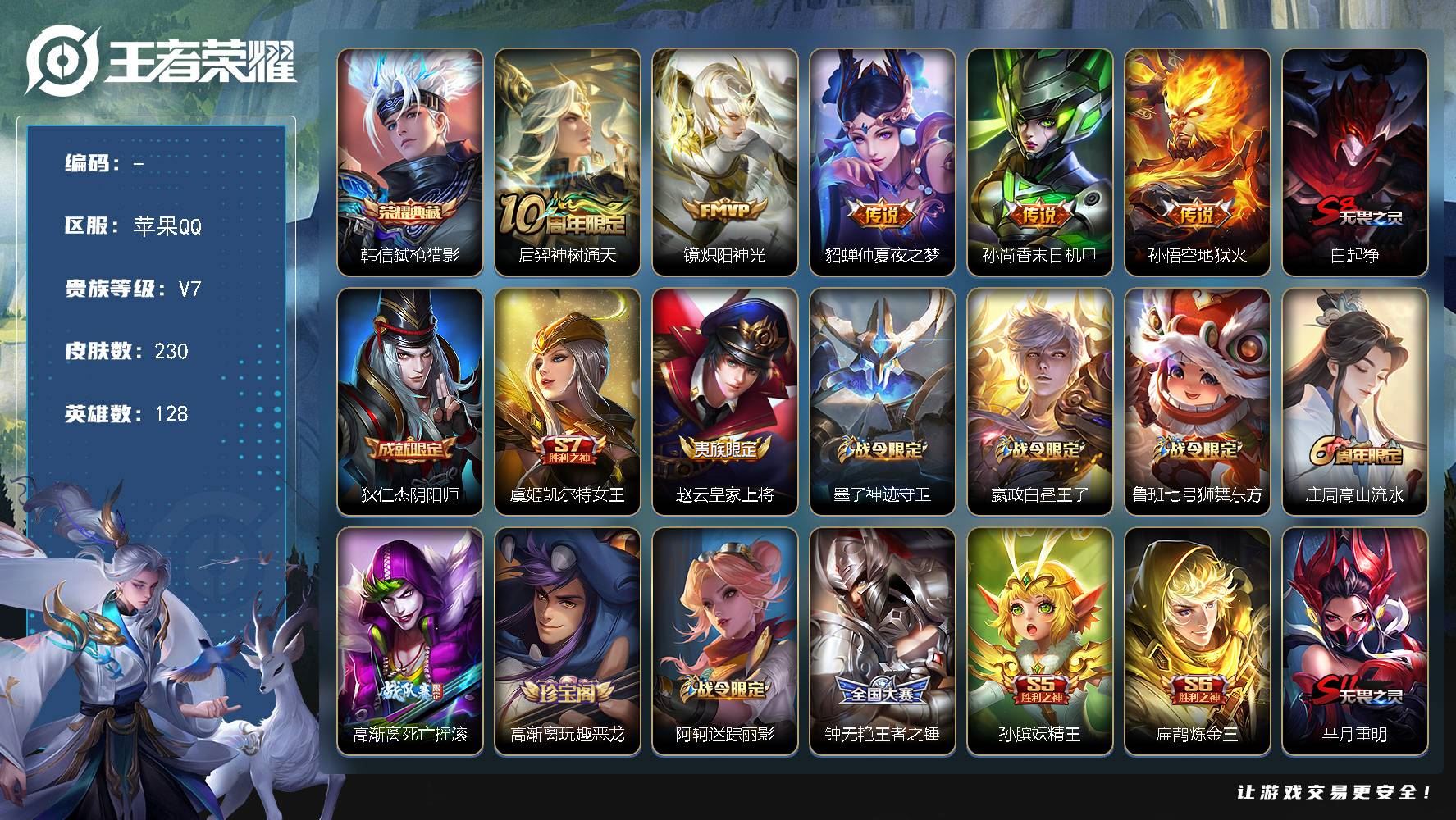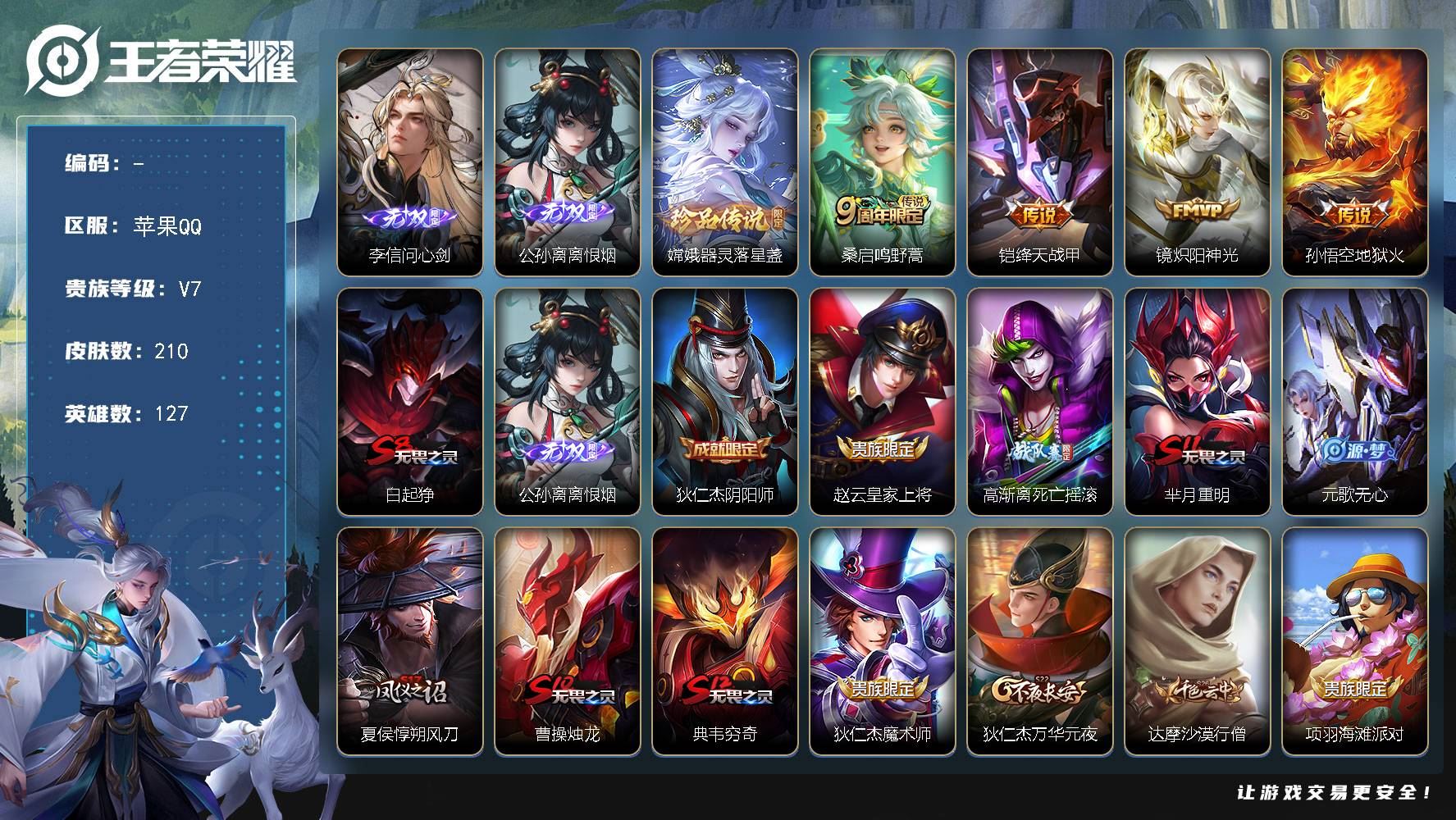 【游戏多多】 【可包人脸】苹果Q V7 最强王者段位 127英雄 210皮肤 0典藏 0珍品无双 2无双 1珍品传说 4传说 49史诗大区:苹果Q,营地:447808416,贵族等级:7,【热门皮肤】:,【限定皮肤】:嫦娥器灵·落星盏,张飞五福同心,镜炽阳神光,狄仁杰魔术师,敖隐赤刃凌霄,兰陵王雾影缉谜,亚连破局者,周瑜线条小狗,项羽九幽镇关,虞姬溯影追猎,沈梦溪龙舞盛年,赵云皇家上将,曹操逐霄之志,亚瑟心灵战警,达摩拳王,艾琳鹤鸣心笺,女娲万灵启世,亚瑟荣光之誓,孙权径山谋武,海诺时空谍影,哪吒罗小黑战记,公孙离涂山容容,莱西奥踏浪烽翎,甄姬逆浪荇歌,艾琳女武神,花木兰兔女郎,宫本武藏万象初新,雅典娜潮玩士官长,李白敏锐之力,梦奇顽趣,桑启海盐诗旅,关羽龙腾万里,元歌无心,兰陵王金庭之子,诸葛亮掌控之力,刘备汉昭烈帝,达摩沙漠行僧,苏烈千军破阵,盾山圆桌骑士,百里玄策原初追逐者,达摩大发明家,鬼谷子幻乐之宴,鲁班大师乓乓大师,钟馗驱傩正仪,苏烈坚韧之力,张良缤纷绘卷,刘禅秘密基地,程咬金演武夺筹,貂蝉圣诞恋歌,狄仁杰万华元夜,云中君纤云弄巧,项羽海滩派对,蒙犽狂想玩偶喵,项羽科学大爆炸,雅典娜单词大作战,裴擒虎李小龙,明世隐虹云星官,鬼谷子原初探秘者,老夫子醍醐杖,赵云忍·炎影,明世隐疑决卦,高渐离死亡摇滚,鲁班七号黑桃队长,哪吒次元突破,弈星混沌棋,露娜哥特玫瑰,上官婉儿梁祝,夏侯惇朔风刀,姜子牙炽热元素使,孙膑归虚梦演,沈梦溪鲨炮海盗猫,甄姬花好人间,盾山御銮,牛魔御旌,白起白色死神,米莱狄御霄,狂铁御狮,典韦穷奇,芈月重明,老夫子功夫老勺【荣耀典藏】:【截图或标题展示段位不代表实际段位,赛季更新等不可抗拒因素发生变化、时限道具不保证所剩时间,详情请看截图哦~】