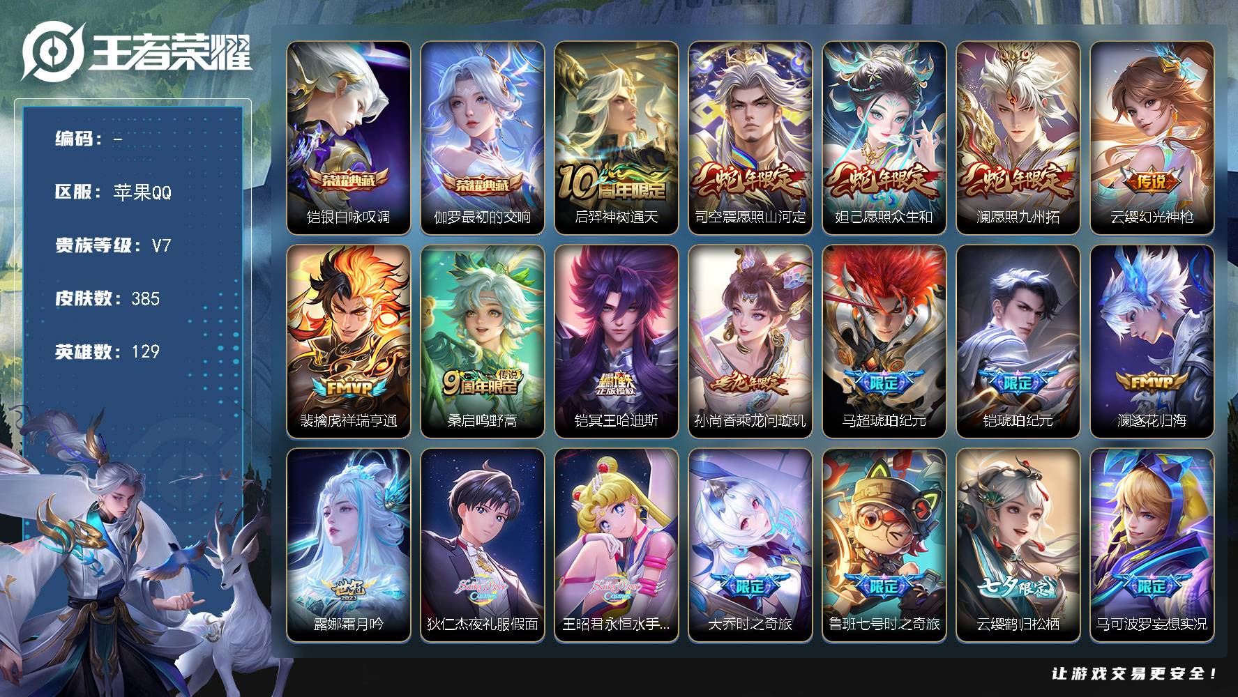 【游戏多多】 【可包人脸】苹果Q V7 永恒钻石II段位 129英雄 385皮肤 2典藏 0珍品无双 0无双 0珍品传说 58传说 114史诗大区:苹果Q,营地:1885051695,贵族等级:7,【热门皮肤】:,【限定皮肤】:影百相守梦,敖隐赤刃凌霄,高渐离玩趣恶龙,干将莫邪久胜战神,兰陵王雾影缉谜,鲁班七号班班快跑,牛魔牛运亨通,妲己线条小狗,周瑜线条小狗,项羽九幽镇关,虞姬溯影追猎,影魅影绮裳,孙权径山谋武,蒙恬苍云破阵,程咬金星际陆战队,安琪拉糖果风暴,蒙恬荣光圣徽,蚩奼极光幻客,百里玄策罗小黑战记,狂铁龙之律动,露娜紫霞仙子,蔡文姬夏日便利店,明世隐往忆晖光,莱西奥光弋星穹,曹操逐霄之志,后羿神树通天,云中君云械蓝图,马超琥珀纪元,艾琳鹤鸣心笺,女娲万灵启世,亚瑟荣光之誓,哪吒罗小黑战记,妲己紫罗兰之誓,关羽龙腾万里,莱西奥踏浪烽翎,安琪拉玩偶对对碰,庄周锦麟游梦,甄姬逆浪荇歌,空空儿戏梦巡演,钟馗虚灵犬护,白起死霸装,后羿石田雨龙,姬小满小满鸭,露娜命运加冕,张飞五福同心,甄姬花好人间,阿古朵布丁狗之约,宫本武藏万象初新,张良灵野札记,姜子牙星梦巡礼,刘备浪漫序章,廉颇无尽征程,戈娅玫蓝誓约,阿轲化蝶舞,明世隐景韶洛都,马可波罗暗影游猎,马超访茗客,孙膑茶境仙,妲己愿照·众生和,牛魔星界战将,司空震愿照·山河定,达摩爆裂喵拳,少司缘灵卦秘语,赵怀真器灵·浮梦炉,弈星万物之道,澜愿照·九州拓,大乔猫狗日记,东皇太一金福满堂,裴擒虎祥瑞亨通,西施雪境奇遇,哪吒逐梦之翼,典韦铁骨偃魂,苏烈坚韧之力,太乙真人谧流熔炉,苍苍林狼骑,高渐离死亡摇滚,露娜哥特玫瑰,干将莫邪雾都夜雨,百里玄策原初追逐者,吕布逐霄战戟【荣耀典藏】:伽罗最初的交响,铠银白咏叹调【截图或标题展示段位不代表实际段位,赛季更新等不可抗拒因素发生变化、时限道具不保证所剩时间,详情请看截图哦~】