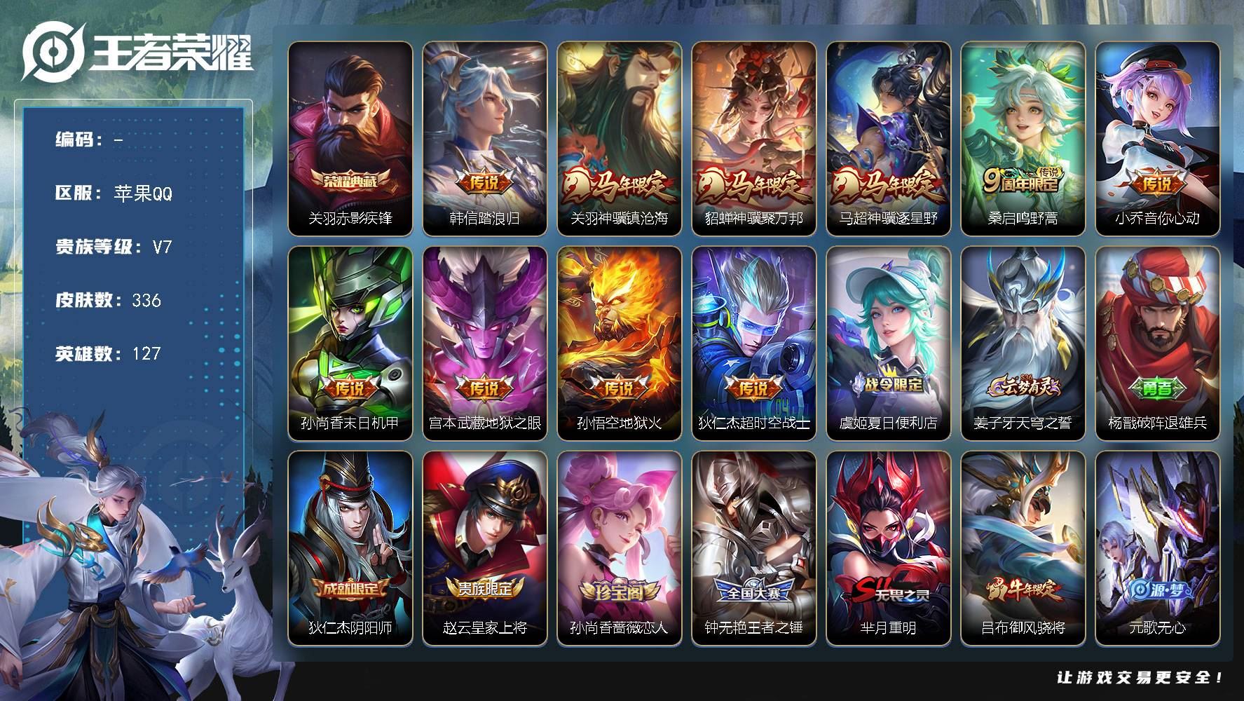 【游戏多多】 【可包人脸】苹果Q V7 至尊星耀III段位 127英雄 336皮肤 1典藏 0珍品无双 0无双 0珍品传说 10传说 74史诗大区:苹果Q,营地:534482337,贵族等级:7,【热门皮肤】:,【限定皮肤】:空空儿戏梦巡演,海月海之女神,老夫子藏狐·褐绒,影百相守梦,少司缘灵卦秘语,影魅影绮裳,明世隐百晓客,貂蝉神骥·聚万邦,关羽神骥·镇沧海,马超神骥·逐星野,鲁班七号班班快跑,吕布舞狮寰,干将莫邪胡桃夹子,兰陵王雾影缉谜,孙权径山谋武,小乔线条小狗,鬼谷子谜偶窥秘,海诺时空谍影,元歌无心,蚩奼极光幻客,百里玄策原初追逐者,周瑜线条小狗,虞姬溯影追猎,安琪拉糖果风暴,西施雪境奇遇,程咬金星际陆战队,亚连破局者,莱西奥西部游侠,扁鹊救世之瞳,艾琳鹤鸣心笺,刘备万事如意,女娲万灵启世,张良罗小黑战记,赵怀真太极少年,亚瑟荣光之誓,明世隐往忆晖光,虞姬夏日便利店,莱西奥光弋星穹,妲己紫罗兰之誓,哪吒罗小黑战记,亚瑟潮玩骑士王,桑启青衿临川,周瑜百相守梦,孙策百相守梦,朵莉亚金色潮汐,海月幻泉雾影,鬼谷子克喵,莱西奥踏浪烽翎,盘古重装意志,典韦铁甲之心,云中君云械蓝图,高渐离落日弦歌,庄周锦麟游梦,甄姬逆浪荇歌,白起死霸装,姬小满小满鸭,露娜命运加冕,雅典娜潮玩士官长,上官婉儿神器·万象笔,关羽百相守梦,马可波罗潮玩牛仔,阿古朵布丁狗之约,狂铁龙之律动,戈娅危途狂花,小乔音你心动,张良灵野札记,赵云白执事,苏烈春野闲踪,钟馗虚灵犬护,小乔秘证寻踪,戈娅玫蓝誓约,宫本武藏万象初新,艾琳女武神,姜子牙星梦巡礼,安琪拉心灵骇客,苍苍林狼骑,典韦黄金武士,露娜哥特玫瑰,干将莫邪雾都夜雨,后羿阿尔法小队【荣耀典藏】:关羽赤影疾锋【截图或标题展示段位不代表实际段位,赛季更新等不可抗拒因素发生变化、时限道具不保证所剩时间,详情请看截图哦~】