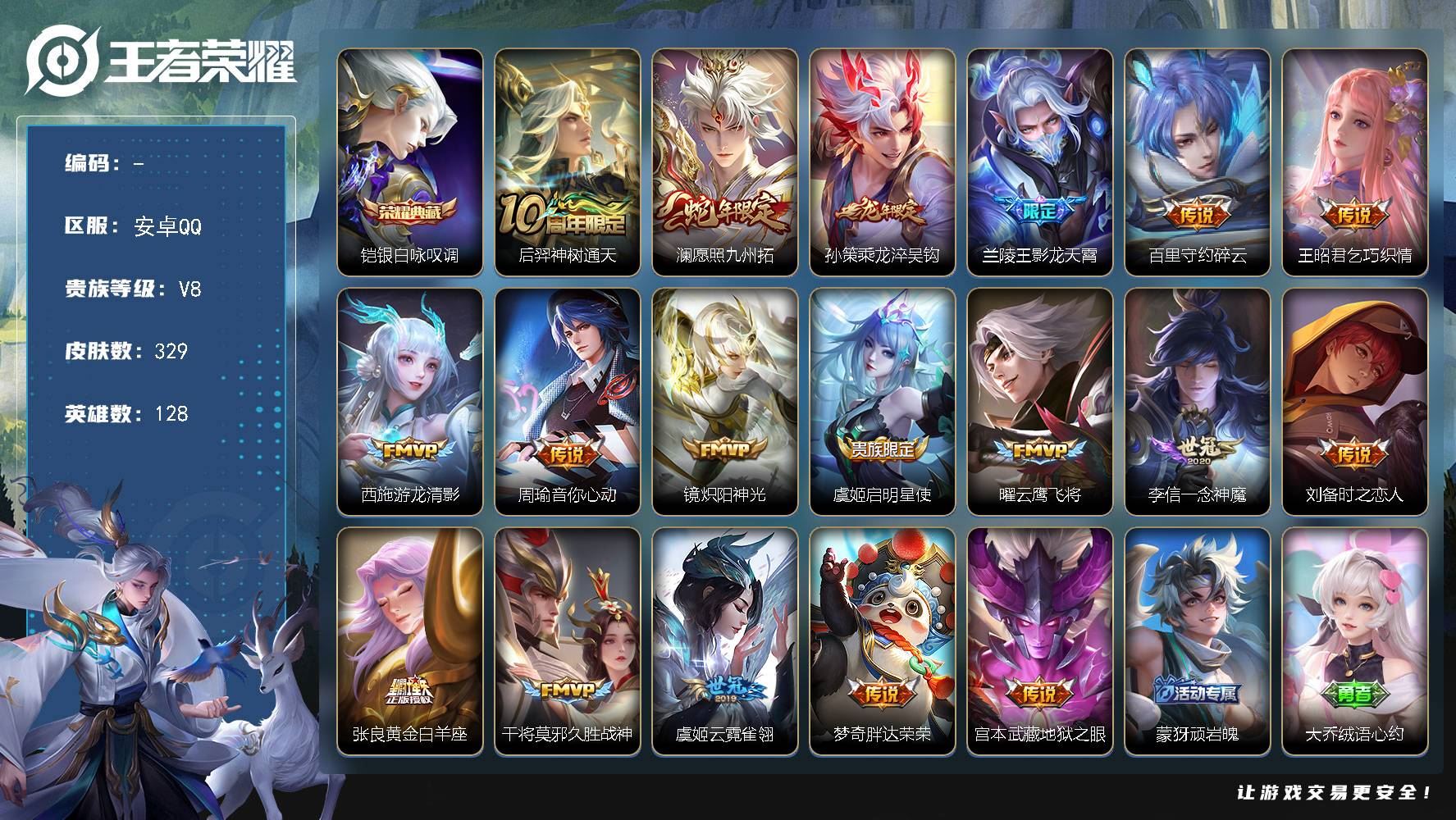 【游戏多多】 【可包人脸】安卓Q V8 最强王者段位 128英雄 329皮肤 1典藏 0珍品无双 0无双 0珍品传说 18传说 92史诗大区:安卓Q,营地:1869151251,贵族等级:8,【热门皮肤】:,【限定皮肤】:百里玄策罗小黑战记,影百相守梦,孙权径山谋武,兰陵王雾影缉谜,项羽九幽镇关,虞姬溯影追猎,周瑜线条小狗,鬼谷子谜偶窥秘,西施雪境奇遇,戈娅危途狂花,大乔猫狗日记,刘备纽约教父,牛魔牛运亨通,兰陵王傩神司,艾琳流音漫舞,弈星万物之道,后羿神树通天,艾琳鹤鸣心笺,莱西奥光弋星穹,明世隐往忆晖光,狂铁龙之律动,牛魔星界战将,亚瑟荣光之誓,杨玉环遇见飞天,哪吒罗小黑战记,公孙离涂山容容,云中君云械蓝图,鬼谷子克喵,莱西奥踏浪烽翎,甄姬逆浪荇歌,墨子进击墨子号,刘备浪漫序章,戈娅玫蓝誓约,亚连破局者,阿轲化蝶舞,马可波罗暗影游猎,孙膑茶境仙,马超访茗客,明世隐景韶洛都,姜子牙星梦巡礼,亚瑟心灵战警,百里玄策原初追逐者,太乙真人谧流熔炉,达摩爆裂喵拳,赵怀真器灵·浮梦炉,赵云引擎之心,澜愿照·九州拓,少司缘灵卦秘语,典韦铁骨偃魂,苍苍林狼骑,韩信街头霸王,干将莫邪雾都夜雨,裴擒虎李小龙,武则天东方不败,亚瑟动物派对,鲁班七号黑桃队长,东皇太一噬灭天穹,盘古敬我三分,上官婉儿神器·万象笔,蒙犽顽岩魄,亚瑟死亡骑士,大乔绒语心约,姜子牙天穹之誓,周瑜熔金海岸,钟馗神迹守卫,杨戬破阵·退雄兵,蒙恬荣光圣徽,项羽苍威无极,镜青焰无极,干将莫邪久胜战神,刘备异域游侠,大司命暗都幽影,姬小满妄想食味,程咬金群星魔术团,哪吒次元突破,赵云白执事,刘邦剑破天穹,女娲朔望之晖,鲁班七号蔬乡物语,刘禅唤灵魔甲【荣耀典藏】:铠银白咏叹调【截图或标题展示段位不代表实际段位,赛季更新等不可抗拒因素发生变化、时限道具不保证所剩时间,详情请看截图哦~】