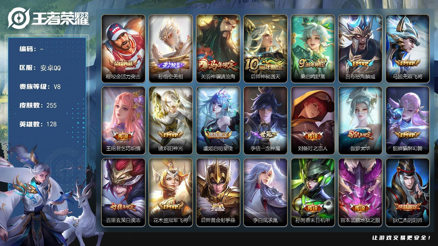 【游戏多多】 【可二次实名】zy代安卓q区王者营地404925748贵族8,162皮肤11传说33限定,虞姬启明星使,虞姬云霓雀翎,百里玄策白虎志,花木兰冠军飞将,后羿黄金射手座,貂蝉仲夏夜之梦,孙尚香末日机甲,宫本武藏地狱之眼,孙悟空地狱火,武则天海洋之心,狄仁杰超时空战士。信誉分83介意别拍