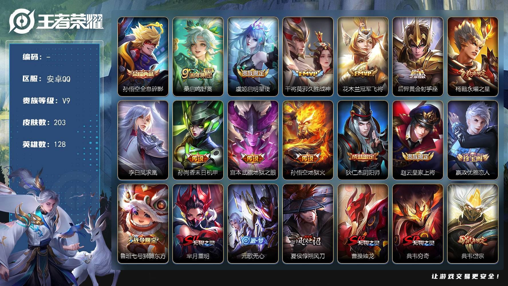 【游戏多多】 【可包人脸】安卓Q V9 尊贵铂金II段位 128英雄 203皮肤 1典藏 0珍品无双 0无双 0珍品传说 10传说 53史诗大区:安卓Q,营地:2139112082,贵族等级:9,【热门皮肤】:,【限定皮肤】:影百相守梦,苏烈坚韧之力,扁鹊救世之瞳,程咬金星际陆战队,周瑜线条小狗,太乙真人劲辣红锅,东皇太一噬灭天穹,桑启鸣野蒿,猪八戒潮玩探月行,廉颇功夫炙烤,甄姬花好人间,赵怀真太极少年,刘邦剑破天穹,朵莉亚金色潮汐,鬼谷子天穹祈灯,云中君纤云弄巧,鲁班大师探海日志,嬴政优雅恋人,裴擒虎擒涛扼浪,桑启海盐诗旅,海月幻泉雾影,元歌无心,李元芳云中旅人,沈梦溪大漠名商,兰陵王金庭之子,达摩沙漠行僧,镜匿光追影者,姜子牙炽热元素使,大乔守护之力,鲁班大师乓乓大师,钟馗驱傩正仪,程咬金演武夺筹,明世隐虹云星官,狄仁杰万华元夜,虞姬启明星使,鬼谷子原初探秘者,项羽科学大爆炸,蒙犽狂想玩偶喵,花木兰兔女郎,雅典娜单词大作战,裴擒虎李小龙,典韦黄金武士,老夫子醍醐杖,盾山圆桌骑士,哪吒次元突破,孙悟空至尊宝,明世隐疑决卦,宫本武藏霸王丸,后羿如梦令,达摩大发明家,李元芳银河之约,沈梦溪星空之诺,典韦岱宗,杨戬永曜之星,后羿辉光之辰,鲁班七号黑桃队长,韩信飞衡,李白凤求凰,弈星混沌棋,刘备汉昭烈帝,老夫子功夫老勺,上官婉儿梁祝,夏侯惇朔风刀,宫本武藏未来纪元,赵云忍·炎影,吕布野性能量,露娜紫霞仙子,花木兰冠军飞将,干将莫邪久胜战神,貂蝉圣诞恋歌,鬼谷子幻乐之宴,鲁班七号狮舞东方,盾山御銮,张飞五福同心,诸葛亮掌控之力,孙策猫狗日记,钟馗神迹守卫,宫本武藏万象初新,牛魔御旌,韩信街头霸王【荣耀典藏】:孙悟空全息碎影【截图或标题展示段位不代表实际段位,赛季更新等不可抗拒因素发生变化、时限道具不保证所剩时间,详情请看截图哦~】