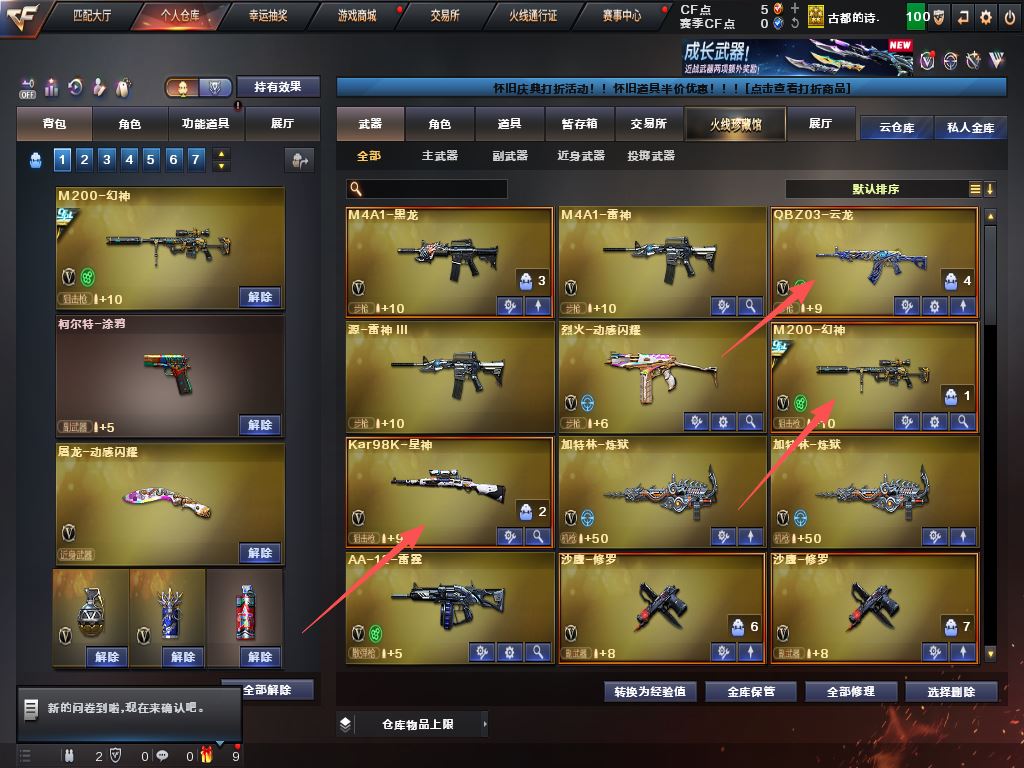 【游戏多多】【穿越火线】【编号:908328】【可包人脸】hmc ak021326 四川一区vip4 30v【m200幻神+冠军之幻+纸灯龙+冠军之刃】【98k星神+音效卡】【黑龙+卡】【雷神】 【武器:云龙 炼狱*2】 【6手呛:修罗*5 天神 】 【4刀具:龙啸 麒麟刺 幻灵之峰 屠龙动感闪耀 】 【雷套:幻灵雷*2】 【小人呛:毁灭孙三炮 】 【音效卡: 星神音效卡 黑龙音效卡 】 【角色:司雨】 ----更多炫彩背包/光效/名片/武器具体看图!截图展示段位不代实际段位,赛季更新等不可抗拒因素发生变化、时限道具不保证所剩时间、标题未写送点卷默认不送】【主播担保+安全至上+性价比 买号卖号只选金牌商家一左友】