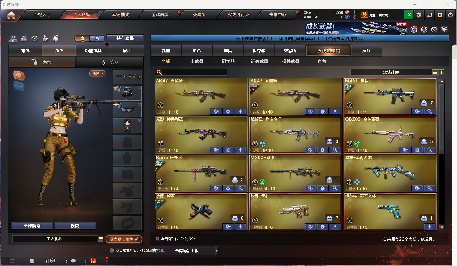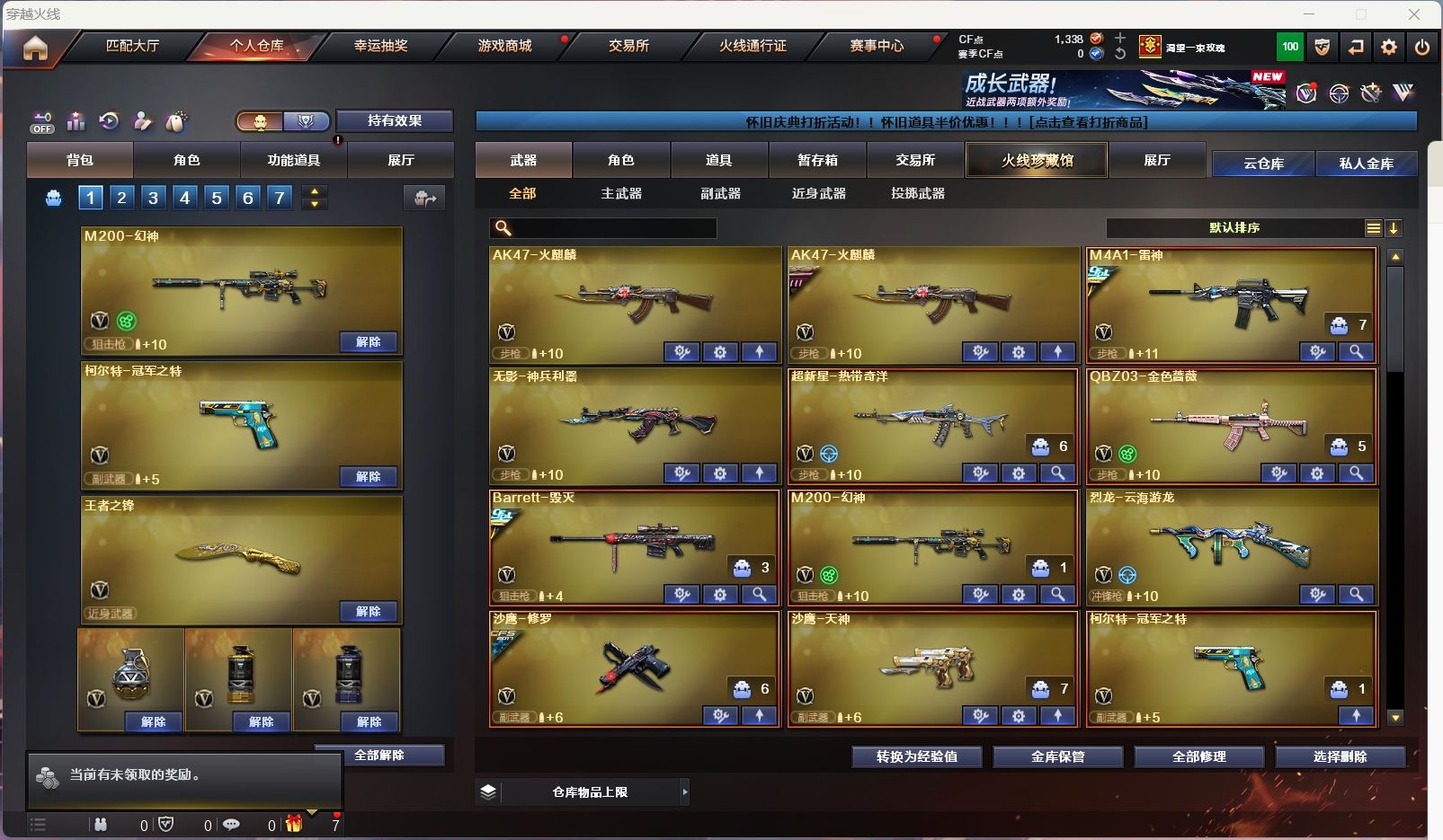 【游戏多多】【穿越火线】【编号:940428】【可二次实名】hmc ak021047黑龙江区22v【m200幻神+冠军之特】【qbz金色蔷薇】【火麒麟】【雷神+冠军之魄】【毁灭+卡+冠军之怒】 【武器:烈龙 】 【3手呛:修罗 天神 冠军之特】 【4刀具:幻灵之峰 王者之锋 擎天 龙啸 】 【雷套:幻灵雷 】 【小人呛:】 【音效卡:毁灭音效卡 】 【四防角色:王者影豹 】 ----更多炫彩背包/光效/名片/武器具体看图!截图展示段位不代实际段位,赛季更新等不可抗拒因素发生变化、时限道具不保证所剩时间、标题未写送点券默认不送】【主播担保+安全至上+性价比 买号卖号只选金牌商家一左友】