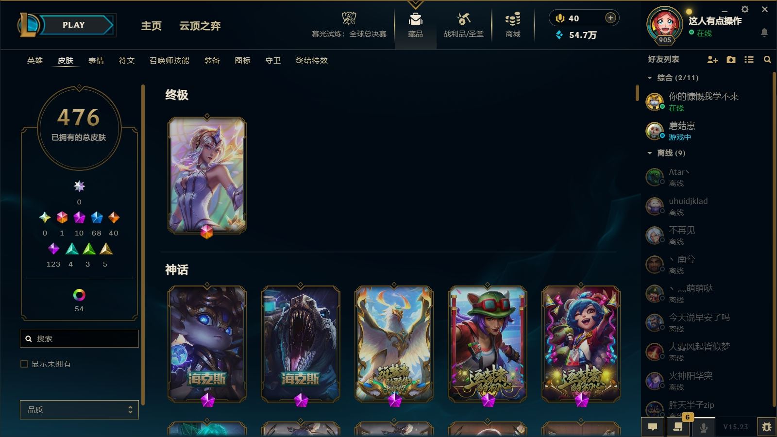 【游戏多多】【英雄联盟】【编号:513086】【可二次实名】hmc AK027540钢铁烈阳 905等级 172英雄 476皮肤【10神话 68限定 40传说 123史诗 54炫彩】【银龙裁决 泰隆】【大元素使 拉克丝】【神话 海克斯科技 波比 海克斯科技 雷克顿 源代码 乐芙兰 至臻 玉剑传说 武剑仙 至臻 K/DA 卡莎 至臻 K/DA 卡莎(2022)】【限定 暗裔英雄 盖伦 暗影 沃里克 电玩女神 厄运小姐 夺命美人 卡特琳娜 寒冬精灵 璐璐 胡桃夹子 萨科 冠军掠夺者 卡兹克 烈焰美人 薇恩 魄罗骑士 瑟庄妮 神龙烈焰 金克丝 胜利机器人 布里茨 胜利巨口 克格莫 幸福女神 乐芙兰 御星魔矢 艾希 征服者 韦鲁斯】----【截图展示段位不代表实际段位,如赛季更 新等不可抗拒因素发生变化、时限道具不保证所剩时间、标题未写送点券默认不送】买号找【左友】