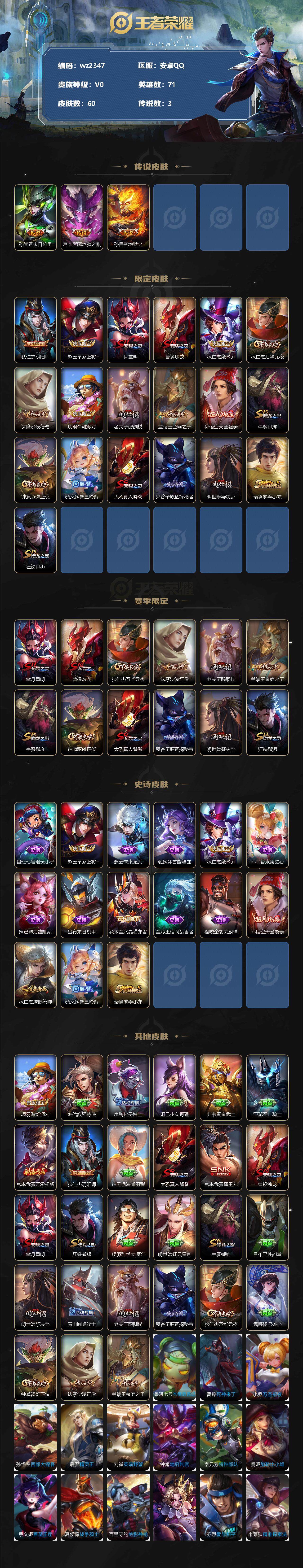 【游戏多多】【王者荣耀】【编号:3338777】【可二次实名】【wz2347】安卓Q-V0-荣耀黄金IV段位-71英雄-60皮肤-0典藏-0珍品无双-0无双-0珍品传说-3传说-15史诗 【传说皮肤】:孙尚香末日机甲,宫本武藏地狱之眼,孙悟空地狱火 【限定皮肤】:狄仁杰阴阳师,赵云皇家上将,芈月重明,曹操烛龙,狄仁杰魔术师,狄仁杰万华元夜,达摩沙漠行僧,项羽海滩派对,老夫子醍醐杖,兰陵王金庭之子,孙悟空大圣娶亲,牛魔御旌,钟馗驱傩正仪,蔡文姬繁星吟游,太乙真人饕餮,鬼谷子原初探秘者,明世隐疑决卦,裴擒虎李小龙,狂铁御狮 【赛季限定】:芈月重明,曹操烛龙,狄仁杰万华元夜,达摩沙漠行僧,老夫子醍醐杖,兰陵王金庭之子,牛魔御旌,钟馗驱傩正仪,太乙真人饕餮,鬼谷子原初探秘者,明世隐疑决卦,狂铁御狮 【史诗皮肤】:鲁班七号电玩小子,赵云皇家上将,赵云未来纪元,甄姬冰雪圆舞曲,狄仁杰魔术师,孙尚香水果甜心,妲己魅力维加斯,吕布末日机甲,花木兰水晶猎龙者,兰陵王暗隐猎兽者,程咬金功夫厨神,孙悟空大圣娶亲,狄仁杰鹰眼统帅,蔡文姬繁星吟游,裴擒虎李小龙 【其他皮肤】:项羽海滩派对,韩信教廷特使,扁鹊化身博士,妲己少女阿狸,典韦黄金武士,亚瑟死亡骑士,宫本武藏万象初新,狄仁杰阴阳师,钟无艳海滩丽影,太乙真人饕餮,宫本武藏霸王丸,曹操烛龙,芈月重明,狂铁御狮,项羽科学大爆炸,明世隐虹云星官,牛魔御旌,吕布野性能量,明世隐疑决卦,盾山圆桌骑士,老夫子醍醐杖,鬼谷子原初探秘者,狄仁杰万华元夜,露娜瓷语鉴心,钟馗驱傩正仪,达摩沙漠行僧,兰陵王金庭之子,鲁班七号木偶奇遇记,曹操死神来了,小乔万圣前夜,孙悟空西部大镖客,后羿精灵王,刘禅英喵野望,钟馗地府判官,李元芳特种部队,虞姬加勒比小姐,蔡文姬蔷薇王座,夏侯惇战争骑士,百里守约绝影神枪,百里玄策威尼斯狂欢,苏烈爱与和平,米莱狄精准探案法 【营地ID】:528339854