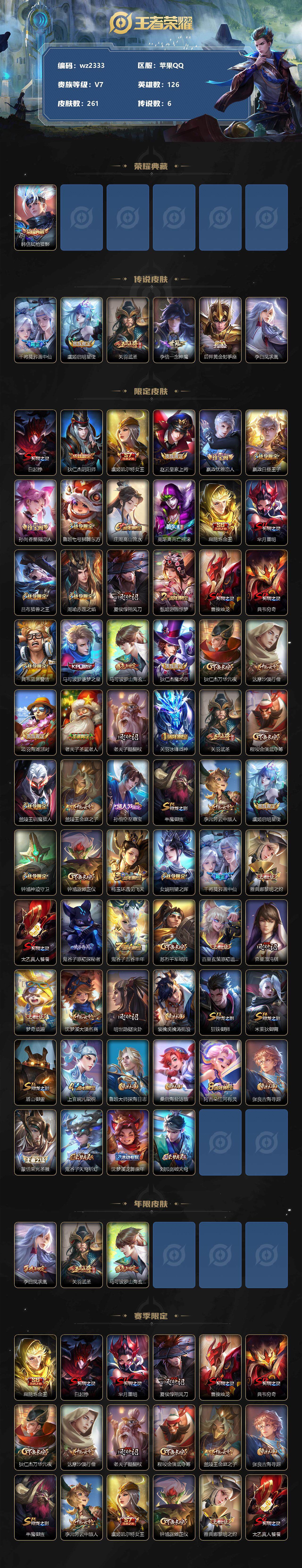 【游戏多多】【王者荣耀】【编号:3338790】【可二次实名】【wz2333】苹果Q-V7-至尊星耀II段位-126英雄-261皮肤-1典藏-0珍品无双-0无双-0珍品传说-6传说-65史诗 【英雄全皮】:鬼谷子全皮,空空儿全皮 【荣耀典藏】:韩信弑枪猎影 【传说皮肤】:干将莫邪画中仙,虞姬启明星使,关羽武圣,李信一念神魔,后羿黄金射手座,李白凤求凰 【限定皮肤】:白起狰,狄仁杰阴阳师,虞姬凯尔特女王,赵云皇家上将,嬴政优雅恋人,嬴政白昼王子,孙尚香蔷薇恋人,鲁班七号狮舞东方,庄周高山流水,高渐离死亡摇滚,扁鹊炼金王,芈月重明,吕布猎兽之王,周瑜赤莲之焰,夏侯惇朔风刀,甄姬游园惊梦,曹操烛龙,典韦穷奇,典韦蓝屏警告,马可波罗逐梦之星,马可波罗山海玄木吟,狄仁杰魔术师,狄仁杰万华元夜,达摩沙漠行僧,项羽海滩派对,老夫子圣诞老人,老夫子醍醐杖,关羽冰锋战神,关羽武圣,程咬金演武夺筹,兰陵王驯魔猎人,兰陵王金庭之子,孙悟空至尊宝,牛魔御旌,李元芳云中旅人,虞姬启明星使,钟馗神迹守卫,钟馗驱傩正仪,杨玉环遇见飞天,女娲朔望之晖,干将莫邪画中仙,雅典娜黎明之约,太乙真人饕餮,鬼谷子原初探秘者,鬼谷子五谷丰年,苏烈千军破阵,百里玄策原初追逐者,弈星混沌棋,梦奇顽趣,沈梦溪大漠名商,明世隐疑决卦,裴擒虎擒涛扼浪,狂铁御狮,米莱狄御霄,盾山御銮,上官婉儿梁祝,鲁班大师探海日志,桑启海盐诗旅,阿古朵江河有灵,张良古海寻踪,蒙恬荣光圣徽,鬼谷子天穹祈灯,沈梦溪龙舞盛年,刘邦剑破天穹 【年限皮肤】:李白凤求凰,关羽武圣,马可波罗山海玄木吟 【赛季限定】:扁鹊炼金王,白起狰,芈月重明,夏侯惇朔风刀,曹操烛龙,典韦穷奇,狄仁杰万华元夜,达摩沙漠行僧,老夫子醍醐杖,程咬金演武夺筹,兰陵王金庭之子,张良古海寻踪,牛魔御旌,李元芳云中旅人,虞姬凯尔特女王,钟馗驱傩正仪,雅典娜黎明之约,太乙真人饕餮,鬼谷子原初探秘者,苏烈千军破阵,百里玄策原初追逐者,弈星混沌棋,梦奇顽趣,沈梦溪大漠名商,明世隐疑决卦,裴擒虎擒涛扼浪,狂铁御狮,米莱狄御霄,盾山御銮,鲁班大师探海日志,桑启海盐诗旅,鬼谷子天穹祈灯,蒙恬荣光圣徽,刘邦剑破天穹 【战令限定】:嬴政白昼王子,鲁班七号狮舞东方,吕布猎兽之王,周瑜赤莲之焰,典韦蓝屏警告,兰陵王驯魔猎人,钟馗神迹守卫,女娲朔望之晖 【史诗皮肤】:项羽苍穹之光,露娜紫霞仙子,阿轲暗夜猫娘,赵云皇家上将,赵云未来纪元,貂蝉圣诞恋歌,老夫子圣诞老人,甄姬冰雪圆舞曲,王昭君偶像歌手,狄仁杰魔术师,廉颇地狱岩魂,宫本武藏鬼剑武藏,孙尚香蔷薇恋人,孙尚香水果甜心,嬴政优雅恋人,嬴政摇滚巨星,妲己魅力维加斯,妲己女仆咖啡,墨子金属风暴,吕布圣诞狂欢,曹操幽灵船长,李白千年之狐,张飞乱世虎臣,韩信白龙吟,关羽冰锋战神,孙悟空至尊宝,花木兰水晶猎龙者,诸葛亮黄金分割率,甄姬游园惊梦,马可波罗逐梦之星,亚瑟心灵战警,安琪拉心灵骇客,百里守约特工魅影,蔡文姬舞动绿茵,李元芳逐浪之夏,程咬金功夫厨神,白起星夜王子,阿轲节奏热浪,杨玉环遇见飞天,嬴政白昼王子,典韦蓝屏警告,伽罗箭羽风息,鲁班七号狮舞东方,狄仁杰鹰眼统帅,公孙离无限星赏官,兰陵王驯魔猎人,上官婉儿梁祝,小乔青蛇,橘右京修罗,百里玄策原初追逐者,蒙犽龙鼓争鸣,庄周高山流水,雅典娜黎明之约,鬼谷子五谷丰年,梦奇顽趣,马可波罗山海玄木吟,阿古朵江河有灵,蒙恬荣光圣徽,亚连破空之剑,刘禅鸭鸭历险记,狂铁龙之律动,黄忠百相守梦,西施织梦人,弈星守夜人,公孙离涂山容容 【其他皮肤】:项羽海滩派对,韩信教廷特使,韩信街头霸王,露娜哥特玫瑰,阿轲爱心护理,达摩大发明家,赵云忍炎影,芈月红桃皇后,程咬金爱与正义,白起白色死神,牛魔西部大镖客,扁鹊化身博士,宫本武藏未来纪元,孙膑天使之翼,姜子牙时尚教父,妲己少女阿狸,典韦黄金武士,亚瑟死亡骑士,达摩拳王,花木兰兔女郎,张飞五福同心,甄姬花好人间,刘备万事如意,宫本武藏万象初新,后羿阿尔法小队,狄仁杰阴阳师,刘备纽约教父,高渐离死亡摇滚,刘备汉昭烈帝,扁鹊炼金王,关羽龙腾万里,虞姬凯尔特女王,墨子进击墨子号,白起狰,钟无艳海滩丽影,太乙真人饕餮,曹操烛龙,王昭君幻想奇妙夜,芈月重明,狂铁命运角斗场,老夫子功夫老勺,孙尚香沉稳之力,典韦穷奇,诸葛亮掌控之力,李白敏锐之力,鬼谷子幻乐之宴,狂铁御狮,安琪拉如懿,项羽科学大爆炸,米莱狄御霄,吕布猎兽之王,明世隐虹云星官,庄周奇妙博物学,牛魔御旌,女娲朔望之晖,小乔丁香结,吕布野性能量,钟馗神迹守卫,盾山御銮,孙膑归虚梦演,沈梦溪鲨炮海盗猫,姜子牙炽热元素使,夏侯惇朔风刀,周瑜赤莲之焰,弈星混沌棋,哪吒次元突破,明世隐疑决卦,盾山圆桌骑士,老夫子醍醐杖,狂铁特工战影,鬼谷子原初探秘者,狄仁杰万华元夜,刘禅秘密基地,露娜瓷语鉴心,程咬金演武夺筹,张良缤纷绘卷,盘古重装意志,钟馗驱傩正仪,