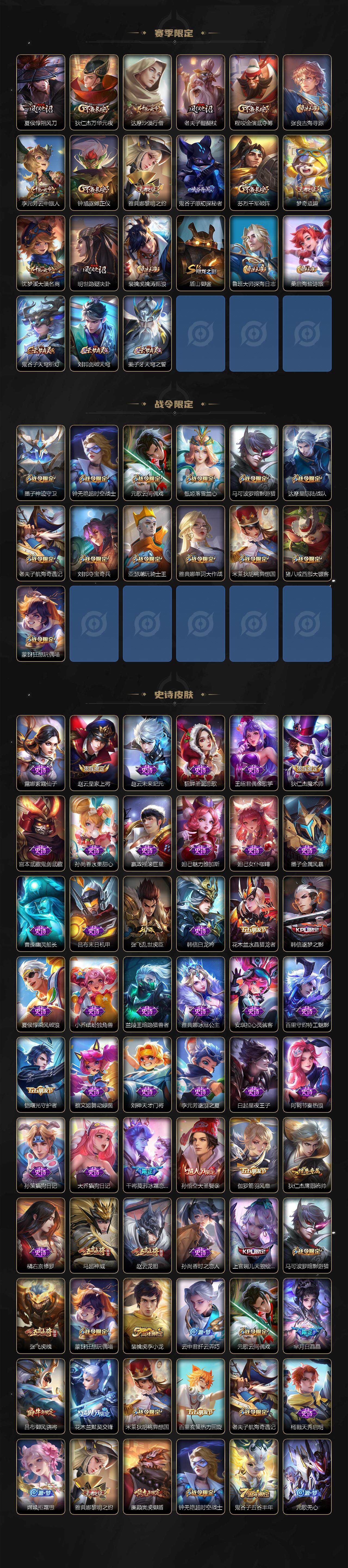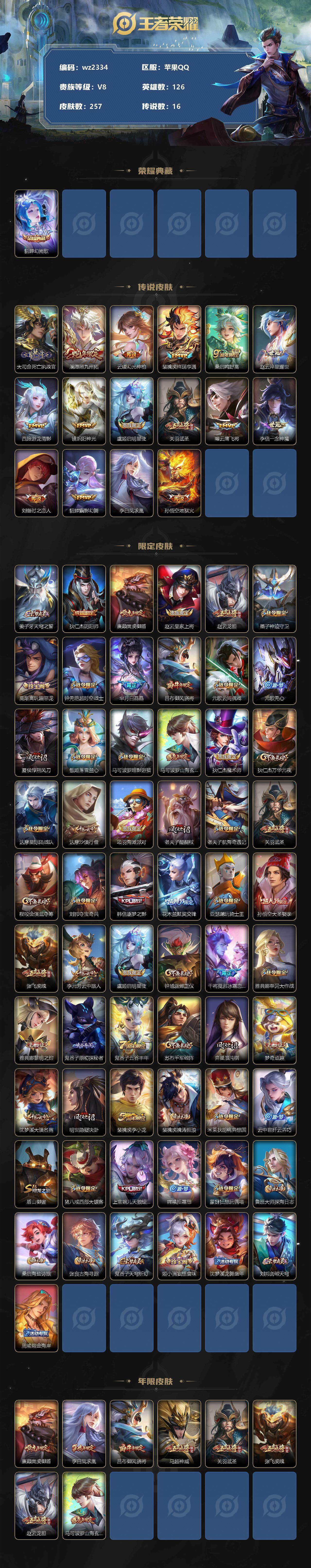 【游戏多多】【王者荣耀】【编号:3338807】【可二次实名】【wz2334】苹果Q-V8-最强王者段位-126英雄-257皮肤-1典藏-0珍品无双-0无双-0珍品传说-16传说-72史诗 【英雄全皮】:孙权全皮,鬼谷子全皮,空空儿全皮,影全皮 【荣耀典藏】:貂蝉幻阙歌 【传说皮肤】:大司命死亡执政官,澜愿照九州拓,云缨幻光神枪,裴擒虎祥瑞亨通,桑启鸣野蒿,赵云淬星耀世,西施游龙清影,镜炽阳神光,虞姬启明星使,关羽武圣,曜云鹰飞将,李信一念神魔,刘备时之恋人,貂蝉猫影幻舞,李白凤求凰,孙悟空地狱火 【限定皮肤】:姜子牙天穹之誓,狄仁杰阴阳师,廉颇寅虎御盾,赵云皇家上将,赵云龙胆,墨子神迹守卫,高渐离玩趣恶龙,钟无艳超时空战士,芈月白晶晶,吕布御风骁将,元歌云间偶戏,元歌无心,夏侯惇朔风刀,甄姬落雪兰心,马可波罗暗影游猎,马可波罗山海玄木吟,狄仁杰魔术师,狄仁杰万华元夜,达摩星际陆战队,达摩沙漠行僧,项羽海滩派对,老夫子醍醐杖,老夫子航海奇遇记,关羽武圣,程咬金演武夺筹,刘邦夺宝奇兵,韩信逐梦之影,花木兰默契交锋,亚瑟潮玩骑士王,孙悟空大圣娶亲,张飞虎魄,李元芳云中旅人,虞姬启明星使,钟馗驱傩正仪,干将莫邪冰霜恋舞曲,雅典娜单词大作战,雅典娜黎明之约,鬼谷子原初探秘者,鬼谷子五谷丰年,苏烈千军破阵,弈星混沌棋,梦奇顽趣,沈梦溪大漠名商,明世隐疑决卦,裴擒虎李小龙,裴擒虎擒涛扼浪,米莱狄胡桃异想国,云中君纤云弄巧,盾山御銮,猪八戒西部大镖客,上官婉儿天狼绘梦者,嫦娥拒霜思,蒙犽狂想玩偶喵,鲁班大师探海日志,桑启海盐诗旅,张良古海寻踪,鬼谷子天穹祈灯,姬小满妄想食味,沈梦溪龙舞盛年,刘邦剑破天穹,周瑜熔金海岸 【年限皮肤】:廉颇寅虎御盾,李白凤求凰,吕布御风骁将,马超神威,关羽武圣,张飞虎魄,赵云龙胆,马可波罗山海玄木吟 【赛季限定】:夏侯惇朔风刀,狄仁杰万华元夜,达摩沙漠行僧,老夫子醍醐杖,程咬金演武夺筹,张良古海寻踪,李元芳云中旅人,钟馗驱傩正仪,雅典娜黎明之约,鬼谷子原初探秘者,苏烈千军破阵,弈星混沌棋,梦奇顽趣,沈梦溪大漠名商,明世隐疑决卦,裴擒虎擒涛扼浪,盾山御銮,鲁班大师探海日志,桑启海盐诗旅,鬼谷子天穹祈灯,刘邦剑破天穹,姜子牙天穹之誓 【战令限定】:墨子神迹守卫,钟无艳超时空战士,元歌云间偶戏,甄姬落雪兰心,马可波罗暗影游猎,达摩星际陆战队,老夫子航海奇遇记,刘邦夺宝奇兵,亚瑟潮玩骑士王,雅典娜单词大作战,米莱狄胡桃异想国,猪八戒西部大镖客,蒙犽狂想玩偶喵 【史诗皮肤】:露娜紫霞仙子,赵云皇家上将,赵云未来纪元,貂蝉圣诞恋歌,王昭君偶像歌手,狄仁杰魔术师,宫本武藏鬼剑武藏,孙尚香水果甜心,嬴政摇滚巨星,妲己魅力维加斯,妲己女仆咖啡,墨子金属风暴,曹操幽灵船长,吕布末日机甲,张飞乱世虎臣,韩信白龙吟,花木兰水晶猎龙者,韩信逐梦之影,夏侯惇乘风破浪,小乔缤纷独角兽,兰陵王暗隐猎兽者,雅典娜冰冠公主,安琪拉心灵骇客,百里守约特工魅影,铠曙光守护者,蔡文姬舞动绿茵,刘禅天才门将,李元芳逐浪之夏,白起星夜王子,阿轲节奏热浪,孙策猫狗日记,大乔猫狗日记,干将莫邪冰霜恋舞曲,孙悟空大圣娶亲,伽罗箭羽风息,狄仁杰鹰眼统帅,橘右京修罗,马超神威,赵云龙胆,孙尚香时之恋人,上官婉儿天狼绘梦者,马可波罗暗影游猎,张飞虎魄,蒙犽狂想玩偶喵,裴擒虎李小龙,云中君纤云弄巧,元歌云间偶戏,芈月白晶晶,吕布御风骁将,花木兰默契交锋,米莱狄胡桃异想国,百里玄策热力回旋,老夫子航海奇遇记,杨戬天秀启明,嫦娥拒霜思,雅典娜黎明之约,廉颇寅虎御盾,钟无艳超时空战士,鬼谷子五谷丰年,元歌无心,梦奇顽趣,马可波罗山海玄木吟,姬小满妄想食味,牛魔星界战将,赵怀真器灵浮梦炉,狂铁龙之律动,后羿石田雨龙,周瑜百相守梦,黄忠百相守梦,西施织梦人,公孙离涂山容容,莱西奥光弋星穹 【其他皮肤】:项羽海滩派对,韩信教廷特使,韩信街头霸王,露娜哥特玫瑰,达摩大发明家,赵云白执事,赵云忍炎影,芈月红桃皇后,程咬金爱与正义,白起白色死神,扁鹊化身博士,扁鹊救世之瞳,庄周鲤鱼之梦,孙膑天使之翼,姜子牙时尚教父,典韦黄金武士,亚瑟死亡骑士,花木兰兔女郎,张飞五福同心,刘备万事如意,宫本武藏万象初新,后羿阿尔法小队,狄仁杰阴阳师,关羽龙腾万里,墨子进击墨子号,钟无艳海滩丽影,狂铁命运角斗场,老夫子功夫老勺,孙尚香沉稳之力,诸葛亮掌控之力,李白敏锐之力,鬼谷子幻乐之宴,大乔守护之力,项羽科学大爆炸,明世隐虹云星官,庄周奇妙博物学,小乔丁香结,吕布野性能量,盾山御銮,高渐离玩趣恶龙,沈梦溪鲨炮海盗猫,姜子牙炽热元素使,夏侯惇朔风刀,弈星混沌棋,哪吒次元突破,明世隐疑决卦,刘邦夺宝奇兵,盾山圆桌骑士,老夫子醍醐杖,猪八戒西部大镖客,廉颇无尽征程,鬼谷子原初探秘者,雅典娜单词大作战,狄仁杰万华元夜,亚瑟潮玩骑士王,刘禅秘密基地,杨戬次元傲视,达摩星际