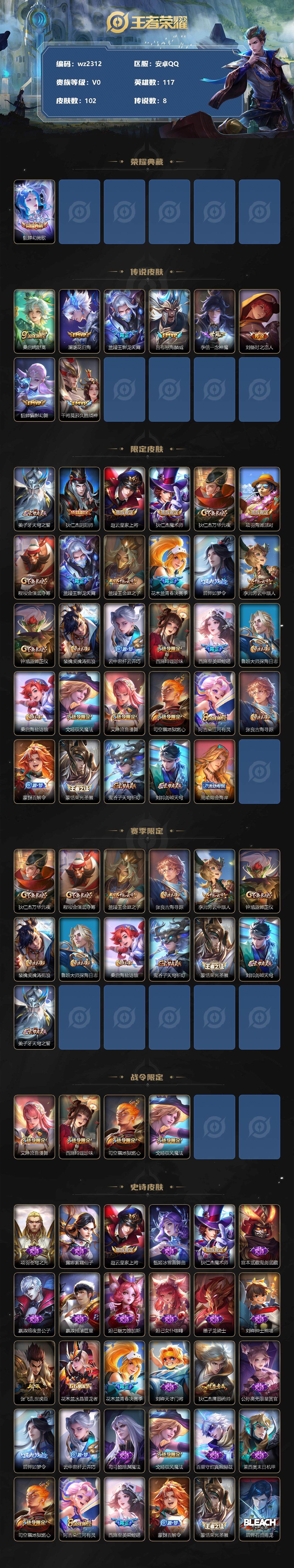【游戏多多】【王者荣耀】【编号:3338810】【可二次实名】【wz2312】安卓Q-V0-永恒钻石I段位-117英雄-102皮肤-1典藏-0珍品无双-0无双-0珍品传说-8传说-30史诗 【英雄全皮】:影全皮 【荣耀典藏】:貂蝉幻阙歌 【传说皮肤】:桑启鸣野蒿,澜逐花归海,兰陵王影龙天霄,吕布怒海麟威,李信一念神魔,刘备时之恋人,貂蝉猫影幻舞,干将莫邪久胜战神 【限定皮肤】:姜子牙天穹之誓,狄仁杰阴阳师,赵云皇家上将,狄仁杰魔术师,狄仁杰万华元夜,项羽海滩派对,程咬金演武夺筹,兰陵王影龙天霄,兰陵王金庭之子,花木兰青春决赛季,后羿如梦令,李元芳云中旅人,钟馗驱傩正仪,裴擒虎擒涛扼浪,云中君纤云弄巧,西施玲珑珍味,西施至美乘鲤谣,鲁班大师探海日志,桑启海盐诗旅,戈娅驭风魔法,艾琳流音漫舞,司空震地狱燃心,阿古朵江河有灵,张良古海寻踪,蒙犽百解令,蒙恬荣光圣徽,鬼谷子天穹祈灯,刘邦剑破天穹,周瑜熔金海岸 【赛季限定】:狄仁杰万华元夜,程咬金演武夺筹,兰陵王金庭之子,张良古海寻踪,李元芳云中旅人,钟馗驱傩正仪,裴擒虎擒涛扼浪,鲁班大师探海日志,桑启海盐诗旅,鬼谷子天穹祈灯,蒙恬荣光圣徽,刘邦剑破天穹,姜子牙天穹之誓 【战令限定】:艾琳流音漫舞,西施玲珑珍味,司空震地狱燃心,戈娅驭风魔法 【史诗皮肤】:项羽苍穹之光,露娜紫霞仙子,赵云皇家上将,甄姬冰雪圆舞曲,狄仁杰魔术师,宫本武藏鬼剑武藏,嬴政暗夜贵公子,嬴政摇滚巨星,妲己魅力维加斯,妲己女仆咖啡,墨子龙骑士,刘禅绅士熊喵,张飞乱世虎臣,花木兰水晶猎龙者,花木兰青春决赛季,刘禅天才门将,狄仁杰鹰眼统帅,公孙离无限星赏官,后羿如梦令,云中君纤云弄巧,司马懿暗渊魔法,戈娅驭风魔法,百里守约真我赫兹,莱西奥末日机甲,司空震地狱燃心,阿古朵江河有灵,西施至美乘鲤谣,蒙犽百解令,蒙恬荣光圣徽,后羿石田雨龙 【其他皮肤】:项羽海滩派对,韩信街头霸王,白起白色死神,牛魔西部大镖客,扁鹊化身博士,安琪拉玩偶对对碰,孙膑天使之翼,妲己少女阿狸,亚瑟死亡骑士,花木兰兔女郎,张飞五福同心,甄姬花好人间,狄仁杰阴阳师,王昭君幻想奇妙夜,孙尚香沉稳之力,诸葛亮掌控之力,大乔守护之力,吕布野性能量,孙膑归虚梦演,狂铁特工战影,狄仁杰万华元夜,程咬金演武夺筹,钟馗驱傩正仪,兰陵王金庭之子,李元芳云中旅人,桑启海盐诗旅,裴擒虎擒涛扼浪,太乙真人劲辣红锅,鲁班大师探海日志,西施玲珑珍味,李元芳妄想特派,艾琳流音漫舞,张良古海寻踪,钟无艳聚星闪耀,亚连破局者,程咬金暖冬絮语,鬼谷子天穹祈灯,钟无艳春野之旅,刘邦剑破天穹,姜子牙天穹之誓,周瑜熔金海岸,东皇太一噬灭天穹,太乙真人谧流熔炉,影魅影绮裳,张良灵野札记,甄姬逆浪荇歌,鲁班七号福禄兄弟,高渐离金属狂潮,貂蝉异域舞娘,后羿精灵王,李白范海辛,马可波罗激情绿茵,干将莫邪第七人偶,百里守约绝影神枪,百里玄策威尼斯狂欢,女娲尼罗河女神,公孙离花间舞,伽罗花见巫女,上官婉儿修竹墨客,盘古创世神祝,蒙犽归虚梦演,澜孤猎,桑启画中游 【内测皮肤】:狂铁特工战影 【营地ID】:1744080515