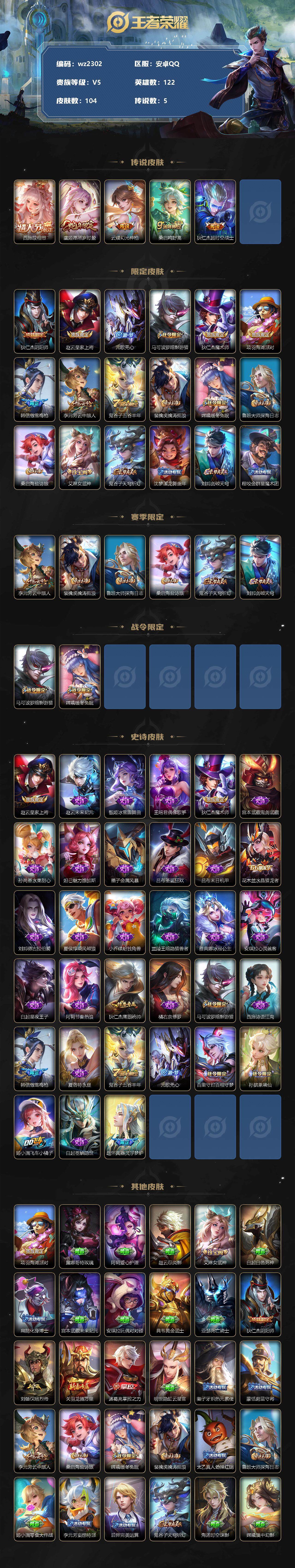 【游戏多多】【王者荣耀】【编号:3338823】【可二次实名】【wz2302】安卓Q-V5-永恒钻石IV段位-122英雄-104皮肤-0典藏-0珍品无双-0无双-0珍品传说-5传说-33史诗 【英雄全皮】:影全皮 【传说皮肤】:西施续相思,虞姬愿照岁时盈,云缨幻光神枪,桑启鸣野蒿,狄仁杰超时空战士 【限定皮肤】:狄仁杰阴阳师,赵云皇家上将,元歌无心,马可波罗暗影游猎,狄仁杰魔术师,项羽海滩派对,韩信傲雪梅枪,李元芳云中旅人,鬼谷子五谷丰年,裴擒虎擒涛扼浪,嫦娥暖冬兔眠,鲁班大师探海日志,桑启海盐诗旅,艾琳女武神,鬼谷子天穹祈灯,沈梦溪龙舞盛年,刘邦剑破天穹,程咬金群星魔术团 【赛季限定】:李元芳云中旅人,裴擒虎擒涛扼浪,鲁班大师探海日志,桑启海盐诗旅,鬼谷子天穹祈灯,刘邦剑破天穹 【战令限定】:马可波罗暗影游猎,嫦娥暖冬兔眠 【史诗皮肤】:赵云皇家上将,赵云未来纪元,甄姬冰雪圆舞曲,王昭君偶像歌手,狄仁杰魔术师,宫本武藏鬼剑武藏,孙尚香水果甜心,妲己魅力维加斯,墨子金属风暴,吕布圣诞狂欢,吕布末日机甲,花木兰水晶猎龙者,刘邦德古拉伯爵,夏侯惇乘风破浪,小乔缤纷独角兽,兰陵王暗隐猎兽者,雅典娜冰冠公主,安琪拉心灵骇客,白起星夜王子,阿轲节奏热浪,狄仁杰鹰眼统帅,橘右京修罗,马可波罗暗影游猎,西施诗语江南,韩信傲雪梅枪,夏洛特永昼,鬼谷子五谷丰年,元歌无心,百里守约百相守梦,孙膑茶境仙,姬小满飞车小橘子,白起苍鳞隐世,赵怀真器灵浮梦炉 【其他皮肤】:项羽海滩派对,露娜哥特玫瑰,阿轲爱心护理,赵云忍炎影,艾琳女武神,白起白色死神,扁鹊化身博士,宫本武藏未来纪元,安琪拉玩偶对对碰,典韦黄金武士,亚瑟死亡骑士,狄仁杰阴阳师,刘备汉昭烈帝,关羽龙腾万里,诸葛亮掌控之力,明世隐虹云星官,姜子牙炽热元素使,蒙恬蔚蓝守将,李元芳云中旅人,桑启海盐诗旅,嫦娥暖冬兔眠,裴擒虎擒涛扼浪,太乙真人劲辣红锅,鲁班大师探海日志,姬小满零食大作战,李元芳妄想特派,后羿完美运算,鬼谷子天穹祈灯,海诺时空谍影,嫦娥漠中幻影,沈梦溪龙舞盛年,钟无艳春野之旅,刘邦剑破天穹,程咬金群星魔术团,东皇太一噬灭天穹,老夫子百相守梦,干将莫邪雾都夜雨,苍苍林狼骑,太乙真人谧流熔炉,典韦铁骨偃魂,马超访茗客,影魅影绮裳,西施雪境奇遇,少司缘灵卦秘语,明世隐景韶洛都,戈娅玫蓝誓约,刘备浪漫序章,钟馗虚灵犬护,阿古朵布丁狗之约,项羽帝国元帅,曹操超能战警,孙悟空西部大镖客,虞姬加勒比小姐,关羽天启骑士,马可波罗激情绿茵,东皇太一东海龙王,铠龙域领主,百里守约绝影神枪,孙策海之征途,伽罗花见巫女,李信灼热之刃,盘古创世神祝,马超幸存者,蒙恬秩序猎龙将,司空震启蛰,暃碧珀绯影 【内测皮肤】:艾琳女武神 【营地ID】:1785700348