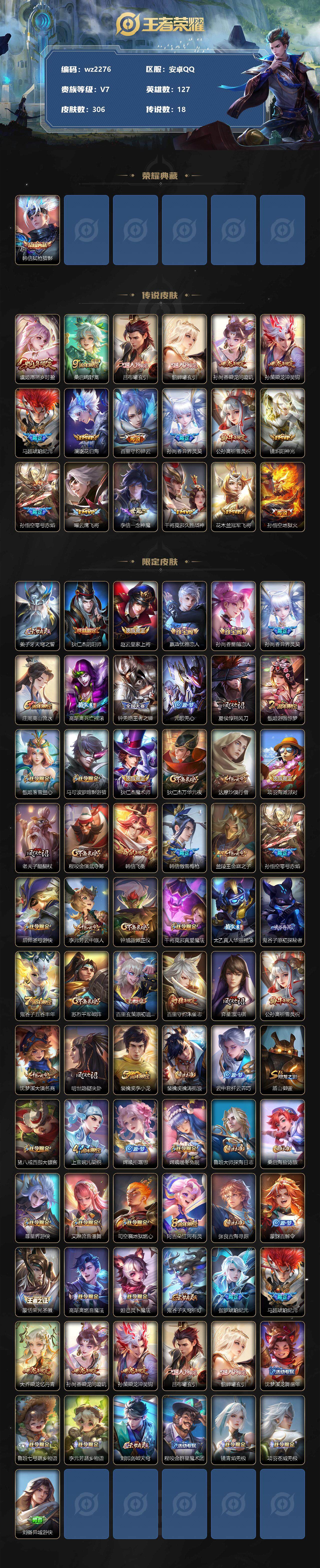 【游戏多多】【王者荣耀】【编号:3338852】【可二次实名】【wz2276】安卓Q-V7-至尊星耀V段位-127英雄-306皮肤-1典藏-0珍品无双-0无双-0珍品传说-18传说-69史诗 【英雄全皮】:蒙恬全皮 【荣耀典藏】:韩信弑枪猎影 【传说皮肤】:虞姬愿照岁时盈,桑启鸣野蒿,吕布曦玄引,貂蝉曦玄引,孙尚香乘龙问璇玑,孙策乘龙淬吴钩,马超琥珀纪元,澜逐花归海,百里守约碎云,孙尚香异界灵契,公孙离祈雪灵祝,镜炽阳神光,孙悟空零号赤焰,曜云鹰飞将,李信一念神魔,干将莫邪久胜战神,花木兰冠军飞将,孙悟空地狱火 【限定皮肤】:姜子牙天穹之誓,狄仁杰阴阳师,赵云皇家上将,嬴政优雅恋人,孙尚香蔷薇恋人,孙尚香异界灵契,庄周高山流水,高渐离死亡摇滚,钟无艳王者之锤,元歌无心,夏侯惇朔风刀,甄姬游园惊梦,甄姬落雪兰心,马可波罗暗影游猎,狄仁杰魔术师,狄仁杰万华元夜,达摩沙漠行僧,项羽海滩派对,老夫子醍醐杖,程咬金演武夺筹,韩信飞衡,韩信傲雪梅枪,兰陵王金庭之子,孙悟空零号赤焰,后羿圣弓游侠,李元芳云中旅人,钟馗驱傩正仪,干将莫邪真爱魔法,太乙真人华丽摇滚,鬼谷子原初探秘者,鬼谷子五谷丰年,苏烈千军破阵,百里玄策原初追逐者,百里守约朱雀志,弈星混沌棋,公孙离祈雪灵祝,沈梦溪大漠名商,明世隐疑决卦,裴擒虎李小龙,裴擒虎擒涛扼浪,云中君纤云弄巧,盾山御銮,猪八戒西部大镖客,上官婉儿梁祝,嫦娥拒霜思,嫦娥暖冬兔眠,鲁班大师探海日志,桑启海盐诗旅,暃星界游侠,艾琳流音漫舞,司空震地狱燃心,阿古朵江河有灵,张良古海寻踪,蒙犽百解令,蒙恬荣光圣徽,高渐离燃音魔法,妲己灵卜魔法,鬼谷子天穹祈灯,伽罗琥珀纪元,马超琥珀纪元,大乔乘龙忆丹青,孙尚香乘龙问璇玑,孙策乘龙淬吴钩,吕布曦玄引,貂蝉曦玄引,沈梦溪龙舞盛年,鲁班七号蔬乡物语,李元芳蔬乡物语,刘邦剑破天穹,程咬金群星魔术团,镜青焰无极,项羽苍威无极,刘备异域游侠 【年限皮肤】:百里守约朱雀志,公孙离祈雪灵祝,韩信飞衡,马超神威,大乔乘龙忆丹青,孙尚香乘龙问璇玑,孙策乘龙淬吴钩 【赛季限定】:夏侯惇朔风刀,狄仁杰万华元夜,达摩沙漠行僧,老夫子醍醐杖,程咬金演武夺筹,兰陵王金庭之子,张良古海寻踪,李元芳云中旅人,钟馗驱傩正仪,鬼谷子原初探秘者,苏烈千军破阵,百里玄策原初追逐者,弈星混沌棋,沈梦溪大漠名商,明世隐疑决卦,裴擒虎擒涛扼浪,盾山御銮,鲁班大师探海日志,桑启海盐诗旅,鬼谷子天穹祈灯,蒙恬荣光圣徽,刘邦剑破天穹,姜子牙天穹之誓 【战令限定】:甄姬落雪兰心,马可波罗暗影游猎,艾琳流音漫舞,后羿圣弓游侠,干将莫邪真爱魔法,猪八戒西部大镖客,嫦娥暖冬兔眠,司空震地狱燃心,暃星界游侠,高渐离燃音魔法,妲己灵卜魔法,鲁班七号蔬乡物语,李元芳蔬乡物语,镜青焰无极,项羽苍威无极 【史诗皮肤】:项羽苍穹之光,钟无艳王者之锤,赵云皇家上将,赵云未来纪元,貂蝉圣诞恋歌,甄姬冰雪圆舞曲,王昭君偶像歌手,狄仁杰魔术师,宫本武藏鬼剑武藏,孙尚香蔷薇恋人,孙尚香水果甜心,嬴政优雅恋人,嬴政暗夜贵公子,嬴政摇滚巨星,妲己魅力维加斯,妲己女仆咖啡,墨子金属风暴,吕布圣诞狂欢,曹操幽灵船长,吕布末日机甲,张飞乱世虎臣,花木兰水晶猎龙者,刘邦德古拉伯爵,夏侯惇乘风破浪,小乔缤纷独角兽,甄姬游园惊梦,亚瑟心灵战警,雅典娜冰冠公主,安琪拉心灵骇客,百里守约特工魅影,蔡文姬舞动绿茵,李元芳逐浪之夏,程咬金功夫厨神,阿轲节奏热浪,百里守约朱雀志,狄仁杰鹰眼统帅,上官婉儿梁祝,韩信飞衡,橘右京修罗,马超神威,马可波罗暗影游猎,百里玄策原初追逐者,裴擒虎李小龙,云中君纤云弄巧,西施诗语江南,干将莫邪真爱魔法,安琪拉时之奇旅,庄周高山流水,嫦娥拒霜思,韩信傲雪梅枪,鬼谷子五谷丰年,元歌无心,暃星界游侠,刘禅电玩爆裂旋风,司空震地狱燃心,阿古朵江河有灵,蒙犽百解令,妲己灵卜魔法,高渐离燃音魔法,蒙恬荣光圣徽,伽罗琥珀纪元,大乔乘龙忆丹青,鲁班七号蔬乡物语,镜青焰无极,牛魔星界战将,孙膑茶境仙,弈星万物之道,赵怀真器灵浮梦炉,狂铁龙之律动,黄忠百相守梦 【其他皮肤】:项羽海滩派对,韩信教廷特使,韩信街头霸王,露娜哥特玫瑰,阿轲致命风华,达摩大发明家,赵云白执事,赵云忍炎影,芈月红桃皇后,白起白色死神,牛魔西部大镖客,扁鹊化身博士,庄周鲤鱼之梦,安琪拉玩偶对对碰,孙膑天使之翼,姜子牙时尚教父,妲己少女阿狸,典韦黄金武士,亚瑟死亡骑士,达摩拳王,花木兰兔女郎,张飞五福同心,甄姬花好人间,刘备万事如意,宫本武藏万象初新,狄仁杰阴阳师,刘备纽约教父,高渐离死亡摇滚,刘备汉昭烈帝,关羽龙腾万里,钟无艳海滩丽影,王昭君幻想奇妙夜,狂铁命运角斗场,老夫子功夫老勺,牛魔制霸全明星,孙尚香沉稳之力,李白敏锐之力,鬼谷子幻乐之宴,太乙真人华丽摇滚,苏烈坚韧之力,大乔守护之力,明世隐虹云星官,张良幽兰居士,庄周奇妙博物学,小乔丁
