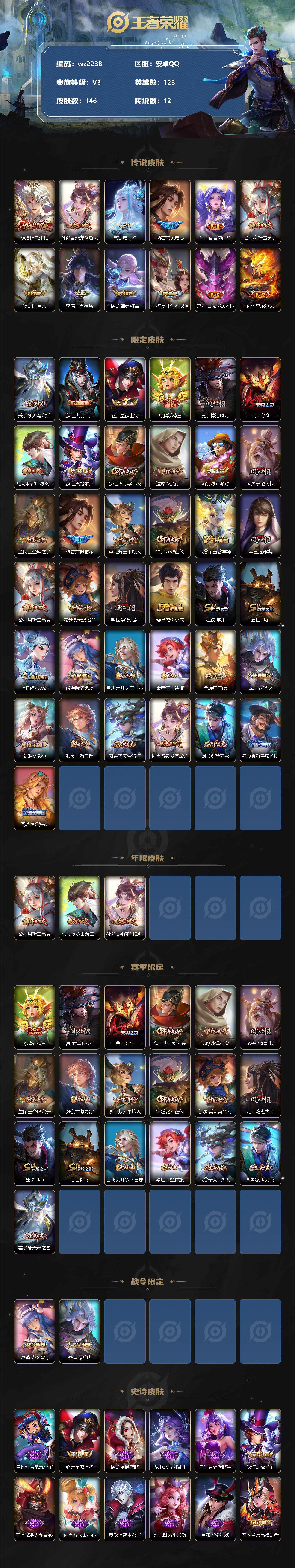 【游戏多多】【王者荣耀】【编号:3338857】【可二次实名】【wz2238】安卓Q-V3-尊贵铂金IV段位-123英雄-146皮肤-0典藏-0珍品无双-0无双-0珍品传说-12传说-30史诗 【英雄全皮】:金蝉全皮 【传说皮肤】:澜愿照九州拓,孙尚香乘龙问璇玑,露娜霜月吟,橘右京枫霜尽,孙尚香音你闪耀,公孙离祈雪灵祝,镜炽阳神光,李信一念神魔,貂蝉猫影幻舞,干将莫邪久胜战神,宫本武藏地狱之眼,孙悟空地狱火 【限定皮肤】:姜子牙天穹之誓,狄仁杰阴阳师,赵云皇家上将,孙膑妖精王,夏侯惇朔风刀,典韦穷奇,马可波罗山海玄木吟,狄仁杰魔术师,狄仁杰万华元夜,达摩沙漠行僧,项羽海滩派对,老夫子醍醐杖,兰陵王金庭之子,橘右京枫霜尽,李元芳云中旅人,钟馗驱傩正仪,鬼谷子五谷丰年,弈星混沌棋,公孙离祈雪灵祝,沈梦溪大漠名商,明世隐疑决卦,裴擒虎李小龙,狂铁御狮,盾山御銮,上官婉儿梁祝,嫦娥暖冬兔眠,鲁班大师探海日志,桑启海盐诗旅,金蝉唐三藏,暃星界游侠,艾琳女武神,张良古海寻踪,鬼谷子天穹祈灯,孙尚香乘龙问璇玑,刘邦剑破天穹,程咬金群星魔术团,周瑜熔金海岸 【年限皮肤】:公孙离祈雪灵祝,马可波罗山海玄木吟,孙尚香乘龙问璇玑 【赛季限定】:孙膑妖精王,夏侯惇朔风刀,典韦穷奇,狄仁杰万华元夜,达摩沙漠行僧,老夫子醍醐杖,兰陵王金庭之子,张良古海寻踪,李元芳云中旅人,钟馗驱傩正仪,弈星混沌棋,沈梦溪大漠名商,明世隐疑决卦,狂铁御狮,盾山御銮,鲁班大师探海日志,桑启海盐诗旅,鬼谷子天穹祈灯,刘邦剑破天穹,姜子牙天穹之誓 【战令限定】:嫦娥暖冬兔眠,暃星界游侠 【史诗皮肤】:鲁班七号电玩小子,赵云皇家上将,貂蝉圣诞恋歌,甄姬冰雪圆舞曲,王昭君偶像歌手,狄仁杰魔术师,宫本武藏鬼剑武藏,孙尚香水果甜心,嬴政暗夜贵公子,妲己魅力维加斯,吕布圣诞狂欢,花木兰水晶猎龙者,刘邦德古拉伯爵,小乔缤纷独角兽,亚瑟心灵战警,安琪拉心灵骇客,铠曙光守护者,蔡文姬舞动绿茵,阿轲节奏热浪,狄仁杰鹰眼统帅,上官婉儿梁祝,不知火舞魅语,裴擒虎李小龙,夏洛特永昼,金蝉唐三藏,鬼谷子五谷丰年,暃星界游侠,马可波罗山海玄木吟,阿轲化蝶舞,扁鹊灵蛊蚀心 【其他皮肤】:项羽海滩派对,韩信教廷特使,露娜哥特玫瑰,达摩大发明家,赵云忍炎影,芈月红桃皇后,艾琳女武神,程咬金星际陆战队,白起白色死神,牛魔西部大镖客,扁鹊化身博士,扁鹊救世之瞳,宫本武藏未来纪元,安琪拉玩偶对对碰,妲己少女阿狸,亚瑟死亡骑士,张飞五福同心,甄姬花好人间,狄仁杰阴阳师,刘备纽约教父,孙膑妖精王,刘备汉昭烈帝,关羽龙腾万里,钟无艳海滩丽影,王昭君幻想奇妙夜,典韦穷奇,诸葛亮掌控之力,李白敏锐之力,狂铁御狮,苏烈坚韧之力,大乔守护之力,明世隐虹云星官,小乔丁香结,吕布野性能量,盾山御銮,沈梦溪鲨炮海盗猫,夏侯惇朔风刀,弈星混沌棋,哪吒次元突破,鲁班七号黑桃队长,明世隐疑决卦,老夫子醍醐杖,狂铁特工战影,狄仁杰万华元夜,露娜瓷语鉴心,钟馗驱傩正仪,鲁班大师乓乓大师,达摩沙漠行僧,兰陵王金庭之子,刘禅唤灵魔甲,米莱狄契约魔法,沈梦溪大漠名商,蒙犽胡桃狂想曲,蒙恬蔚蓝守将,李元芳云中旅人,桑启海盐诗旅,嫦娥暖冬兔眠,海月幻泉雾影,猪八戒潮玩探月行,白起乐园追猎者,鲁班大师探海日志,张良古海寻踪,钟无艳聚星闪耀,鬼谷子天穹祈灯,刘邦剑破天穹,程咬金群星魔术团,姜子牙天穹之誓,周瑜熔金海岸,苍苍林狼骑,太乙真人谧流熔炉,姜子牙星梦巡礼,明世隐景韶洛都,戈娅玫蓝誓约,刘备浪漫序章,钟馗虚灵犬护,苏烈春野闲踪,张良灵野札记,阿古朵布丁狗之约,露娜命运加冕,鲁班七号福禄兄弟,花木兰剑舞者,老夫子潮流仙人,王昭君精灵公主,曹操超能战警,小乔万圣前夜,孙悟空西部大镖客,周瑜海军大将,后羿精灵王,兰陵王隐刃,李元芳特种部队,虞姬加勒比小姐,马可波罗激情绿茵,太乙真人圆桌骑士,梦奇美梦成真,女娲尼罗河女神,明世隐占星师,孙策海之征途,伽罗花见巫女,沈梦溪棒球奇才,李信灼热之刃,猪八戒年年有余,云缨赤焰之缨,金蝉前尘,桑启画中游 【内测皮肤】:艾琳女武神,狂铁特工战影 【营地ID】:1805842988