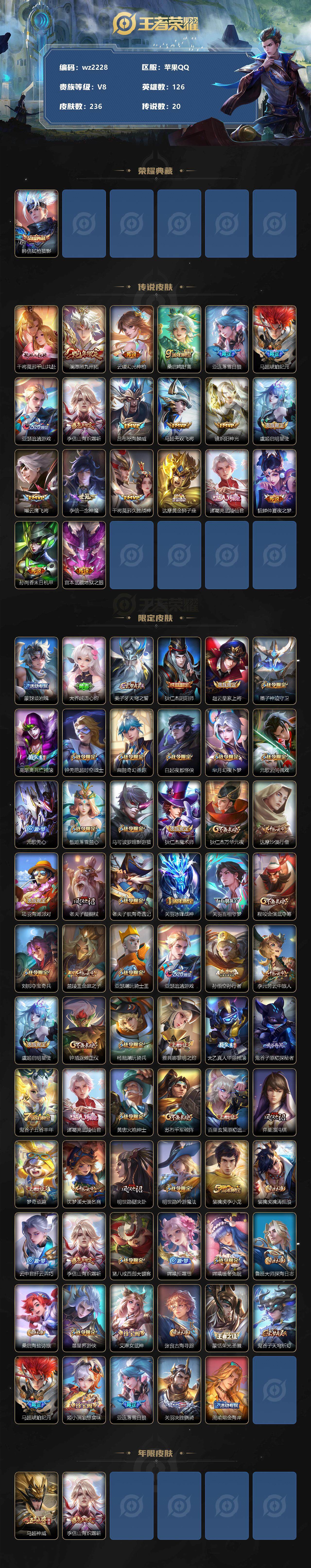 【游戏多多】【王者荣耀】【编号:3338869】【可二次实名】【wz2228】苹果Q-V8-最强王者段位-126英雄-236皮肤-1典藏-0珍品无双-0无双-0珍品传说-20传说-66史诗 【英雄全皮】:李信全皮,蒙恬全皮,空空儿全皮 【荣耀典藏】:韩信弑枪猎影 【传说皮肤】:干将莫邪千山共赴,澜愿照九州拓,云缨幻光神枪,桑启鸣野蒿,亚连落雪白狼,马超琥珀纪元,亚瑟追逃游戏,李信山海炽霜斩,吕布怒海麟威,马超无双飞将,镜炽阳神光,虞姬启明星使,曜云鹰飞将,李信一念神魔,干将莫邪久胜战神,达摩黄金狮子座,诸葛亮武陵仙君,貂蝉仲夏夜之梦,孙尚香末日机甲,宫本武藏地狱之眼 【限定皮肤】:蒙犽顽岩魄,大乔绒语心约,姜子牙天穹之誓,狄仁杰阴阳师,赵云皇家上将,墨子神迹守卫,高渐离死亡摇滚,钟无艳超时空战士,扁鹊奇幻香踪,白起夜都怪侠,芈月幻夜卜梦,元歌云间偶戏,元歌无心,甄姬落雪兰心,马可波罗暗影游猎,狄仁杰魔术师,狄仁杰万华元夜,达摩沙漠行僧,项羽海滩派对,老夫子醍醐杖,老夫子航海奇遇记,关羽冰锋战神,关羽百相守梦,程咬金演武夺筹,刘邦夺宝奇兵,兰陵王金庭之子,亚瑟潮玩骑士王,亚瑟追逃游戏,孙悟空孙行者,李元芳云中旅人,虞姬启明星使,钟馗驱傩正仪,杨戬潮玩骑兵,雅典娜黎明之约,太乙真人华丽摇滚,鬼谷子原初探秘者,鬼谷子五谷丰年,诸葛亮武陵仙君,黄忠火炮绅士,苏烈千军破阵,百里玄策原初追逐者,弈星混沌棋,梦奇顽趣,沈梦溪大漠名商,明世隐疑决卦,明世隐吟游魔法,裴擒虎李小龙,裴擒虎擒涛扼浪,云中君纤云弄巧,李信山海炽霜斩,猪八戒西部大镖客,嫦娥拒霜思,嫦娥暖冬兔眠,鲁班大师探海日志,桑启海盐诗旅,暃星界游侠,艾琳女武神,张良古海寻踪,蒙恬荣光圣徽,鬼谷子天穹祈灯,马超琥珀纪元,姬小满妄想食味,亚连落雪白狼,关羽决胜骁骑,周瑜熔金海岸 【年限皮肤】:马超神威,李信山海炽霜斩 【赛季限定】:狄仁杰万华元夜,达摩沙漠行僧,老夫子醍醐杖,程咬金演武夺筹,兰陵王金庭之子,张良古海寻踪,李元芳云中旅人,钟馗驱傩正仪,雅典娜黎明之约,鬼谷子原初探秘者,苏烈千军破阵,百里玄策原初追逐者,弈星混沌棋,梦奇顽趣,沈梦溪大漠名商,明世隐疑决卦,裴擒虎擒涛扼浪,鲁班大师探海日志,桑启海盐诗旅,鬼谷子天穹祈灯,蒙恬荣光圣徽,姜子牙天穹之誓 【战令限定】:墨子神迹守卫,钟无艳超时空战士,扁鹊奇幻香踪,白起夜都怪侠,芈月幻夜卜梦,元歌云间偶戏,甄姬落雪兰心,马可波罗暗影游猎,老夫子航海奇遇记,刘邦夺宝奇兵,亚瑟潮玩骑士王,杨戬潮玩骑兵,黄忠火炮绅士,明世隐吟游魔法,猪八戒西部大镖客,嫦娥暖冬兔眠,暃星界游侠 【史诗皮肤】:露娜紫霞仙子,赵云皇家上将,貂蝉圣诞恋歌,甄姬冰雪圆舞曲,狄仁杰魔术师,廉颇地狱岩魂,宫本武藏鬼剑武藏,孙尚香水果甜心,妲己魅力维加斯,墨子金属风暴,吕布圣诞狂欢,曹操幽灵船长,李白千年之狐,吕布末日机甲,张飞乱世虎臣,关羽冰锋战神,花木兰水晶猎龙者,刘邦德古拉伯爵,小乔缤纷独角兽,兰陵王暗隐猎兽者,百里守约特工魅影,刘禅天才门将,李元芳逐浪之夏,程咬金功夫厨神,白起星夜王子,阿轲节奏热浪,孙策猫狗日记,伽罗箭羽风息,狄仁杰鹰眼统帅,公孙离无限星赏官,娜可露露晚萤,不知火舞魅语,橘右京修罗,马超神威,马可波罗暗影游猎,百里玄策原初追逐者,裴擒虎李小龙,云中君纤云弄巧,元歌云间偶戏,老夫子航海奇遇记,孙悟空孙行者,司马懿暗渊魔法,嫦娥拒霜思,黄忠火炮绅士,雅典娜黎明之约,澜赏金猎手,明世隐吟游魔法,钟无艳超时空战士,鬼谷子五谷丰年,元歌无心,梦奇顽趣,暃星界游侠,扁鹊奇幻香踪,关羽百相守梦,周瑜雪夜绮愿,蒙恬荣光圣徽,姬小满妄想食味,关羽决胜骁骑,蒙犽顽岩魄,大司命东方月初,牛魔星界战将,弈星万物之道,狂铁龙之律动,周瑜百相守梦,黄忠百相守梦,公孙离涂山容容 【其他皮肤】:项羽海滩派对,韩信教廷特使,达摩大发明家,赵云忍炎影,芈月红桃皇后,艾琳女武神,白起白色死神,牛魔西部大镖客,扁鹊救世之瞳,安琪拉玩偶对对碰,孙膑天使之翼,姜子牙时尚教父,妲己少女阿狸,典韦黄金武士,亚瑟死亡骑士,花木兰兔女郎,甄姬花好人间,刘备万事如意,宫本武藏万象初新,后羿阿尔法小队,狄仁杰阴阳师,刘备纽约教父,高渐离死亡摇滚,刘备汉昭烈帝,关羽龙腾万里,王昭君幻想奇妙夜,狂铁命运角斗场,老夫子功夫老勺,牛魔制霸全明星,孙尚香沉稳之力,诸葛亮掌控之力,李白敏锐之力,鬼谷子幻乐之宴,太乙真人华丽摇滚,吕布野性能量,沈梦溪鲨炮海盗猫,姜子牙炽热元素使,弈星混沌棋,哪吒次元突破,明世隐疑决卦,刘邦夺宝奇兵,老夫子醍醐杖,猪八戒西部大镖客,鬼谷子原初探秘者,狄仁杰万华元夜,亚瑟潮玩骑士王,刘禅秘密基地,程咬金演武夺筹,张良缤纷绘卷,钟馗驱傩正仪,墨子神迹守卫,鲁班大师乓乓大师,苏烈千军破阵,达摩沙漠行僧,芈月幻夜卜梦,程咬金无双福将,白起夜都怪