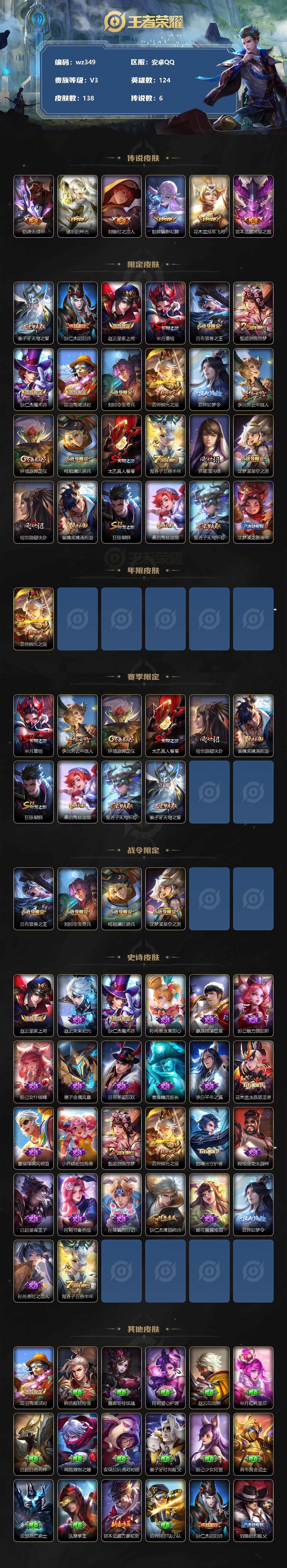 【游戏多多】【王者荣耀】【编号:3338895】【可二次实名】【wz349】【商品标题】:安卓Q-V3-至尊星耀II段位-124英雄-138皮肤-0典藏-0珍品无双-0无双-0珍品传说-6传说-26史诗 【传说皮肤】:铠绛天战甲,镜炽阳神光,刘备时之恋人,貂蝉猫影幻舞,花木兰冠军飞将,宫本武藏地狱之眼 【限定皮肤】:姜子牙天穹之誓,狄仁杰阴阳师,赵云皇家上将,芈月重明,吕布猎兽之王,甄姬游园惊梦,狄仁杰魔术师,项羽海滩派对,刘邦夺宝奇兵,后羿辉光之辰,后羿如梦令,李元芳云中旅人,钟馗驱傩正仪,杨戬潮玩骑兵,太乙真人饕餮,鬼谷子五谷丰年,弈星混沌棋,沈梦溪星空之诺,明世隐疑决卦,裴擒虎擒涛扼浪,狂铁御狮,桑启海盐诗旅,鬼谷子天穹祈灯,沈梦溪龙舞盛年 【年限皮肤】:后羿辉光之辰 【赛季限定】:芈月重明,李元芳云中旅人,钟馗驱傩正仪,太乙真人饕餮,弈星混沌棋,明世隐疑决卦,裴擒虎擒涛扼浪,狂铁御狮,桑启海盐诗旅,鬼谷子天穹祈灯,姜子牙天穹之誓 【战令限定】:吕布猎兽之王,刘邦夺宝奇兵,杨戬潮玩骑兵,沈梦溪星空之诺 【史诗皮肤】:赵云皇家上将,赵云未来纪元,狄仁杰魔术师,孙尚香水果甜心,嬴政摇滚巨星,妲己魅力维加斯,妲己女仆咖啡,墨子金属风暴,吕布圣诞狂欢,曹操幽灵船长,李白千年之狐,花木兰水晶猎龙者,夏侯惇乘风破浪,小乔缤纷独角兽,甄姬游园惊梦,后羿辉光之辰,铠曙光守护者,程咬金功夫厨神,白起星夜王子,阿轲节奏热浪,孙策猫狗日记,狄仁杰鹰眼统帅,娜可露露晚萤,后羿如梦令,孙尚香时之恋人,鬼谷子五谷丰年 【其他皮肤】:项羽海滩派对,韩信教廷特使,露娜哥特玫瑰,阿轲爱心护理,赵云忍炎影,芈月红桃皇后,白起白色死神,扁鹊救世之瞳,安琪拉玩偶对对碰,姜子牙时尚教父,妲己少女阿狸,典韦黄金武士,亚瑟死亡骑士,达摩拳王,宫本武藏万象初新,后羿阿尔法小队,狄仁杰阴阳师,刘备纽约教父,刘备汉昭烈帝,钟无艳海滩丽影,太乙真人饕餮,王昭君幻想奇妙夜,芈月重明,狂铁命运角斗场,老夫子功夫老勺,诸葛亮掌控之力,狂铁御狮,吕布猎兽之王,小乔丁香结,沈梦溪星空之诺,弈星混沌棋,哪吒次元突破,明世隐疑决卦,刘邦夺宝奇兵,刘禅秘密基地,钟馗驱傩正仪,蒙恬蔚蓝守将,李元芳云中旅人,桑启海盐诗旅,猪八戒潮玩探月行,白起乐园追猎者,赵怀真太极少年,裴擒虎擒涛扼浪,杨戬潮玩骑兵,鬼谷子天穹祈灯,廉颇功夫炙烤,沈梦溪龙舞盛年,姜子牙天穹之誓,太乙真人谧流熔炉,姜子牙星梦巡礼,明世隐景韶洛都,戈娅玫蓝誓约,刘备浪漫序章,鲁班七号福禄兄弟,鲁班七号木偶奇遇记,项羽帝国元帅,老夫子潮流仙人,狄仁杰锦衣卫,曹操死神来了,曹操超能战警,张良一千零一夜,小乔万圣前夜,孙膑未来旅行,孙悟空西部大镖客,周瑜海军大将,后羿精灵王,刘禅英喵野望,兰陵王隐刃,李元芳特种部队,刘邦圣殿之光,虞姬加勒比小姐,蔡文姬蔷薇王座,夏侯惇战争骑士,雅典娜战争女神,苍维京掠夺者,杨戬埃及法老,太乙真人圆桌骑士,诸葛亮星航指挥官,东皇太一东海龙王,铠龙域领主,百里守约绝影神枪,百里玄策威尼斯狂欢,苏烈爱与和平,梦奇美梦成真,女娲尼罗河女神,明世隐占星师,公孙离花间舞,裴擒虎街头旋风,孙策海之征途,伽罗花见巫女,沈梦溪棒球奇才,李信灼热之刃,嫦娥露花倒影,盘古创世神祝,瑶森,马超幸存者,西施归虚梦演,鲁班大师归虚梦演,蒙犽归虚梦演,镜冰刃幻境,蒙恬秩序猎龙将,阿古朵熊喵少女,澜孤猎,司空震启蛰,云缨赤焰之缨,暃碧珀绯影 【营地ID】:545823290