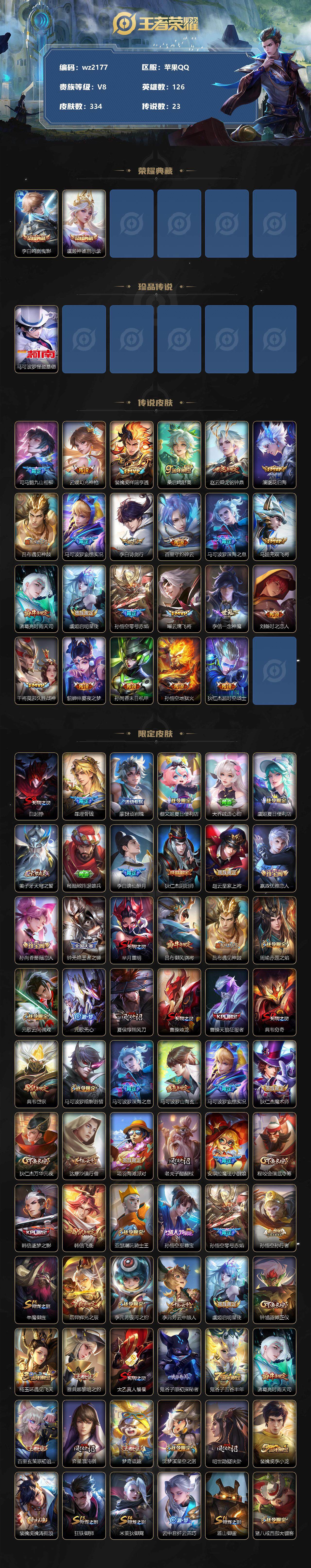 【游戏多多】【王者荣耀】【编号:3338901】【可二次实名】【wz2177】苹果Q-V8-永恒钻石III段位-126英雄-334皮肤-2典藏-0珍品无双-0无双-1珍品传说-23传说-97史诗 【英雄全皮】:司马懿全皮,空空儿全皮,影全皮 【荣耀典藏】:李白鸣剑曳影,虞姬神鉴启示录 【珍品传说】:马可波罗怪盗基德 【传说皮肤】:司马懿九山相柳,云缨幻光神枪,裴擒虎祥瑞亨通,桑启鸣野蒿,赵云乘龙铭钟鼎,澜逐花归海,吕布遇见神鼓,马可波罗妄想实况,李白诗剑行,百里守约碎云,马可波罗深海之息,马超无双飞将,诸葛亮时雨天司,虞姬启明星使,孙悟空零号赤焰,曜云鹰飞将,李信一念神魔,刘备时之恋人,干将莫邪久胜战神,貂蝉仲夏夜之梦,孙尚香末日机甲,孙悟空地狱火,狄仁杰超时空战士 【限定皮肤】:白起狰,暃埋骨钱,蒙犽顽岩魄,蔡文姬夏日便利店,大乔绒语心约,虞姬夏日便利店,姜子牙天穹之誓,杨戬破阵退雄兵,李白谪仙醉月,狄仁杰阴阳师,赵云皇家上将,嬴政优雅恋人,孙尚香蔷薇恋人,钟无艳王者之锤,芈月重明,吕布御风骁将,吕布遇见神鼓,周瑜赤莲之焰,元歌云间偶戏,元歌无心,夏侯惇朔风刀,曹操烛龙,曹操天狼征服者,典韦穷奇,典韦岱宗,马可波罗暗影游猎,马可波罗深海之息,马可波罗山海玄木吟,马可波罗妄想实况,狄仁杰魔术师,狄仁杰万华元夜,达摩沙漠行僧,项羽海滩派对,老夫子醍醐杖,安琪拉魔法小厨娘,程咬金演武夺筹,韩信逐梦之影,韩信飞衡,亚瑟潮玩骑士王,孙悟空至尊宝,孙悟空零号赤焰,孙悟空孙行者,牛魔御旌,后羿辉光之辰,李元芳银河之约,李元芳云中旅人,虞姬启明星使,钟馗驱傩正仪,杨玉环遇见飞天,雅典娜黎明之约,太乙真人饕餮,鬼谷子原初探秘者,鬼谷子五谷丰年,诸葛亮时雨天司,百里玄策原初追逐者,弈星混沌棋,梦奇顽趣,沈梦溪星空之诺,明世隐疑决卦,裴擒虎李小龙,裴擒虎擒涛扼浪,狂铁御狮,米莱狄御霄,云中君纤云弄巧,盾山御銮,猪八戒西部大镖客,上官婉儿梁祝,嫦娥拒霜思,西施玲珑珍味,鲁班大师探海日志,桑启海盐诗旅,戈娅驭风魔法,艾琳流音漫舞,司空震地狱燃心,阿古朵江河有灵,张良古海寻踪,蒙犽百解令,蒙恬荣光圣徽,高渐离燃音魔法,妲己灵卜魔法,鬼谷子天穹祈灯,伽罗琥珀纪元,赵云乘龙铭钟鼎,沈梦溪龙舞盛年,刘邦剑破天穹,程咬金群星魔术团,镜青焰无极,项羽苍威无极,刘备异域游侠,芈月浮光幕影,周瑜熔金海岸 【年限皮肤】:后羿辉光之辰,吕布御风骁将,诸葛亮时雨天司,韩信飞衡,典韦岱宗,马可波罗山海玄木吟,赵云乘龙铭钟鼎 【赛季限定】:白起狰,芈月重明,夏侯惇朔风刀,曹操烛龙,典韦穷奇,狄仁杰万华元夜,达摩沙漠行僧,老夫子醍醐杖,程咬金演武夺筹,张良古海寻踪,牛魔御旌,李元芳云中旅人,钟馗驱傩正仪,雅典娜黎明之约,太乙真人饕餮,鬼谷子原初探秘者,百里玄策原初追逐者,弈星混沌棋,梦奇顽趣,明世隐疑决卦,裴擒虎擒涛扼浪,狂铁御狮,米莱狄御霄,盾山御銮,鲁班大师探海日志,桑启海盐诗旅,鬼谷子天穹祈灯,蒙恬荣光圣徽,刘邦剑破天穹,姜子牙天穹之誓 【战令限定】:蔡文姬夏日便利店,虞姬夏日便利店,周瑜赤莲之焰,元歌云间偶戏,马可波罗暗影游猎,艾琳流音漫舞,亚瑟潮玩骑士王,李元芳银河之约,沈梦溪星空之诺,猪八戒西部大镖客,西施玲珑珍味,司空震地狱燃心,戈娅驭风魔法,高渐离燃音魔法,妲己灵卜魔法,镜青焰无极,项羽苍威无极 【史诗皮肤】:鲁班七号电玩小子,项羽苍穹之光,露娜紫霞仙子,钟无艳王者之锤,赵云皇家上将,赵云未来纪元,貂蝉圣诞恋歌,甄姬冰雪圆舞曲,王昭君偶像歌手,狄仁杰魔术师,宫本武藏鬼剑武藏,孙尚香蔷薇恋人,孙尚香水果甜心,嬴政优雅恋人,嬴政摇滚巨星,妲己女仆咖啡,墨子金属风暴,吕布圣诞狂欢,刘禅绅士熊喵,曹操幽灵船长,李白千年之狐,安琪拉魔法小厨娘,张飞乱世虎臣,孙悟空至尊宝,花木兰水晶猎龙者,刘邦德古拉伯爵,韩信逐梦之影,夏侯惇乘风破浪,小乔缤纷独角兽,兰陵王暗隐猎兽者,诸葛亮黄金分割率,亚瑟心灵战警,雅典娜冰冠公主,安琪拉心灵骇客,后羿辉光之辰,百里守约特工魅影,铠曙光守护者,李元芳逐浪之夏,程咬金功夫厨神,白起星夜王子,阿轲节奏热浪,杨玉环遇见飞天,孙策猫狗日记,大乔猫狗日记,狄仁杰鹰眼统帅,上官婉儿梁祝,曹操天狼征服者,李元芳银河之约,韩信飞衡,典韦岱宗,小乔青蛇,橘右京修罗,马可波罗暗影游猎,百里玄策原初追逐者,裴擒虎李小龙,云中君纤云弄巧,元歌云间偶戏,吕布御风骁将,百里玄策热力回旋,杨戬天秀启明,孙悟空孙行者,司马懿暗渊魔法,嫦娥拒霜思,雅典娜黎明之约,夏洛特永昼,澜赏金猎手,鬼谷子五谷丰年,元歌无心,梦奇顽趣,马可波罗山海玄木吟,戈娅驭风魔法,莱西奥末日机甲,司空震地狱燃心,阿古朵江河有灵,蒙犽百解令,妲己灵卜魔法,高渐离燃音魔法,蒙恬荣光圣徽,伽罗琥珀纪元,镜青焰无极,黄忠怒海争锋,芈月浮光幕影,蔡文姬夏日便利店,蒙