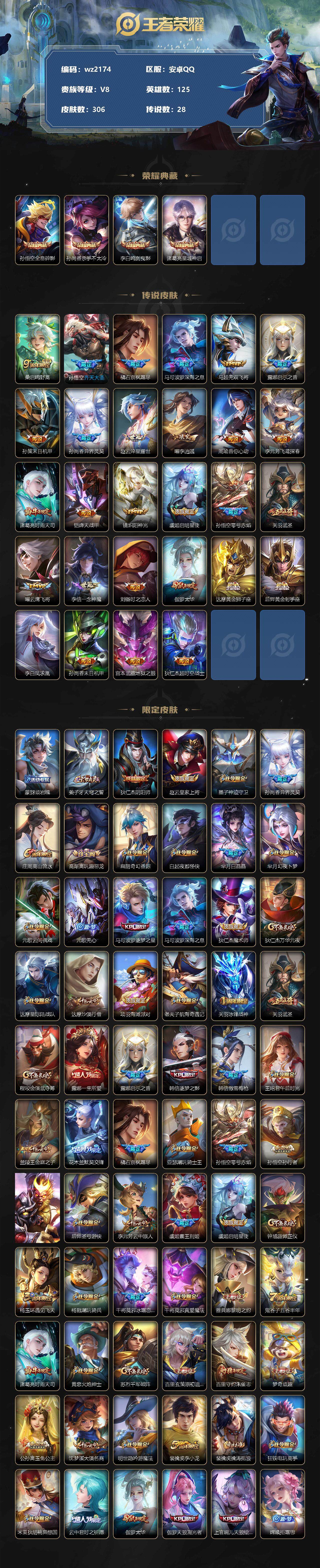 【游戏多多】【王者荣耀】【编号:3338902】【可二次实名】【wz2174】安卓Q-V8-永恒钻石IV段位-125英雄-306皮肤-4典藏-0珍品无双-0无双-0珍品传说-28传说-104史诗 【英雄全皮】:橘右京全皮,空空儿全皮,影全皮 【荣耀典藏】:孙悟空全息碎影,孙尚香杀手不太冷,李白鸣剑曳影,诸葛亮星域神启 【传说皮肤】:桑启鸣野蒿,孙悟空齐天大圣,橘右京枫霜尽,马可波罗深海之息,马超无双飞将,露娜启示之音,孙策末日机甲,孙尚香异界灵契,赵云淬星耀世,曜李逍遥 ,周瑜音你心动,李元芳飞鸢探春,诸葛亮时雨天司,铠绛天战甲,镜炽阳神光,虞姬启明星使,孙悟空零号赤焰,关羽武圣,曜云鹰飞将,李信一念神魔,刘备时之恋人,伽罗太华,达摩黄金狮子座,后羿黄金射手座,李白凤求凰,孙尚香末日机甲,宫本武藏地狱之眼,狄仁杰超时空战士 【限定皮肤】:蒙犽顽岩魄,姜子牙天穹之誓,狄仁杰阴阳师,赵云皇家上将,墨子神迹守卫,孙尚香异界灵契,庄周高山流水,高渐离玩趣恶龙,扁鹊奇幻香踪,白起夜都怪侠,芈月白晶晶,芈月幻夜卜梦,元歌云间偶戏,元歌无心,马可波罗逐梦之星,马可波罗深海之息,狄仁杰魔术师,狄仁杰万华元夜,达摩星际陆战队,达摩沙漠行僧,项羽海滩派对,老夫子航海奇遇记,关羽冰锋战神,关羽武圣,程咬金演武夺筹,露娜一生所爱,露娜启示之音,韩信逐梦之影,韩信傲雪梅枪,王昭君午后时光,兰陵王金庭之子,花木兰默契交锋,橘右京枫霜尽,亚瑟潮玩骑士王,孙悟空零号赤焰,孙悟空孙行者,孙悟空齐天大圣,后羿圣弓游侠,李元芳云中旅人,虞姬霸王别姬,虞姬启明星使,钟馗驱傩正仪,杨玉环遇见飞天,杨戬潮玩骑兵,干将莫邪冰霜恋舞曲,干将莫邪真爱魔法,雅典娜黎明之约,鬼谷子五谷丰年,诸葛亮时雨天司,黄忠火炮绅士,苏烈千军破阵,百里玄策原初追逐者,百里守约朱雀志,梦奇顽趣,公孙离玉兔公主,沈梦溪大漠名商,明世隐吟游魔法,裴擒虎李小龙,裴擒虎擒涛扼浪,狂铁电玩高手,米莱狄胡桃异想国,云中君时之祈愿,伽罗太华,伽罗天狼溯光者,上官婉儿天狼绘梦者,嫦娥拒霜思,曜李逍遥 ,蒙犽狂想玩偶喵,鲁班大师探海日志,桑启海盐诗旅,艾琳女武神,艾琳流音漫舞,司空震地狱燃心,阿古朵江河有灵,张良古海寻踪,蒙犽百解令,蒙恬荣光圣徽,高渐离燃音魔法,妲己灵卜魔法,鬼谷子天穹祈灯,百里玄策超元猎域,沈梦溪龙舞盛年,刘邦剑破天穹,程咬金群星魔术团,周瑜熔金海岸 【年限皮肤】:百里守约朱雀志,李白凤求凰,诸葛亮时雨天司,伽罗太华,马超神威,关羽武圣 【赛季限定】:狄仁杰万华元夜,达摩沙漠行僧,程咬金演武夺筹,兰陵王金庭之子,张良古海寻踪,李元芳云中旅人,钟馗驱傩正仪,雅典娜黎明之约,苏烈千军破阵,百里玄策原初追逐者,梦奇顽趣,沈梦溪大漠名商,裴擒虎擒涛扼浪,鲁班大师探海日志,桑启海盐诗旅,鬼谷子天穹祈灯,蒙恬荣光圣徽,刘邦剑破天穹,姜子牙天穹之誓 【战令限定】:墨子神迹守卫,扁鹊奇幻香踪,白起夜都怪侠,芈月幻夜卜梦,元歌云间偶戏,达摩星际陆战队,老夫子航海奇遇记,王昭君午后时光,艾琳流音漫舞,亚瑟潮玩骑士王,后羿圣弓游侠,杨戬潮玩骑兵,干将莫邪真爱魔法,黄忠火炮绅士,明世隐吟游魔法,狂铁电玩高手,米莱狄胡桃异想国,蒙犽狂想玩偶喵,司空震地狱燃心,高渐离燃音魔法,妲己灵卜魔法 【史诗皮肤】:鲁班七号电玩小子,项羽苍穹之光,露娜紫霞仙子,阿轲暗夜猫娘,赵云皇家上将,赵云未来纪元,貂蝉圣诞恋歌,甄姬冰雪圆舞曲,王昭君偶像歌手,狄仁杰魔术师,廉颇地狱岩魂,宫本武藏鬼剑武藏,孙尚香水果甜心,嬴政暗夜贵公子,嬴政摇滚巨星,妲己魅力维加斯,妲己女仆咖啡,墨子金属风暴,吕布圣诞狂欢,刘禅绅士熊喵,曹操幽灵船长,李白千年之狐,吕布末日机甲,张飞乱世虎臣,虞姬霸王别姬,关羽冰锋战神,花木兰水晶猎龙者,刘邦德古拉伯爵,韩信逐梦之影,夏侯惇乘风破浪,小乔缤纷独角兽,兰陵王暗隐猎兽者,诸葛亮黄金分割率,马可波罗逐梦之星,亚瑟心灵战警,雅典娜冰冠公主,安琪拉心灵骇客,百里守约特工魅影,铠曙光守护者,蔡文姬舞动绿茵,刘禅天才门将,李元芳逐浪之夏,程咬金功夫厨神,白起星夜王子,阿轲节奏热浪,杨玉环遇见飞天,孙策猫狗日记,大乔猫狗日记,百里守约朱雀志,干将莫邪冰霜恋舞曲,露娜一生所爱,伽罗箭羽风息,狄仁杰鹰眼统帅,公孙离无限星赏官,娜可露露晚萤,橘右京修罗,马超神威,孙尚香时之恋人,上官婉儿天狼绘梦者,蒙犽狂想玩偶喵,百里玄策原初追逐者,裴擒虎李小龙,元歌云间偶戏,芈月白晶晶,花木兰默契交锋,米莱狄胡桃异想国,西施诗语江南,百里玄策热力回旋,蒙犽龙鼓争鸣,老夫子航海奇遇记,伽罗天狼溯光者,干将莫邪真爱魔法,沈梦溪月团寄思,安琪拉时之奇旅,孙悟空孙行者,庄周高山流水,司马懿暗渊魔法,嫦娥拒霜思,黄忠火炮绅士,雅典娜黎明之约,韩信傲雪梅枪,云中君时之祈愿,公孙离玉兔公主,澜赏金猎手,明世隐吟游魔法,