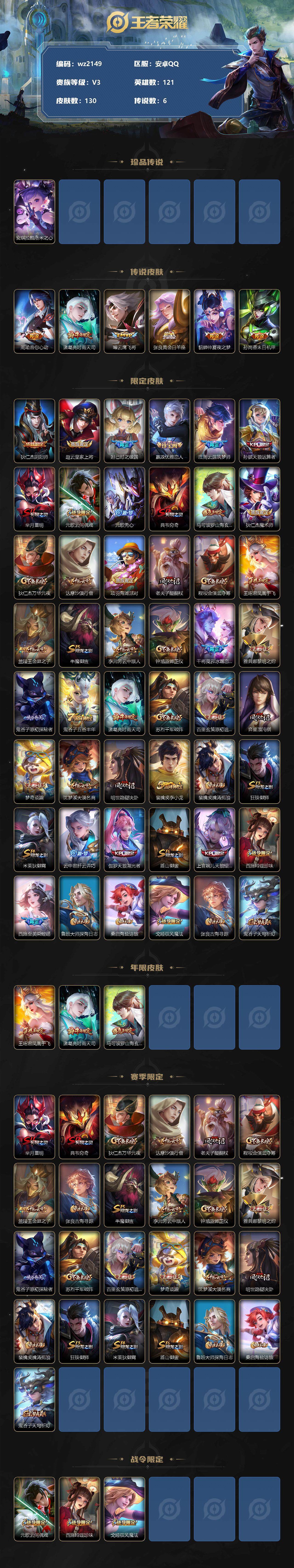 【游戏多多】【王者荣耀】【编号:3338922】【可二次实名】【wz2149】安卓Q-V3-尊贵铂金III段位-121英雄-130皮肤-0典藏-0珍品无双-0无双-1珍品传说-6传说-42史诗 【珍品传说】:安琪拉酷洛米之心 【传说皮肤】:周瑜音你心动,诸葛亮时雨天司,曜云鹰飞将,张良黄金白羊座,貂蝉仲夏夜之梦,孙尚香末日机甲 【限定皮肤】:狄仁杰阴阳师,赵云皇家上将,妲己时之彼端,嬴政优雅恋人,庄周云端筑梦师,孙膑天狼运算者,芈月重明,元歌云间偶戏,元歌无心,典韦穷奇,马可波罗山海玄木吟,狄仁杰魔术师,狄仁杰万华元夜,达摩沙漠行僧,项羽海滩派对,老夫子醍醐杖,程咬金演武夺筹,王昭君凤凰于飞,兰陵王金庭之子,牛魔御旌,李元芳云中旅人,钟馗驱傩正仪,干将莫邪冰霜恋舞曲,雅典娜黎明之约,鬼谷子原初探秘者,鬼谷子五谷丰年,诸葛亮时雨天司,苏烈千军破阵,百里玄策原初追逐者,弈星混沌棋,梦奇顽趣,沈梦溪大漠名商,明世隐疑决卦,裴擒虎李小龙,裴擒虎擒涛扼浪,狂铁御狮,米莱狄御霄,云中君纤云弄巧,伽罗天狼溯光者,盾山御銮,上官婉儿天狼绘梦者,西施玲珑珍味,西施至美乘鲤谣,鲁班大师探海日志,桑启海盐诗旅,戈娅驭风魔法,张良古海寻踪,鬼谷子天穹祈灯 【年限皮肤】:王昭君凤凰于飞,诸葛亮时雨天司,马可波罗山海玄木吟 【赛季限定】:芈月重明,典韦穷奇,狄仁杰万华元夜,达摩沙漠行僧,老夫子醍醐杖,程咬金演武夺筹,兰陵王金庭之子,张良古海寻踪,牛魔御旌,李元芳云中旅人,钟馗驱傩正仪,雅典娜黎明之约,鬼谷子原初探秘者,苏烈千军破阵,百里玄策原初追逐者,弈星混沌棋,梦奇顽趣,沈梦溪大漠名商,明世隐疑决卦,裴擒虎擒涛扼浪,狂铁御狮,米莱狄御霄,盾山御銮,鲁班大师探海日志,桑启海盐诗旅,鬼谷子天穹祈灯 【战令限定】:元歌云间偶戏,西施玲珑珍味,戈娅驭风魔法 【史诗皮肤】:露娜紫霞仙子,赵云皇家上将,貂蝉圣诞恋歌,甄姬冰雪圆舞曲,狄仁杰魔术师,孙尚香水果甜心,嬴政优雅恋人,妲己魅力维加斯,墨子龙骑士,墨子金属风暴,张飞乱世虎臣,王昭君凤凰于飞,小乔缤纷独角兽,安琪拉心灵骇客,庄周云端筑梦师,蔡文姬舞动绿茵,刘禅天才门将,白起星夜王子,大乔猫狗日记,干将莫邪冰霜恋舞曲,狄仁杰鹰眼统帅,公孙离无限星赏官,娜可露露晚萤,妲己时之彼端,瑶遇见神鹿,上官婉儿天狼绘梦者,百里玄策原初追逐者,裴擒虎李小龙,云中君纤云弄巧,孙膑天狼运算者,元歌云间偶戏,西施诗语江南,伽罗天狼溯光者,司马懿暗渊魔法,雅典娜黎明之约,鬼谷子五谷丰年,元歌无心,梦奇顽趣,马可波罗山海玄木吟,戈娅驭风魔法,西施至美乘鲤谣,狂铁龙之律动 【其他皮肤】:项羽海滩派对,赵云忍炎影,扁鹊化身博士,宫本武藏未来纪元,姜子牙时尚教父,妲己少女阿狸,亚瑟死亡骑士,达摩拳王,花木兰兔女郎,张飞五福同心,甄姬花好人间,刘备万事如意,后羿阿尔法小队,狄仁杰阴阳师,刘备汉昭烈帝,关羽龙腾万里,宫本武藏霸王丸,芈月重明,孙尚香沉稳之力,典韦穷奇,狂铁御狮,大乔守护之力,米莱狄御霄,明世隐虹云星官,牛魔御旌,盾山御銮,孙膑归虚梦演,沈梦溪鲨炮海盗猫,姜子牙炽热元素使,弈星混沌棋,明世隐疑决卦,盾山圆桌骑士,老夫子醍醐杖,鬼谷子原初探秘者,狄仁杰万华元夜,刘禅秘密基地,程咬金演武夺筹,钟馗驱傩正仪,鲁班大师乓乓大师,苏烈千军破阵,达摩沙漠行僧,程咬金无双福将,兰陵王金庭之子,沈梦溪大漠名商,李元芳云中旅人,桑启海盐诗旅,海月幻泉雾影,猪八戒潮玩探月行,裴擒虎擒涛扼浪,鲁班大师探海日志,西施玲珑珍味,张良古海寻踪,鬼谷子天穹祈灯,廉颇功夫炙烤,张良灵野札记,狄仁杰锦衣卫,小乔万圣前夜,孙膑未来旅行,兰陵王隐刃,钟馗地府判官,李元芳特种部队,诸葛亮星航指挥官,大乔伊势巫女,东皇太一东海龙王,百里玄策威尼斯狂欢,杨玉环霓裳曲,裴擒虎街头旋风,弈星踏雪寻梅,元歌午夜歌剧院,司马懿魇语军师,伽罗花见巫女,沈梦溪棒球奇才,嫦娥露花倒影,瑶森,曜归虚梦演,西施归虚梦演,鲁班大师归虚梦演,镜冰刃幻境,澜孤猎,司空震启蛰,云缨赤焰之缨 【内测皮肤】:嬴政优雅恋人 【营地ID】:372095838