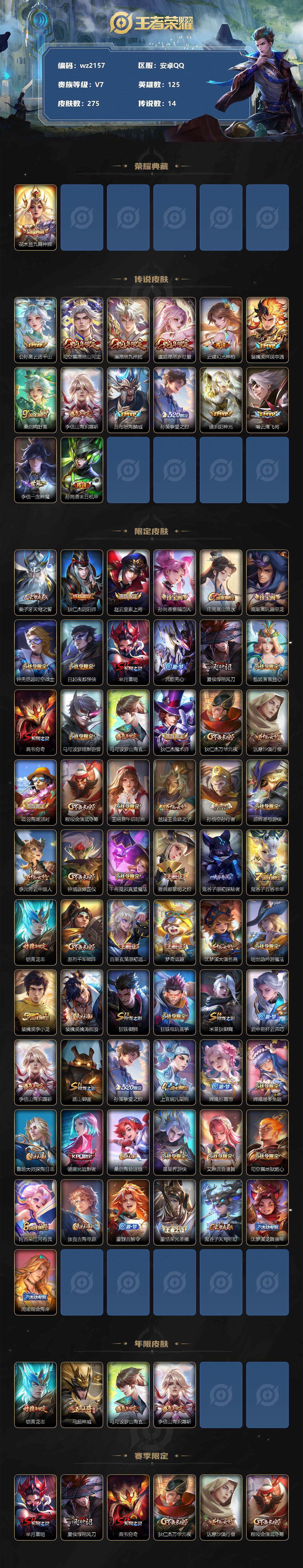 【游戏多多】【王者荣耀】【编号:3338933】【可二次实名】【wz2157】安卓Q-V7-至尊星耀IV段位-125英雄-275皮肤-1典藏-0珍品无双-0无双-0珍品传说-14传说-82史诗 【英雄全皮】:李信全皮,蒙恬全皮,司空震全皮 【荣耀典藏】:花木兰九霄神辉 【传说皮肤】:公孙离云诺千山,司空震愿照山河定,澜愿照九州拓,虞姬愿照岁时盈,云缨幻光神枪,裴擒虎祥瑞亨通,桑启鸣野蒿,李信山海炽霜斩,吕布怒海麟威,孙策挚爱之约,镜炽阳神光,曜云鹰飞将,李信一念神魔,孙尚香末日机甲 【限定皮肤】:姜子牙天穹之誓,狄仁杰阴阳师,赵云皇家上将,孙尚香蔷薇恋人,庄周高山流水,高渐离玩趣恶龙,钟无艳超时空战士,白起夜都怪侠,芈月重明,元歌无心,夏侯惇朔风刀,甄姬落雪兰心,典韦穷奇,马可波罗暗影游猎,马可波罗山海玄木吟,狄仁杰魔术师,狄仁杰万华元夜,达摩沙漠行僧,项羽海滩派对,程咬金演武夺筹,王昭君午后时光,兰陵王金庭之子,孙悟空孙行者,后羿圣弓游侠,李元芳云中旅人,钟馗驱傩正仪,干将莫邪真爱魔法,雅典娜黎明之约,鬼谷子原初探秘者,鬼谷子五谷丰年,铠青龙志,苏烈千军破阵,百里玄策原初追逐者,梦奇顽趣,沈梦溪大漠名商,明世隐吟游魔法,裴擒虎李小龙,裴擒虎擒涛扼浪,狂铁御狮,狂铁电玩高手,米莱狄御霄,云中君纤云弄巧,李信山海炽霜斩,盾山御銮,孙策挚爱之约,上官婉儿梁祝,嫦娥拒霜思,嫦娥暖冬兔眠,鲁班大师探海日志,镜匿光追影者,桑启海盐诗旅,暃星界游侠,艾琳流音漫舞,司空震地狱燃心,阿古朵江河有灵,张良古海寻踪,蒙犽百解令,蒙恬荣光圣徽,鬼谷子天穹祈灯,沈梦溪龙舞盛年,周瑜熔金海岸 【年限皮肤】:铠青龙志,马超神威,马可波罗山海玄木吟,李信山海炽霜斩 【赛季限定】:芈月重明,夏侯惇朔风刀,典韦穷奇,狄仁杰万华元夜,达摩沙漠行僧,程咬金演武夺筹,兰陵王金庭之子,张良古海寻踪,李元芳云中旅人,钟馗驱傩正仪,雅典娜黎明之约,鬼谷子原初探秘者,苏烈千军破阵,百里玄策原初追逐者,梦奇顽趣,沈梦溪大漠名商,裴擒虎擒涛扼浪,狂铁御狮,米莱狄御霄,盾山御銮,鲁班大师探海日志,桑启海盐诗旅,鬼谷子天穹祈灯,蒙恬荣光圣徽,姜子牙天穹之誓 【战令限定】:钟无艳超时空战士,白起夜都怪侠,甄姬落雪兰心,马可波罗暗影游猎,王昭君午后时光,艾琳流音漫舞,后羿圣弓游侠,干将莫邪真爱魔法,明世隐吟游魔法,狂铁电玩高手,嫦娥暖冬兔眠,司空震地狱燃心,暃星界游侠 【史诗皮肤】:鲁班七号电玩小子,露娜紫霞仙子,阿轲暗夜猫娘,赵云皇家上将,赵云未来纪元,貂蝉圣诞恋歌,甄姬冰雪圆舞曲,狄仁杰魔术师,廉颇地狱岩魂,宫本武藏鬼剑武藏,孙尚香蔷薇恋人,孙尚香水果甜心,妲己女仆咖啡,墨子金属风暴,吕布圣诞狂欢,刘禅绅士熊喵,曹操幽灵船长,李白千年之狐,吕布末日机甲,张飞乱世虎臣,花木兰水晶猎龙者,刘邦德古拉伯爵,夏侯惇乘风破浪,小乔缤纷独角兽,兰陵王暗隐猎兽者,诸葛亮黄金分割率,亚瑟心灵战警,雅典娜冰冠公主,安琪拉心灵骇客,百里守约特工魅影,铠曙光守护者,蔡文姬舞动绿茵,刘禅天才门将,李元芳逐浪之夏,白起星夜王子,阿轲节奏热浪,大乔猫狗日记,铠青龙志,狄仁杰鹰眼统帅,上官婉儿梁祝,不知火舞魅语,橘右京修罗,马超神威,马可波罗暗影游猎,百里玄策原初追逐者,裴擒虎李小龙,云中君纤云弄巧,杨戬天秀启明,干将莫邪真爱魔法,孙悟空孙行者,庄周高山流水,嫦娥拒霜思,镜匿光追影者,雅典娜黎明之约,夏洛特永昼,澜赏金猎手,明世隐吟游魔法,狂铁电玩高手,钟无艳超时空战士,鬼谷子五谷丰年,元歌无心,梦奇顽趣,暃星界游侠,马可波罗山海玄木吟,刘禅电玩爆裂旋风,司空震地狱燃心,阿古朵江河有灵,蒙犽百解令,蒙恬荣光圣徽,亚连破空之剑,艾琳陌上桑,百里守约百相守梦,牛魔星界战将,孙膑茶境仙,赵怀真器灵浮梦炉,亚连糖绘人间,狄仁杰绮世丹青,芈月瑰影绮梦,阿轲化蝶舞,狂铁龙之律动,西施织梦人,公孙离涂山容容 【其他皮肤】:项羽海滩派对,韩信教廷特使,韩信街头霸王,露娜哥特玫瑰,达摩大发明家,赵云白执事,赵云忍炎影,芈月红桃皇后,白起白色死神,扁鹊化身博士,宫本武藏未来纪元,安琪拉玩偶对对碰,孙膑天使之翼,妲己少女阿狸,亚瑟死亡骑士,达摩拳王,花木兰兔女郎,甄姬花好人间,刘备万事如意,后羿阿尔法小队,狄仁杰阴阳师,刘备纽约教父,刘备汉昭烈帝,关羽龙腾万里,墨子进击墨子号,钟无艳海滩丽影,芈月重明,老夫子功夫老勺,孙尚香沉稳之力,典韦穷奇,诸葛亮掌控之力,李白敏锐之力,鬼谷子幻乐之宴,狂铁御狮,苏烈坚韧之力,大乔守护之力,米莱狄御霄,明世隐虹云星官,庄周奇妙博物学,小乔丁香结,吕布野性能量,盾山御銮,孙膑归虚梦演,高渐离玩趣恶龙,沈梦溪鲨炮海盗猫,姜子牙炽热元素使,夏侯惇朔风刀,哪吒次元突破,盾山圆桌骑士,狂铁特工战影,鬼谷子原初探秘者,狄仁杰万华元夜,刘禅秘密基地,露娜瓷语鉴心,程咬