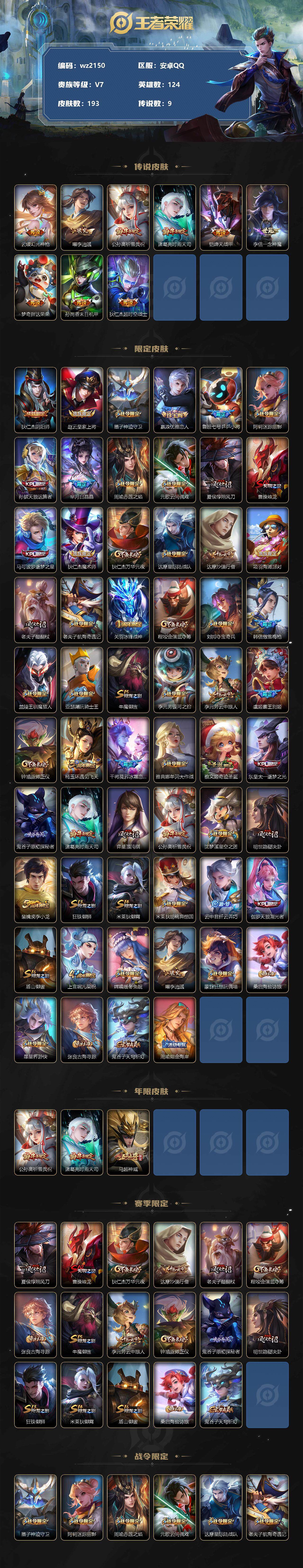 【游戏多多】【王者荣耀】【编号:3338940】【可二次实名】【wz2150】安卓Q-V7-最强王者段位-124英雄-193皮肤-0典藏-0珍品无双-0无双-0珍品传说-9传说-58史诗 【传说皮肤】:云缨幻光神枪,曜李逍遥 ,公孙离祈雪灵祝,诸葛亮时雨天司,铠绛天战甲,李信一念神魔,梦奇胖达荣荣,孙尚香末日机甲,狄仁杰超时空战士 【限定皮肤】:狄仁杰阴阳师,赵云皇家上将,墨子神迹守卫,嬴政优雅恋人,鲁班七号乒乒小将,阿轲迷踪丽影,孙膑天狼运算者,芈月白晶晶,周瑜赤莲之焰,元歌云间偶戏,夏侯惇朔风刀,曹操烛龙,马可波罗逐梦之星,狄仁杰魔术师,狄仁杰万华元夜,达摩星际陆战队,达摩沙漠行僧,项羽海滩派对,老夫子醍醐杖,老夫子航海奇遇记,关羽冰锋战神,程咬金演武夺筹,刘邦夺宝奇兵,韩信傲雪梅枪,兰陵王驯魔猎人,亚瑟潮玩骑士王,牛魔御旌,李元芳银河之约,李元芳云中旅人,虞姬霸王别姬,钟馗驱傩正仪,杨玉环遇见飞天,干将莫邪冰霜恋舞曲,雅典娜单词大作战,蔡文姬奇迹圣诞,东皇太一逐梦之光,鬼谷子原初探秘者,诸葛亮时雨天司,弈星混沌棋,公孙离祈雪灵祝,沈梦溪星空之诺,明世隐疑决卦,裴擒虎李小龙,狂铁御狮,米莱狄御霄,米莱狄胡桃异想国,云中君纤云弄巧,伽罗天狼溯光者,盾山御銮,上官婉儿梁祝,嫦娥暖冬兔眠,曜李逍遥 ,蒙犽狂想玩偶喵,桑启海盐诗旅,暃星界游侠,张良古海寻踪,鬼谷子天穹祈灯,周瑜熔金海岸 【年限皮肤】:公孙离祈雪灵祝,诸葛亮时雨天司,马超神威 【赛季限定】:夏侯惇朔风刀,曹操烛龙,狄仁杰万华元夜,达摩沙漠行僧,老夫子醍醐杖,程咬金演武夺筹,张良古海寻踪,牛魔御旌,李元芳云中旅人,钟馗驱傩正仪,鬼谷子原初探秘者,弈星混沌棋,明世隐疑决卦,狂铁御狮,米莱狄御霄,盾山御銮,桑启海盐诗旅,鬼谷子天穹祈灯 【战令限定】:墨子神迹守卫,阿轲迷踪丽影,周瑜赤莲之焰,元歌云间偶戏,达摩星际陆战队,老夫子航海奇遇记,刘邦夺宝奇兵,兰陵王驯魔猎人,亚瑟潮玩骑士王,李元芳银河之约,雅典娜单词大作战,沈梦溪星空之诺,米莱狄胡桃异想国,嫦娥暖冬兔眠,蒙犽狂想玩偶喵,暃星界游侠 【史诗皮肤】:鲁班七号电玩小子,赵云皇家上将,赵云未来纪元,貂蝉圣诞恋歌,甄姬冰雪圆舞曲,王昭君偶像歌手,狄仁杰魔术师,宫本武藏鬼剑武藏,孙尚香水果甜心,嬴政优雅恋人,嬴政摇滚巨星,妲己魅力维加斯,妲己女仆咖啡,墨子金属风暴,曹操幽灵船长,李白千年之狐,吕布末日机甲,张飞乱世虎臣,韩信白龙吟,虞姬霸王别姬,关羽冰锋战神,花木兰水晶猎龙者,刘邦德古拉伯爵,夏侯惇乘风破浪,小乔缤纷独角兽,马可波罗逐梦之星,亚瑟心灵战警,雅典娜冰冠公主,百里守约特工魅影,李元芳逐浪之夏,程咬金功夫厨神,白起星夜王子,阿轲节奏热浪,杨玉环遇见飞天,东皇太一逐梦之光,蔡文姬奇迹圣诞,孙策猫狗日记,干将莫邪冰霜恋舞曲,伽罗箭羽风息,狄仁杰鹰眼统帅,兰陵王驯魔猎人,上官婉儿梁祝,李元芳银河之约,阿轲迷踪丽影,马超神威,蒙犽狂想玩偶喵,裴擒虎李小龙,云中君纤云弄巧,孙膑天狼运算者,元歌云间偶戏,芈月白晶晶,米莱狄胡桃异想国,老夫子航海奇遇记,伽罗天狼溯光者,鲁班七号乒乒小将,韩信傲雪梅枪,暃星界游侠,黄忠百相守梦 【其他皮肤】:项羽海滩派对,韩信教廷特使,韩信街头霸王,露娜哥特玫瑰,阿轲爱心护理,达摩大发明家,白起白色死神,武则天东方不败,扁鹊化身博士,宫本武藏未来纪元,孙膑天使之翼,姜子牙时尚教父,妲己少女阿狸,典韦黄金武士,亚瑟死亡骑士,达摩拳王,花木兰兔女郎,张飞五福同心,甄姬花好人间,刘备万事如意,宫本武藏万象初新,后羿阿尔法小队,狄仁杰阴阳师,刘备汉昭烈帝,关羽龙腾万里,墨子进击墨子号,钟无艳海滩丽影,宫本武藏霸王丸,曹操烛龙,老夫子功夫老勺,李白敏锐之力,鬼谷子幻乐之宴,狂铁御狮,安琪拉如懿,苏烈坚韧之力,大乔守护之力,米莱狄御霄,明世隐虹云星官,庄周奇妙博物学,牛魔御旌,小乔丁香结,吕布野性能量,盾山御銮,孙膑归虚梦演,沈梦溪鲨炮海盗猫,姜子牙炽热元素使,夏侯惇朔风刀,周瑜赤莲之焰,沈梦溪星空之诺,弈星混沌棋,哪吒次元突破,明世隐疑决卦,刘邦夺宝奇兵,盾山圆桌骑士,老夫子醍醐杖,廉颇无尽征程,鬼谷子原初探秘者,雅典娜单词大作战,狄仁杰万华元夜,亚瑟潮玩骑士王,刘禅秘密基地,杨戬次元傲视,露娜瓷语鉴心,达摩星际陆战队,程咬金演武夺筹,张良缤纷绘卷,盘古重装意志,钟馗驱傩正仪,墨子神迹守卫,鲁班大师乓乓大师,典韦铁甲之心,达摩沙漠行僧,程咬金无双福将,刘邦虎啸剑宗,李元芳云中旅人,桑启海盐诗旅,嫦娥暖冬兔眠,海月幻泉雾影,猪八戒潮玩探月行,牛魔牛运亨通,莱西奥西部游侠,张良古海寻踪,鬼谷子天穹祈灯,廉颇功夫炙烤,周瑜熔金海岸,东皇太一噬灭天穹,苍苍林狼骑,太乙真人谧流熔炉,典韦铁骨偃魂,西施雪境奇遇,姜子牙星梦巡礼,钟馗虚灵犬护,苏烈春野闲踪,张良灵野札记,钟无艳