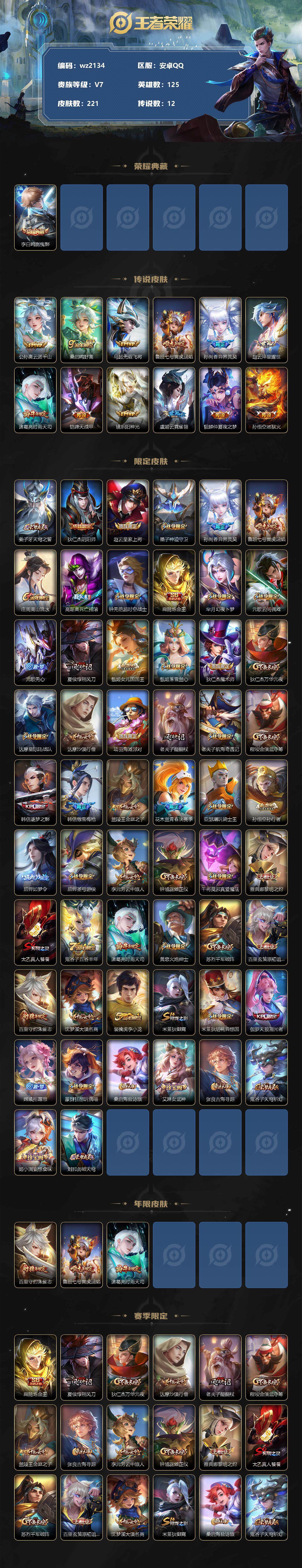 【游戏多多】【王者荣耀】【编号:3338941】【可二次实名】【wz2134】安卓Q-V7-至尊星耀II段位-125英雄-221皮肤-1典藏-0珍品无双-0无双-0珍品传说-12传说-62史诗 【英雄全皮】:空空儿全皮 【荣耀典藏】:李白鸣剑曳影 【传说皮肤】:公孙离云诺千山,桑启鸣野蒿,马超无双飞将,鲁班七号寅虎瑞焰,孙尚香异界灵契,赵云淬星耀世,诸葛亮时雨天司,铠绛天战甲,镜炽阳神光,虞姬云霓雀翎,貂蝉仲夏夜之梦,孙悟空地狱火 【限定皮肤】:姜子牙天穹之誓,狄仁杰阴阳师,赵云皇家上将,墨子神迹守卫,孙尚香异界灵契,鲁班七号寅虎瑞焰,庄周高山流水,高渐离死亡摇滚,钟无艳超时空战士,扁鹊炼金王,芈月幻夜卜梦,元歌云间偶戏,元歌无心,夏侯惇朔风刀,甄姬女儿国国王,甄姬落雪兰心,狄仁杰魔术师,狄仁杰万华元夜,达摩星际陆战队,达摩沙漠行僧,项羽海滩派对,老夫子醍醐杖,老夫子航海奇遇记,程咬金演武夺筹,韩信逐梦之影,韩信傲雪梅枪,兰陵王金庭之子,花木兰青春决赛季,亚瑟潮玩骑士王,孙悟空孙行者,后羿如梦令,后羿圣弓游侠,李元芳云中旅人,钟馗驱傩正仪,干将莫邪真爱魔法,雅典娜黎明之约,太乙真人饕餮,鬼谷子五谷丰年,诸葛亮时雨天司,黄忠火炮绅士,苏烈千军破阵,百里玄策原初追逐者,百里守约朱雀志,沈梦溪大漠名商,裴擒虎李小龙,米莱狄御霄,米莱狄胡桃异想国,伽罗天狼溯光者,嫦娥拒霜思,蒙犽狂想玩偶喵,桑启海盐诗旅,艾琳女武神,张良古海寻踪,鬼谷子天穹祈灯,姬小满妄想食味,刘邦剑破天穹 【年限皮肤】:百里守约朱雀志,鲁班七号寅虎瑞焰,诸葛亮时雨天司 【赛季限定】:扁鹊炼金王,夏侯惇朔风刀,狄仁杰万华元夜,达摩沙漠行僧,老夫子醍醐杖,程咬金演武夺筹,兰陵王金庭之子,张良古海寻踪,李元芳云中旅人,钟馗驱傩正仪,雅典娜黎明之约,太乙真人饕餮,苏烈千军破阵,百里玄策原初追逐者,沈梦溪大漠名商,米莱狄御霄,桑启海盐诗旅,鬼谷子天穹祈灯,刘邦剑破天穹,姜子牙天穹之誓 【战令限定】:墨子神迹守卫,钟无艳超时空战士,芈月幻夜卜梦,元歌云间偶戏,甄姬落雪兰心,达摩星际陆战队,老夫子航海奇遇记,亚瑟潮玩骑士王,后羿圣弓游侠,干将莫邪真爱魔法,黄忠火炮绅士,米莱狄胡桃异想国,蒙犽狂想玩偶喵 【史诗皮肤】:赵云皇家上将,王昭君偶像歌手,狄仁杰魔术师,宫本武藏鬼剑武藏,孙尚香水果甜心,嬴政摇滚巨星,妲己魅力维加斯,妲己女仆咖啡,墨子龙骑士,吕布圣诞狂欢,李白千年之狐,张飞乱世虎臣,韩信白龙吟,韩信逐梦之影,夏侯惇乘风破浪,小乔缤纷独角兽,兰陵王暗隐猎兽者,亚瑟心灵战警,雅典娜冰冠公主,安琪拉心灵骇客,花木兰青春决赛季,刘禅天才门将,李元芳逐浪之夏,程咬金功夫厨神,白起星夜王子,阿轲节奏热浪,孙策猫狗日记,百里守约朱雀志,狄仁杰鹰眼统帅,娜可露露晚萤,后羿如梦令,不知火舞魅语,橘右京修罗,孙尚香时之恋人,蒙犽狂想玩偶喵,百里玄策原初追逐者,裴擒虎李小龙,元歌云间偶戏,米莱狄胡桃异想国,百里玄策热力回旋,老夫子航海奇遇记,伽罗天狼溯光者,干将莫邪真爱魔法,孙悟空孙行者,庄周高山流水,司马懿暗渊魔法,嫦娥拒霜思,黄忠火炮绅士,雅典娜黎明之约,甄姬女儿国国王,韩信傲雪梅枪,钟无艳超时空战士,鬼谷子五谷丰年,元歌无心,姬小满妄想食味,姬小满战舞者,牛魔星界战将,刘禅鸭鸭历险记,狂铁龙之律动,后羿石田雨龙,黄忠百相守梦,弈星守夜人 【其他皮肤】:项羽海滩派对,韩信教廷特使,韩信街头霸王,达摩大发明家,赵云白执事,赵云忍炎影,芈月红桃皇后,艾琳女武神,白起白色死神,牛魔西部大镖客,宫本武藏未来纪元,安琪拉玩偶对对碰,孙膑天使之翼,妲己少女阿狸,亚瑟死亡骑士,达摩拳王,花木兰兔女郎,张飞五福同心,甄姬花好人间,宫本武藏万象初新,狄仁杰阴阳师,刘备纽约教父,高渐离死亡摇滚,刘备汉昭烈帝,扁鹊炼金王,关羽龙腾万里,钟无艳海滩丽影,太乙真人饕餮,宫本武藏霸王丸,王昭君幻想奇妙夜,老夫子功夫老勺,牛魔制霸全明星,李白敏锐之力,鬼谷子幻乐之宴,苏烈坚韧之力,大乔守护之力,米莱狄御霄,明世隐虹云星官,庄周奇妙博物学,小乔丁香结,吕布野性能量,孙膑归虚梦演,沈梦溪鲨炮海盗猫,夏侯惇朔风刀,哪吒次元突破,老夫子醍醐杖,狂铁特工战影,狄仁杰万华元夜,亚瑟潮玩骑士王,刘禅秘密基地,杨戬次元傲视,露娜瓷语鉴心,达摩星际陆战队,程咬金演武夺筹,张良缤纷绘卷,钟馗驱傩正仪,墨子神迹守卫,鲁班大师乓乓大师,苏烈千军破阵,后羿圣弓游侠,典韦铁甲之心,妲己紫罗兰之誓,马可波罗潮玩牛仔,达摩沙漠行僧,芈月幻夜卜梦,程咬金无双福将,刘邦虎啸剑宗,兰陵王金庭之子,沈梦溪大漠名商,甄姬落雪兰心,李元芳云中旅人,桑启海盐诗旅,猪八戒潮玩探月行,莱西奥西部游侠,张良古海寻踪,亚连破局者,后羿完美运算,鬼谷子天穹祈灯,海诺时空谍影,廉颇功夫炙烤,刘邦剑破天穹,姜子牙天穹之誓,盘古敬我三分,