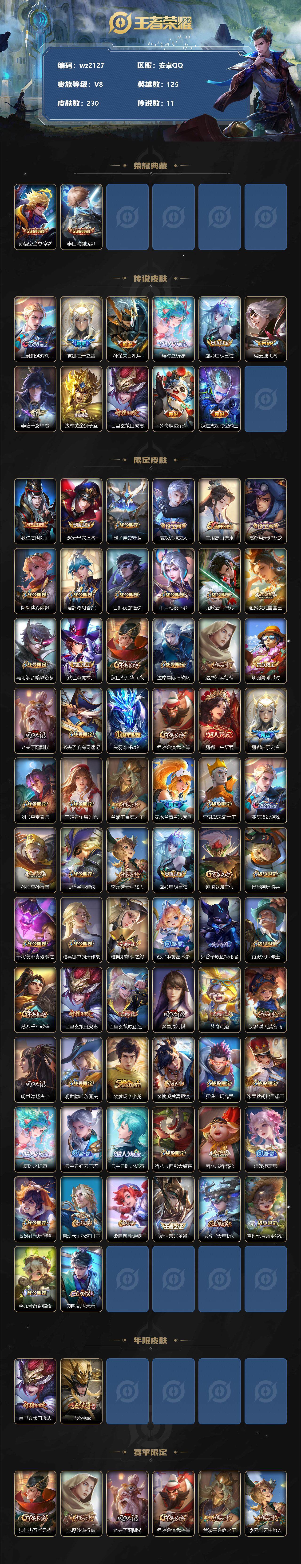 【游戏多多】【王者荣耀】【编号:3338942】【可二次实名】【wz2127】安卓Q-V8-至尊星耀III段位-125英雄-230皮肤-2典藏-0珍品无双-0无双-0珍品传说-11传说-81史诗 【荣耀典藏】:孙悟空全息碎影,李白鸣剑曳影 【传说皮肤】:亚瑟追逃游戏,露娜启示之音,孙策末日机甲,瑶时之祈愿,虞姬启明星使,曜云鹰飞将,李信一念神魔,达摩黄金狮子座,百里玄策白虎志,梦奇胖达荣荣,狄仁杰超时空战士 【限定皮肤】:狄仁杰阴阳师,赵云皇家上将,墨子神迹守卫,嬴政优雅恋人,庄周高山流水,高渐离玩趣恶龙,阿轲迷踪丽影,扁鹊奇幻香踪,白起夜都怪侠,芈月幻夜卜梦,元歌云间偶戏,甄姬女儿国国王,马可波罗暗影游猎,狄仁杰魔术师,狄仁杰万华元夜,达摩星际陆战队,达摩沙漠行僧,项羽海滩派对,老夫子醍醐杖,老夫子航海奇遇记,关羽冰锋战神,程咬金演武夺筹,露娜一生所爱,露娜启示之音,刘邦夺宝奇兵,王昭君午后时光,兰陵王金庭之子,花木兰青春决赛季,亚瑟潮玩骑士王,亚瑟追逃游戏,孙悟空孙行者,后羿圣弓游侠,李元芳云中旅人,虞姬启明星使,钟馗驱傩正仪,杨戬潮玩骑兵,干将莫邪真爱魔法,雅典娜单词大作战,雅典娜黎明之约,蔡文姬繁星吟游,鬼谷子原初探秘者,黄忠火炮绅士,苏烈千军破阵,百里玄策白虎志,百里玄策原初追逐者,弈星混沌棋,梦奇顽趣,沈梦溪大漠名商,明世隐疑决卦,明世隐吟游魔法,裴擒虎李小龙,裴擒虎擒涛扼浪,狂铁电玩高手,米莱狄胡桃异想国,瑶时之祈愿,云中君纤云弄巧,云中君时之祈愿,猪八戒西部大镖客,猪八戒猪悟能,嫦娥拒霜思,蒙犽狂想玩偶喵,鲁班大师探海日志,桑启海盐诗旅,蒙恬荣光圣徽,鬼谷子天穹祈灯,鲁班七号蔬乡物语,李元芳蔬乡物语,刘邦剑破天穹 【年限皮肤】:百里玄策白虎志,马超神威 【赛季限定】:狄仁杰万华元夜,达摩沙漠行僧,老夫子醍醐杖,程咬金演武夺筹,兰陵王金庭之子,李元芳云中旅人,钟馗驱傩正仪,雅典娜黎明之约,鬼谷子原初探秘者,苏烈千军破阵,百里玄策原初追逐者,弈星混沌棋,梦奇顽趣,沈梦溪大漠名商,明世隐疑决卦,裴擒虎擒涛扼浪,鲁班大师探海日志,桑启海盐诗旅,鬼谷子天穹祈灯,蒙恬荣光圣徽,刘邦剑破天穹 【战令限定】:墨子神迹守卫,阿轲迷踪丽影,扁鹊奇幻香踪,白起夜都怪侠,芈月幻夜卜梦,元歌云间偶戏,马可波罗暗影游猎,达摩星际陆战队,老夫子航海奇遇记,刘邦夺宝奇兵,王昭君午后时光,亚瑟潮玩骑士王,后羿圣弓游侠,杨戬潮玩骑兵,干将莫邪真爱魔法,雅典娜单词大作战,黄忠火炮绅士,明世隐吟游魔法,狂铁电玩高手,米莱狄胡桃异想国,猪八戒西部大镖客,蒙犽狂想玩偶喵,鲁班七号蔬乡物语,李元芳蔬乡物语 【史诗皮肤】:鲁班七号电玩小子,项羽苍穹之光,露娜紫霞仙子,阿轲暗夜猫娘,赵云皇家上将,赵云未来纪元,貂蝉圣诞恋歌,甄姬冰雪圆舞曲,王昭君偶像歌手,狄仁杰魔术师,廉颇地狱岩魂,宫本武藏鬼剑武藏,孙尚香水果甜心,嬴政优雅恋人,嬴政暗夜贵公子,妲己魅力维加斯,妲己女仆咖啡,墨子龙骑士,墨子金属风暴,吕布圣诞狂欢,刘禅绅士熊喵,曹操幽灵船长,吕布末日机甲,张飞乱世虎臣,韩信白龙吟,关羽冰锋战神,花木兰水晶猎龙者,夏侯惇乘风破浪,兰陵王暗隐猎兽者,诸葛亮黄金分割率,亚瑟心灵战警,雅典娜冰冠公主,花木兰青春决赛季,百里守约特工魅影,刘禅天才门将,李元芳逐浪之夏,白起星夜王子,阿轲节奏热浪,孙策猫狗日记,大乔猫狗日记,露娜一生所爱,狄仁杰鹰眼统帅,蔡文姬繁星吟游,娜可露露晚萤,不知火舞魅语,阿轲迷踪丽影,橘右京修罗,马超神威,马可波罗暗影游猎,蒙犽狂想玩偶喵,百里玄策原初追逐者,裴擒虎李小龙,云中君纤云弄巧,元歌云间偶戏,米莱狄胡桃异想国,百里玄策热力回旋,老夫子航海奇遇记,干将莫邪真爱魔法,钟馗乐园奇幻夜,孙悟空孙行者,猪八戒猪悟能,庄周高山流水,嫦娥拒霜思,黄忠火炮绅士,雅典娜黎明之约,甄姬女儿国国王,云中君时之祈愿,夏洛特永昼,澜赏金猎手,明世隐吟游魔法,狂铁电玩高手,梦奇顽趣,扁鹊奇幻香踪,刘禅电玩爆裂旋风,蒙恬荣光圣徽,鲁班七号蔬乡物语,牛魔星界战将,狂铁龙之律动,黄忠百相守梦,西施织梦人,公孙离涂山容容 【其他皮肤】:项羽海滩派对,韩信教廷特使,韩信街头霸王,露娜哥特玫瑰,阿轲爱心护理,达摩大发明家,赵云忍炎影,白起白色死神,扁鹊化身博士,宫本武藏未来纪元,安琪拉玩偶对对碰,孙膑天使之翼,典韦黄金武士,亚瑟死亡骑士,达摩拳王,花木兰兔女郎,张飞五福同心,甄姬花好人间,刘备万事如意,狄仁杰阴阳师,刘备汉昭烈帝,关羽龙腾万里,墨子进击墨子号,钟无艳海滩丽影,宫本武藏霸王丸,狂铁命运角斗场,老夫子功夫老勺,牛魔制霸全明星,孙尚香沉稳之力,诸葛亮掌控之力,李白敏锐之力,鬼谷子幻乐之宴,苏烈坚韧之力,大乔守护之力,项羽科学大爆炸,明世隐虹云星官,小乔丁香结,吕布野性能量,高渐离玩趣恶龙,沈梦溪鲨炮海盗猫,弈星混沌棋,哪吒