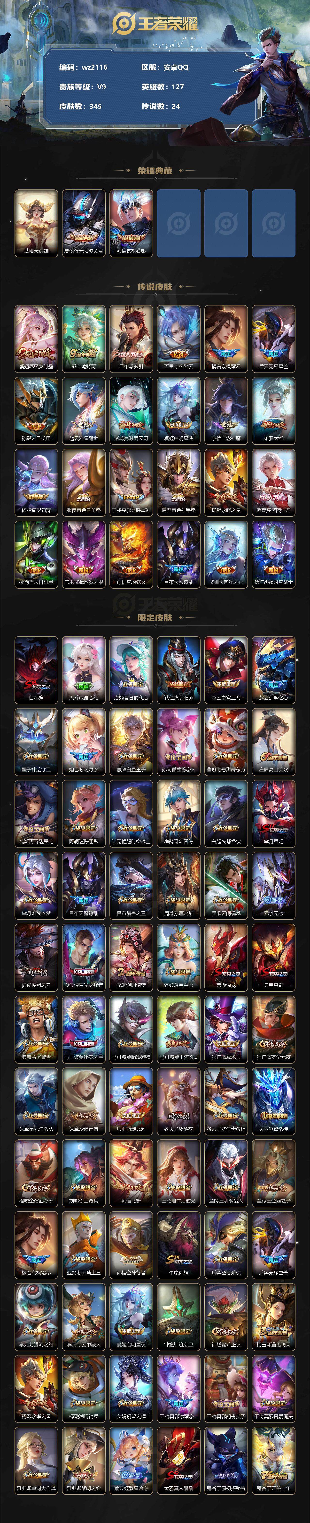 【游戏多多】【王者荣耀】【编号:3338945】【可二次实名】【wz2116】安卓Q-V9-尊贵铂金IV段位-127英雄-345皮肤-2典藏-0珍品无双-0无双-0珍品传说-24传说-98史诗 【英雄全皮】:橘右京全皮,钟馗全皮 【荣耀典藏】:武则天英雄,夏侯惇无限飓风号,韩信弑枪猎影 【传说皮肤】:虞姬愿照岁时盈,桑启鸣野蒿,吕布曦玄引,百里守约碎云,橘右京枫霜尽,后羿无尽星芒,孙策末日机甲,赵云淬星耀世,诸葛亮时雨天司,虞姬启明星使,李信一念神魔,伽罗太华,貂蝉猫影幻舞,张良黄金白羊座,干将莫邪久胜战神,后羿黄金射手座,杨戬永曜之星,诸葛亮武陵仙君,孙尚香末日机甲,宫本武藏地狱之眼,孙悟空地狱火,吕布天魔缭乱,武则天海洋之心,狄仁杰超时空战士 【限定皮肤】:白起狰,大乔绒语心约,虞姬夏日便利店,狄仁杰阴阳师,赵云皇家上将,赵云引擎之心,墨子神迹守卫,妲己时之奇旅,嬴政白昼王子,孙尚香蔷薇恋人,鲁班七号狮舞东方,庄周高山流水,高渐离玩趣恶龙,阿轲迷踪丽影,钟无艳超时空战士,扁鹊奇幻香踪,白起夜都怪侠,芈月重明,芈月幻夜卜梦,吕布天魔缭乱,吕布猎兽之王,周瑜赤莲之焰,元歌云间偶戏,元歌无心,夏侯惇朔风刀,夏侯惇匿光决锋者,甄姬游园惊梦,甄姬落雪兰心,曹操烛龙,典韦穷奇,典韦蓝屏警告,马可波罗逐梦之星,马可波罗暗影游猎,马可波罗山海玄木吟,狄仁杰魔术师,狄仁杰万华元夜,达摩星际陆战队,达摩沙漠行僧,项羽海滩派对,老夫子醍醐杖,老夫子航海奇遇记,关羽冰锋战神,程咬金演武夺筹,刘邦夺宝奇兵,韩信飞衡,王昭君午后时光,兰陵王驯魔猎人,兰陵王金庭之子,橘右京枫霜尽,亚瑟潮玩骑士王,孙悟空孙行者,牛魔御旌,后羿圣弓游侠,后羿无尽星芒,李元芳银河之约,李元芳云中旅人,虞姬启明星使,钟馗神迹守卫,钟馗驱傩正仪,杨玉环遇见飞天,杨戬永曜之星,杨戬潮玩骑兵,女娲朔望之晖,干将莫邪冰霜恋舞曲,干将莫邪胡桃夹子,干将莫邪真爱魔法,雅典娜单词大作战,雅典娜黎明之约,蔡文姬繁星吟游,太乙真人饕餮,鬼谷子原初探秘者,鬼谷子五谷丰年,诸葛亮武陵仙君,诸葛亮时雨天司,黄忠火炮绅士,铠青龙志,苏烈千军破阵,百里玄策原初追逐者,百里守约朱雀志,弈星混沌棋,梦奇顽趣,沈梦溪星空之诺,沈梦溪大漠名商,明世隐疑决卦,明世隐吟游魔法,裴擒虎李小龙,裴擒虎擒涛扼浪,狂铁御狮,狂铁电玩高手,米莱狄御霄,米莱狄胡桃异想国,云中君纤云弄巧,伽罗太华,盾山御銮,猪八戒西部大镖客,上官婉儿梁祝,嫦娥拒霜思,嫦娥暖冬兔眠,西施玲珑珍味,蒙犽狂想玩偶喵,鲁班大师探海日志,桑启海盐诗旅,暃星界游侠,戈娅驭风魔法,张良古海寻踪,蒙犽百解令,高渐离燃音魔法,妲己灵卜魔法,鬼谷子天穹祈灯,伽罗琥珀纪元,吕布曦玄引,沈梦溪龙舞盛年,刘邦剑破天穹,程咬金群星魔术团,刘备异域游侠,周瑜熔金海岸 【年限皮肤】:百里守约朱雀志,铠青龙志,杨戬永曜之星,诸葛亮时雨天司,伽罗太华,韩信飞衡,马可波罗山海玄木吟 【赛季限定】:白起狰,芈月重明,夏侯惇朔风刀,曹操烛龙,典韦穷奇,狄仁杰万华元夜,达摩沙漠行僧,老夫子醍醐杖,程咬金演武夺筹,兰陵王金庭之子,张良古海寻踪,牛魔御旌,李元芳云中旅人,钟馗驱傩正仪,雅典娜黎明之约,太乙真人饕餮,鬼谷子原初探秘者,苏烈千军破阵,百里玄策原初追逐者,弈星混沌棋,梦奇顽趣,沈梦溪大漠名商,明世隐疑决卦,裴擒虎擒涛扼浪,狂铁御狮,米莱狄御霄,盾山御銮,鲁班大师探海日志,桑启海盐诗旅,鬼谷子天穹祈灯,刘邦剑破天穹 【战令限定】:墨子神迹守卫,虞姬夏日便利店,嬴政白昼王子,鲁班七号狮舞东方,阿轲迷踪丽影,钟无艳超时空战士,扁鹊奇幻香踪,白起夜都怪侠,芈月幻夜卜梦,吕布猎兽之王,周瑜赤莲之焰,元歌云间偶戏,甄姬落雪兰心,典韦蓝屏警告,马可波罗暗影游猎,达摩星际陆战队,老夫子航海奇遇记,刘邦夺宝奇兵,王昭君午后时光,兰陵王驯魔猎人,亚瑟潮玩骑士王,后羿圣弓游侠,李元芳银河之约,钟馗神迹守卫,杨戬潮玩骑兵,女娲朔望之晖,干将莫邪真爱魔法,雅典娜单词大作战,黄忠火炮绅士,沈梦溪星空之诺,明世隐吟游魔法,狂铁电玩高手,米莱狄胡桃异想国,猪八戒西部大镖客,嫦娥暖冬兔眠,西施玲珑珍味,蒙犽狂想玩偶喵,暃星界游侠,戈娅驭风魔法,高渐离燃音魔法,妲己灵卜魔法 【史诗皮肤】:鲁班七号电玩小子,项羽苍穹之光,露娜紫霞仙子,阿轲暗夜猫娘,赵云皇家上将,赵云未来纪元,貂蝉圣诞恋歌,甄姬冰雪圆舞曲,王昭君偶像歌手,狄仁杰魔术师,廉颇地狱岩魂,宫本武藏鬼剑武藏,孙尚香蔷薇恋人,孙尚香水果甜心,嬴政暗夜贵公子,嬴政摇滚巨星,妲己魅力维加斯,妲己女仆咖啡,墨子龙骑士,墨子金属风暴,吕布圣诞狂欢,曹操幽灵船长,李白千年之狐,吕布末日机甲,张飞乱世虎臣,关羽冰锋战神,赵云引擎之心,花木兰水晶猎龙者,刘邦德古拉伯爵,夏侯惇乘风破浪,小乔缤纷独角兽,兰陵王暗隐猎兽者,诸葛亮黄金分割