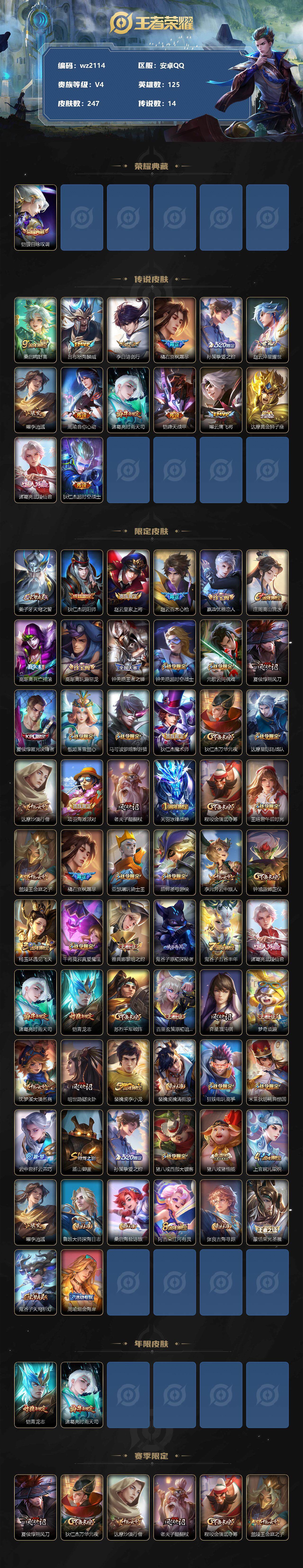 【游戏多多】【王者荣耀】【编号:3338946】【可二次实名】【wz2114】安卓Q-V4-至尊星耀II段位-125英雄-247皮肤-1典藏-0珍品无双-0无双-0珍品传说-14传说-70史诗 【英雄全皮】:橘右京全皮,蒙恬全皮 【荣耀典藏】:铠银白咏叹调 【传说皮肤】:桑启鸣野蒿,吕布怒海麟威,李白诗剑行,橘右京枫霜尽,孙策挚爱之约,赵云淬星耀世,曜李逍遥 ,周瑜音你心动,诸葛亮时雨天司,铠绛天战甲,曜云鹰飞将,达摩黄金狮子座,诸葛亮武陵仙君,狄仁杰超时空战士 【限定皮肤】:姜子牙天穹之誓,狄仁杰阴阳师,赵云皇家上将,赵云百木心枪,嬴政优雅恋人,庄周高山流水,高渐离死亡摇滚,高渐离玩趣恶龙,钟无艳王者之锤,钟无艳超时空战士,元歌云间偶戏,夏侯惇朔风刀,夏侯惇匿光决锋者,甄姬落雪兰心,马可波罗暗影游猎,狄仁杰魔术师,狄仁杰万华元夜,达摩星际陆战队,达摩沙漠行僧,项羽海滩派对,老夫子醍醐杖,关羽冰锋战神,程咬金演武夺筹,王昭君午后时光,兰陵王金庭之子,橘右京枫霜尽,亚瑟潮玩骑士王,后羿圣弓游侠,李元芳云中旅人,钟馗驱傩正仪,杨玉环遇见飞天,干将莫邪真爱魔法,雅典娜黎明之约,鬼谷子原初探秘者,鬼谷子五谷丰年,诸葛亮武陵仙君,诸葛亮时雨天司,铠青龙志,苏烈千军破阵,百里玄策原初追逐者,弈星混沌棋,梦奇顽趣,沈梦溪大漠名商,明世隐疑决卦,裴擒虎李小龙,裴擒虎擒涛扼浪,狂铁电玩高手,米莱狄胡桃异想国,云中君纤云弄巧,盾山御銮,孙策挚爱之约,猪八戒西部大镖客,猪八戒猪悟能,上官婉儿梁祝,曜李逍遥 ,鲁班大师探海日志,桑启海盐诗旅,阿古朵江河有灵,张良古海寻踪,蒙恬荣光圣徽,鬼谷子天穹祈灯,周瑜熔金海岸 【年限皮肤】:铠青龙志,诸葛亮时雨天司 【赛季限定】:夏侯惇朔风刀,狄仁杰万华元夜,达摩沙漠行僧,老夫子醍醐杖,程咬金演武夺筹,兰陵王金庭之子,张良古海寻踪,李元芳云中旅人,钟馗驱傩正仪,雅典娜黎明之约,鬼谷子原初探秘者,苏烈千军破阵,百里玄策原初追逐者,弈星混沌棋,梦奇顽趣,沈梦溪大漠名商,明世隐疑决卦,裴擒虎擒涛扼浪,盾山御銮,鲁班大师探海日志,桑启海盐诗旅,鬼谷子天穹祈灯,蒙恬荣光圣徽,姜子牙天穹之誓 【战令限定】:钟无艳超时空战士,元歌云间偶戏,甄姬落雪兰心,马可波罗暗影游猎,达摩星际陆战队,王昭君午后时光,亚瑟潮玩骑士王,后羿圣弓游侠,干将莫邪真爱魔法,狂铁电玩高手,米莱狄胡桃异想国,猪八戒西部大镖客 【史诗皮肤】:项羽苍穹之光,钟无艳王者之锤,赵云皇家上将,赵云未来纪元,甄姬冰雪圆舞曲,王昭君偶像歌手,狄仁杰魔术师,廉颇地狱岩魂,宫本武藏鬼剑武藏,孙尚香水果甜心,嬴政优雅恋人,嬴政暗夜贵公子,嬴政摇滚巨星,妲己魅力维加斯,妲己女仆咖啡,墨子金属风暴,吕布圣诞狂欢,刘禅绅士熊喵,曹操幽灵船长,李白千年之狐,吕布末日机甲,关羽冰锋战神,花木兰水晶猎龙者,刘邦德古拉伯爵,夏侯惇乘风破浪,小乔缤纷独角兽,兰陵王暗隐猎兽者,诸葛亮黄金分割率,亚瑟心灵战警,雅典娜冰冠公主,安琪拉心灵骇客,百里守约特工魅影,铠曙光守护者,蔡文姬舞动绿茵,李元芳逐浪之夏,程咬金功夫厨神,白起星夜王子,阿轲节奏热浪,杨玉环遇见飞天,铠青龙志,伽罗箭羽风息,狄仁杰鹰眼统帅,上官婉儿梁祝,橘右京修罗,马可波罗暗影游猎,百里玄策原初追逐者,裴擒虎李小龙,云中君纤云弄巧,元歌云间偶戏,米莱狄胡桃异想国,杨戬天秀启明,干将莫邪真爱魔法,猪八戒猪悟能,庄周高山流水,司马懿暗渊魔法,雅典娜黎明之约,赵云百木心枪,夏侯惇匿光决锋者,狂铁电玩高手,钟无艳超时空战士,鬼谷子五谷丰年,梦奇顽趣,阿古朵江河有灵,周瑜雪夜绮愿,蒙恬荣光圣徽,刘禅鸭鸭历险记,狂铁龙之律动,黄忠百相守梦,西施织梦人,公孙离涂山容容 【其他皮肤】:项羽海滩派对,韩信教廷特使,韩信街头霸王,达摩大发明家,赵云白执事,赵云忍炎影,芈月红桃皇后,白起白色死神,牛魔西部大镖客,武则天东方不败,扁鹊化身博士,宫本武藏未来纪元,安琪拉玩偶对对碰,孙膑天使之翼,姜子牙时尚教父,妲己少女阿狸,典韦黄金武士,亚瑟死亡骑士,达摩拳王,花木兰兔女郎,甄姬花好人间,刘备万事如意,宫本武藏万象初新,后羿阿尔法小队,狄仁杰阴阳师,刘备纽约教父,高渐离死亡摇滚,刘备汉昭烈帝,关羽龙腾万里,钟无艳海滩丽影,宫本武藏霸王丸,王昭君幻想奇妙夜,狂铁命运角斗场,老夫子功夫老勺,牛魔制霸全明星,孙尚香沉稳之力,诸葛亮掌控之力,李白敏锐之力,鬼谷子幻乐之宴,苏烈坚韧之力,大乔守护之力,明世隐虹云星官,吕布野性能量,盾山御銮,孙膑归虚梦演,高渐离玩趣恶龙,沈梦溪鲨炮海盗猫,姜子牙炽热元素使,夏侯惇朔风刀,弈星混沌棋,哪吒次元突破,明世隐疑决卦,盾山圆桌骑士,老夫子醍醐杖,猪八戒西部大镖客,狂铁特工战影,鬼谷子原初探秘者,狄仁杰万华元夜,亚瑟潮玩骑士王,刘禅秘密基地,杨戬次元傲视,达摩星际陆战队,程咬金演武夺筹