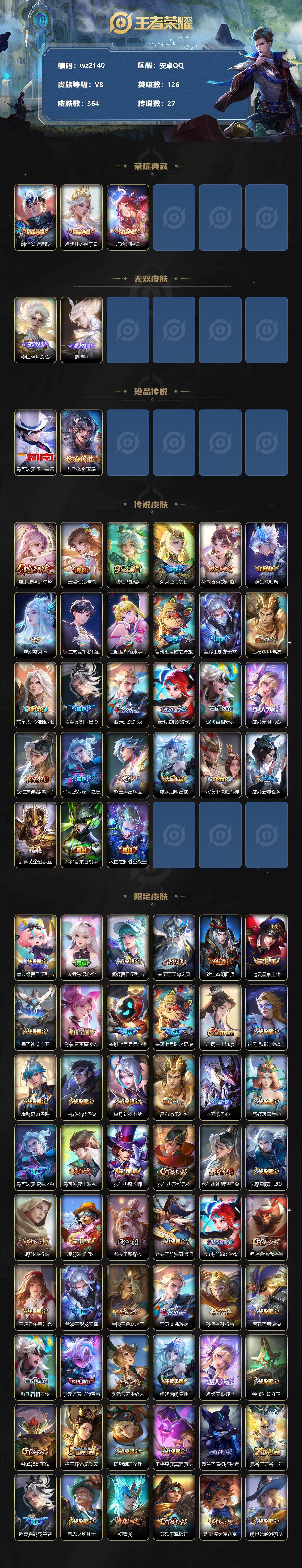 【游戏多多】【王者荣耀】【编号:3338947】【可二次实名】【wz2140】安卓Q-V8-至尊星耀III段位-126英雄-364皮肤-3典藏-0珍品无双-2无双-2珍品传说-27传说-103史诗 【英雄全皮】:刘禅全皮,狄仁杰全皮,钟馗全皮,鬼谷子全皮,蒙恬全皮,戈娅全皮,空空儿全皮,影全皮 【荣耀典藏】:韩信弑枪猎影,虞姬神鉴启示录,瑶拾光映像 【无双皮肤】:李白碎月剑心,铠神罪 【珍品传说】:马可波罗怪盗基德,张飞兔狲蓬尾 【传说皮肤】:虞姬愿照岁时盈,云缨幻光神枪,桑启鸣野蒿,海月金乌负日,孙尚香乘龙问璇玑,澜逐花归海,露娜霜月吟,狄仁杰夜礼服假面,王昭君永恒水手月亮,鲁班七号时之奇旅,兰陵王影龙天霄,吕布遇见神鼓,东皇太一灼幽烈阳,诸葛亮鹤羽星尊,亚瑟追逃游戏,安琪拉追逃游戏,张飞百相守梦,虞姬无限倾心,狄仁杰神器狴犴令,马可波罗深海之息,赵云淬星耀世,虞姬启明星使,干将莫邪久胜战神,虞姬云霓雀翎,后羿黄金射手座,孙尚香末日机甲,狄仁杰超时空战士 【限定皮肤】:蔡文姬夏日便利店,大乔绒语心约,虞姬夏日便利店,姜子牙天穹之誓,狄仁杰阴阳师,赵云皇家上将,墨子神迹守卫,孙尚香蔷薇恋人,鲁班七号乒乒小将,鲁班七号时之奇旅,庄周高山流水,钟无艳超时空战士,扁鹊奇幻香踪,白起夜都怪侠,芈月幻夜卜梦,吕布遇见神鼓,元歌无心,甄姬落雪兰心,马可波罗深海之息,马可波罗山海玄木吟,狄仁杰魔术师,狄仁杰万华元夜,狄仁杰神器狴犴令,达摩星际陆战队,达摩沙漠行僧,项羽海滩派对,老夫子醍醐杖,老夫子航海奇遇记,安琪拉追逃游戏,程咬金演武夺筹,王昭君午后时光,兰陵王影龙天霄,兰陵王金庭之子,亚瑟追逃游戏,孙悟空孙行者,后羿圣弓游侠,张飞百相守梦,李元芳匿光侦查者,李元芳云中旅人,虞姬启明星使,虞姬无限倾心,钟馗神迹守卫,钟馗驱傩正仪,杨玉环遇见飞天,杨戬潮玩骑兵,干将莫邪真爱魔法,鬼谷子原初探秘者,鬼谷子五谷丰年,诸葛亮鹤羽星尊,黄忠火炮绅士,铠青龙志,苏烈千军破阵,沈梦溪大漠名商,明世隐吟游魔法,裴擒虎李小龙,裴擒虎擒涛扼浪,狂铁电玩高手,米莱狄胡桃异想国,云中君纤云弄巧,猪八戒西部大镖客,上官婉儿梁祝,嫦娥拒霜思,嫦娥暖冬兔眠,西施玲珑珍味,鲁班大师探海日志,桑启海盐诗旅,暃星界游侠,戈娅驭风魔法,艾琳女武神,艾琳流音漫舞,司空震地狱燃心,阿古朵江河有灵,张良古海寻踪,王昭君永恒水手月亮,狄仁杰夜礼服假面,蒙犽百解令,蒙恬荣光圣徽,高渐离燃音魔法,妲己灵卜魔法,鬼谷子天穹祈灯,李白碎月剑心,伽罗琥珀纪元,姬小满妄想食味,孙尚香乘龙问璇玑,沈梦溪龙舞盛年,鲁班七号蔬乡物语,李元芳蔬乡物语,海月金乌负日,刘邦剑破天穹,程咬金群星魔术团,镜青焰无极,项羽苍威无极,刘备异域游侠,周瑜熔金海岸 【年限皮肤】:铠青龙志,马可波罗山海玄木吟,孙尚香乘龙问璇玑 【赛季限定】:狄仁杰万华元夜,达摩沙漠行僧,老夫子醍醐杖,程咬金演武夺筹,兰陵王金庭之子,张良古海寻踪,李元芳云中旅人,钟馗驱傩正仪,鬼谷子原初探秘者,苏烈千军破阵,沈梦溪大漠名商,裴擒虎擒涛扼浪,鲁班大师探海日志,桑启海盐诗旅,鬼谷子天穹祈灯,蒙恬荣光圣徽,刘邦剑破天穹,姜子牙天穹之誓 【战令限定】:墨子神迹守卫,蔡文姬夏日便利店,虞姬夏日便利店,钟无艳超时空战士,扁鹊奇幻香踪,白起夜都怪侠,芈月幻夜卜梦,甄姬落雪兰心,达摩星际陆战队,老夫子航海奇遇记,王昭君午后时光,艾琳流音漫舞,后羿圣弓游侠,钟馗神迹守卫,杨戬潮玩骑兵,干将莫邪真爱魔法,黄忠火炮绅士,明世隐吟游魔法,狂铁电玩高手,米莱狄胡桃异想国,猪八戒西部大镖客,嫦娥暖冬兔眠,西施玲珑珍味,司空震地狱燃心,暃星界游侠,戈娅驭风魔法,高渐离燃音魔法,妲己灵卜魔法,鲁班七号蔬乡物语,李元芳蔬乡物语,镜青焰无极,项羽苍威无极 【史诗皮肤】:鲁班七号电玩小子,项羽苍穹之光,露娜紫霞仙子,阿轲暗夜猫娘,赵云皇家上将,赵云未来纪元,貂蝉圣诞恋歌,甄姬冰雪圆舞曲,王昭君偶像歌手,狄仁杰魔术师,廉颇地狱岩魂,宫本武藏鬼剑武藏,孙尚香蔷薇恋人,孙尚香水果甜心,嬴政摇滚巨星,妲己魅力维加斯,妲己女仆咖啡,墨子龙骑士,墨子金属风暴,吕布圣诞狂欢,刘禅绅士熊喵,曹操幽灵船长,李白千年之狐,吕布末日机甲,张飞乱世虎臣,花木兰水晶猎龙者,刘邦德古拉伯爵,夏侯惇乘风破浪,小乔缤纷独角兽,兰陵王暗隐猎兽者,亚瑟心灵战警,雅典娜冰冠公主,安琪拉心灵骇客,百里守约特工魅影,铠曙光守护者,蔡文姬舞动绿茵,刘禅天才门将,李元芳逐浪之夏,程咬金功夫厨神,白起星夜王子,阿轲节奏热浪,杨玉环遇见飞天,孙策猫狗日记,大乔猫狗日记,铠青龙志,伽罗箭羽风息,狄仁杰鹰眼统帅,公孙离无限星赏官,上官婉儿梁祝,不知火舞魅语,橘右京修罗,瑶遇见神鹿,裴擒虎李小龙,云中君纤云弄巧,米莱狄胡桃异想国,老夫子航海奇遇记,鲁班七号乒乒小将,杨戬天秀启明,干将莫邪真