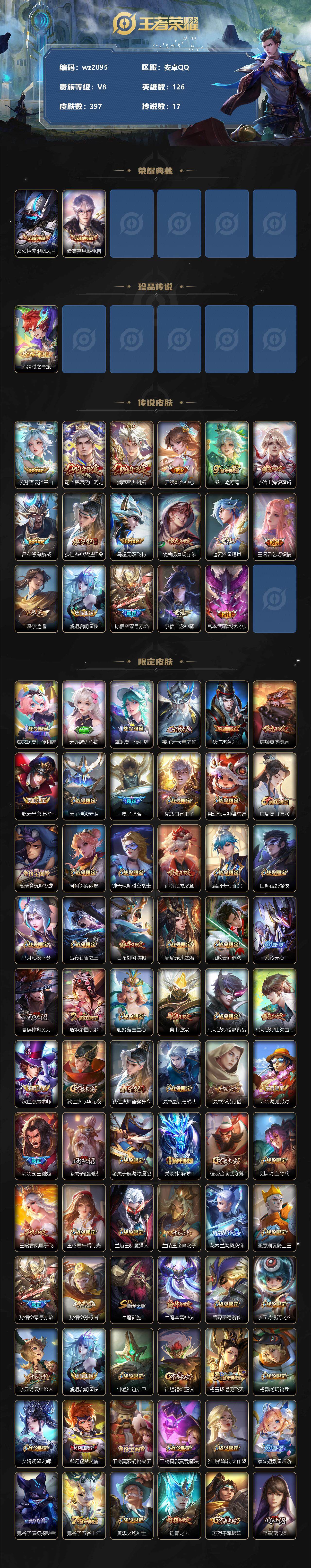 【游戏多多】【王者荣耀】【编号:3338960】【可二次实名】【wz2095】安卓Q-V8-至尊星耀IV段位-126英雄-397皮肤-2典藏-0珍品无双-0无双-1珍品传说-17传说-135史诗 【英雄全皮】:刘邦全皮,钟馗全皮,苍全皮,狂铁全皮,李信全皮,阿古朵全皮,司空震全皮,影全皮 【荣耀典藏】:夏侯惇无限飓风号,诸葛亮星域神启 【珍品传说】:孙策时之奇旅 【传说皮肤】:公孙离云诺千山,司空震愿照山河定,澜愿照九州拓,云缨幻光神枪,桑启鸣野蒿,李信山海炽霜斩,吕布怒海麟威,狄仁杰神器狴犴令,马超无双飞将,裴擒虎寅虎赤拳,赵云淬星耀世,王昭君乞巧织情,曜李逍遥 ,虞姬启明星使,孙悟空零号赤焰,李信一念神魔,宫本武藏地狱之眼 【限定皮肤】:蔡文姬夏日便利店,大乔绒语心约,虞姬夏日便利店,姜子牙天穹之誓,狄仁杰阴阳师,廉颇寅虎御盾,赵云皇家上将,墨子神迹守卫,墨子降魔,嬴政白昼王子,鲁班七号狮舞东方,庄周高山流水,高渐离玩趣恶龙,阿轲迷踪丽影,钟无艳超时空战士,孙膑寅虎展翼,扁鹊奇幻香踪,白起夜都怪侠,芈月幻夜卜梦,吕布猎兽之王,吕布御风骁将,周瑜赤莲之焰,元歌云间偶戏,元歌无心,夏侯惇朔风刀,甄姬游园惊梦,甄姬落雪兰心,典韦岱宗,马可波罗暗影游猎,马可波罗山海玄木吟,狄仁杰魔术师,狄仁杰万华元夜,狄仁杰神器狴犴令,达摩星际陆战队,达摩沙漠行僧,项羽海滩派对,项羽霸王别姬,老夫子醍醐杖,老夫子航海奇遇记,关羽冰锋战神,程咬金演武夺筹,刘邦夺宝奇兵,王昭君凤凰于飞,王昭君午后时光,兰陵王驯魔猎人,兰陵王金庭之子,花木兰默契交锋,亚瑟潮玩骑士王,孙悟空零号赤焰,孙悟空孙行者,牛魔御旌,牛魔奔雷神使,后羿圣弓游侠,李元芳银河之约,李元芳云中旅人,虞姬启明星使,钟馗神迹守卫,钟馗驱傩正仪,杨玉环遇见飞天,杨戬潮玩骑兵,女娲朔望之晖,哪吒逐梦之翼,干将莫邪胡桃夹子,干将莫邪真爱魔法,雅典娜单词大作战,蔡文姬繁星吟游,鬼谷子原初探秘者,鬼谷子五谷丰年,黄忠火炮绅士,铠青龙志,苏烈千军破阵,弈星混沌棋,梦奇顽趣,公孙离玉兔公主,沈梦溪星空之诺,沈梦溪大漠名商,明世隐疑决卦,明世隐吟游魔法,裴擒虎天狼狩猎者,裴擒虎李小龙,裴擒虎寅虎赤拳,裴擒虎擒涛扼浪,狂铁御狮,狂铁电玩高手,米莱狄御霄,米莱狄胡桃异想国,云中君纤云弄巧,云中君时之祈愿,李信山海炽霜斩,伽罗天狼溯光者,盾山御銮,猪八戒西部大镖客,上官婉儿梁祝,嫦娥拒霜思,嫦娥暖冬兔眠,曜李逍遥 ,蒙犽狂想玩偶喵,鲁班大师探海日志,桑启海盐诗旅,暃星界游侠,艾琳流音漫舞,司空震地狱燃心,阿古朵江河有灵,张良古海寻踪,蒙犽百解令,高渐离燃音魔法,妲己灵卜魔法,鬼谷子天穹祈灯,姬小满妄想食味,沈梦溪龙舞盛年,鲁班七号蔬乡物语,李元芳蔬乡物语,刘邦剑破天穹,程咬金群星魔术团,镜青焰无极,项羽苍威无极,周瑜熔金海岸 【年限皮肤】:铠青龙志,裴擒虎寅虎赤拳,孙膑寅虎展翼,廉颇寅虎御盾,王昭君凤凰于飞,吕布御风骁将,牛魔奔雷神使,典韦岱宗,马可波罗山海玄木吟,李信山海炽霜斩 【赛季限定】:夏侯惇朔风刀,狄仁杰万华元夜,达摩沙漠行僧,老夫子醍醐杖,程咬金演武夺筹,兰陵王金庭之子,张良古海寻踪,牛魔御旌,李元芳云中旅人,钟馗驱傩正仪,鬼谷子原初探秘者,苏烈千军破阵,弈星混沌棋,梦奇顽趣,沈梦溪大漠名商,明世隐疑决卦,裴擒虎擒涛扼浪,狂铁御狮,米莱狄御霄,盾山御銮,鲁班大师探海日志,桑启海盐诗旅,鬼谷子天穹祈灯,刘邦剑破天穹,姜子牙天穹之誓 【战令限定】:墨子神迹守卫,蔡文姬夏日便利店,虞姬夏日便利店,嬴政白昼王子,鲁班七号狮舞东方,阿轲迷踪丽影,钟无艳超时空战士,扁鹊奇幻香踪,白起夜都怪侠,芈月幻夜卜梦,吕布猎兽之王,周瑜赤莲之焰,元歌云间偶戏,甄姬落雪兰心,马可波罗暗影游猎,达摩星际陆战队,老夫子航海奇遇记,刘邦夺宝奇兵,王昭君午后时光,兰陵王驯魔猎人,艾琳流音漫舞,亚瑟潮玩骑士王,后羿圣弓游侠,李元芳银河之约,钟馗神迹守卫,杨戬潮玩骑兵,女娲朔望之晖,干将莫邪真爱魔法,雅典娜单词大作战,黄忠火炮绅士,沈梦溪星空之诺,明世隐吟游魔法,狂铁电玩高手,米莱狄胡桃异想国,猪八戒西部大镖客,嫦娥暖冬兔眠,蒙犽狂想玩偶喵,司空震地狱燃心,暃星界游侠,高渐离燃音魔法,妲己灵卜魔法,鲁班七号蔬乡物语,李元芳蔬乡物语,镜青焰无极,项羽苍威无极 【史诗皮肤】:鲁班七号电玩小子,项羽苍穹之光,露娜紫霞仙子,阿轲暗夜猫娘,赵云皇家上将,赵云未来纪元,貂蝉圣诞恋歌,甄姬冰雪圆舞曲,王昭君偶像歌手,狄仁杰魔术师,廉颇地狱岩魂,宫本武藏鬼剑武藏,孙尚香水果甜心,嬴政暗夜贵公子,嬴政摇滚巨星,妲己魅力维加斯,妲己女仆咖啡,墨子龙骑士,墨子金属风暴,吕布圣诞狂欢,刘禅绅士熊喵,曹操幽灵船长,李白千年之狐,吕布末日机甲,张飞乱世虎臣,项羽霸王别姬,关羽冰锋战神,王昭君凤凰于飞,花木兰水晶猎龙者,刘