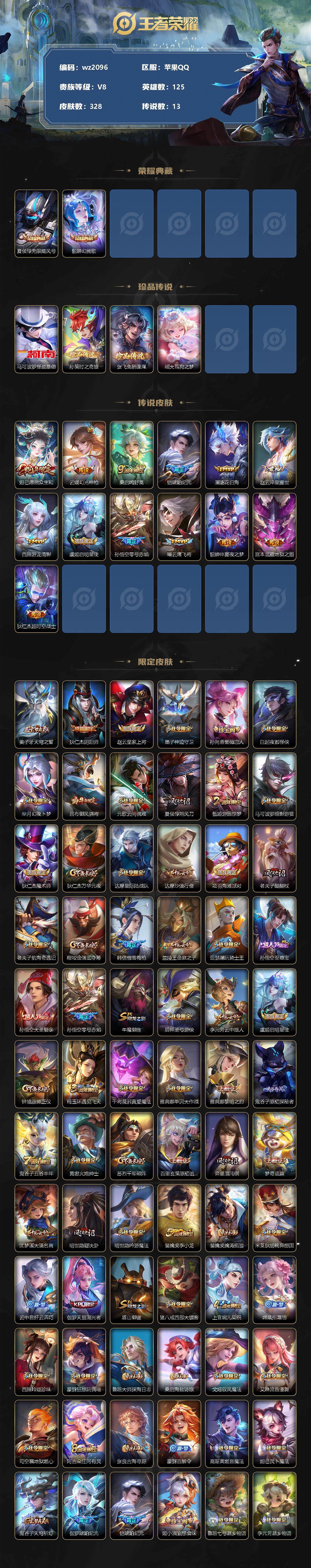 【游戏多多】【王者荣耀】【编号:3338969】【可二次实名】【wz2096】苹果Q-V8-至尊星耀I段位-125英雄-328皮肤-2典藏-0珍品无双-0无双-4珍品传说-13传说-92史诗 【英雄全皮】:刘禅全皮,鬼谷子全皮,影全皮 【荣耀典藏】:夏侯惇无限飓风号,貂蝉幻阙歌 【珍品传说】:马可波罗怪盗基德,孙策时之奇旅,张飞兔狲蓬尾,瑶大耳狗之梦 【传说皮肤】:妲己愿照众生和,云缨幻光神枪,桑启鸣野蒿,铠琥珀纪元,澜逐花归海,赵云淬星耀世,西施游龙清影,虞姬启明星使,孙悟空零号赤焰,曜云鹰飞将,貂蝉仲夏夜之梦,宫本武藏地狱之眼,狄仁杰超时空战士 【限定皮肤】:姜子牙天穹之誓,狄仁杰阴阳师,赵云皇家上将,墨子神迹守卫,孙尚香蔷薇恋人,白起夜都怪侠,芈月幻夜卜梦,吕布御风骁将,元歌云间偶戏,夏侯惇朔风刀,甄姬游园惊梦,马可波罗暗影游猎,狄仁杰魔术师,狄仁杰万华元夜,达摩星际陆战队,达摩沙漠行僧,项羽海滩派对,老夫子醍醐杖,老夫子航海奇遇记,程咬金演武夺筹,韩信傲雪梅枪,兰陵王金庭之子,亚瑟潮玩骑士王,孙悟空至尊宝,孙悟空大圣娶亲,孙悟空零号赤焰,牛魔御旌,后羿圣弓游侠,李元芳云中旅人,虞姬启明星使,钟馗驱傩正仪,杨玉环遇见飞天,干将莫邪真爱魔法,雅典娜单词大作战,雅典娜黎明之约,鬼谷子原初探秘者,鬼谷子五谷丰年,黄忠火炮绅士,苏烈千军破阵,百里玄策原初追逐者,弈星混沌棋,梦奇顽趣,沈梦溪大漠名商,明世隐疑决卦,明世隐吟游魔法,裴擒虎李小龙,裴擒虎擒涛扼浪,米莱狄胡桃异想国,云中君纤云弄巧,伽罗天狼溯光者,盾山御銮,猪八戒西部大镖客,上官婉儿梁祝,嫦娥拒霜思,西施玲珑珍味,蒙犽狂想玩偶喵,鲁班大师探海日志,桑启海盐诗旅,戈娅驭风魔法,艾琳流音漫舞,司空震地狱燃心,阿古朵江河有灵,张良古海寻踪,蒙犽百解令,高渐离燃音魔法,妲己灵卜魔法,鬼谷子天穹祈灯,伽罗琥珀纪元,铠琥珀纪元,姬小满妄想食味,鲁班七号蔬乡物语,李元芳蔬乡物语,刘邦剑破天穹,程咬金群星魔术团,项羽苍威无极,周瑜熔金海岸 【年限皮肤】:吕布御风骁将 【赛季限定】:夏侯惇朔风刀,狄仁杰万华元夜,达摩沙漠行僧,老夫子醍醐杖,程咬金演武夺筹,兰陵王金庭之子,张良古海寻踪,牛魔御旌,李元芳云中旅人,钟馗驱傩正仪,雅典娜黎明之约,鬼谷子原初探秘者,苏烈千军破阵,百里玄策原初追逐者,弈星混沌棋,梦奇顽趣,沈梦溪大漠名商,明世隐疑决卦,裴擒虎擒涛扼浪,盾山御銮,鲁班大师探海日志,桑启海盐诗旅,鬼谷子天穹祈灯,刘邦剑破天穹,姜子牙天穹之誓 【战令限定】:墨子神迹守卫,白起夜都怪侠,芈月幻夜卜梦,元歌云间偶戏,马可波罗暗影游猎,达摩星际陆战队,老夫子航海奇遇记,艾琳流音漫舞,亚瑟潮玩骑士王,后羿圣弓游侠,干将莫邪真爱魔法,雅典娜单词大作战,黄忠火炮绅士,明世隐吟游魔法,米莱狄胡桃异想国,猪八戒西部大镖客,西施玲珑珍味,蒙犽狂想玩偶喵,司空震地狱燃心,戈娅驭风魔法,高渐离燃音魔法,妲己灵卜魔法,鲁班七号蔬乡物语,李元芳蔬乡物语,项羽苍威无极 【史诗皮肤】:鲁班七号电玩小子,项羽苍穹之光,露娜紫霞仙子,赵云皇家上将,赵云未来纪元,貂蝉圣诞恋歌,甄姬冰雪圆舞曲,王昭君偶像歌手,狄仁杰魔术师,廉颇地狱岩魂,宫本武藏鬼剑武藏,孙尚香蔷薇恋人,孙尚香水果甜心,嬴政摇滚巨星,妲己魅力维加斯,妲己女仆咖啡,墨子金属风暴,刘禅绅士熊喵,曹操幽灵船长,李白千年之狐,张飞乱世虎臣,孙悟空至尊宝,刘邦德古拉伯爵,夏侯惇乘风破浪,小乔缤纷独角兽,兰陵王暗隐猎兽者,诸葛亮黄金分割率,甄姬游园惊梦,亚瑟心灵战警,雅典娜冰冠公主,百里守约特工魅影,铠曙光守护者,蔡文姬舞动绿茵,刘禅天才门将,李元芳逐浪之夏,程咬金功夫厨神,白起星夜王子,阿轲节奏热浪,杨玉环遇见飞天,孙策猫狗日记,大乔猫狗日记,孙悟空大圣娶亲,伽罗箭羽风息,狄仁杰鹰眼统帅,上官婉儿梁祝,大乔白蛇,不知火舞魅语,孙尚香时之恋人,马可波罗暗影游猎,蒙犽狂想玩偶喵,百里玄策原初追逐者,裴擒虎李小龙,云中君纤云弄巧,元歌云间偶戏,吕布御风骁将,米莱狄胡桃异想国,西施诗语江南,老夫子航海奇遇记,伽罗天狼溯光者,杨戬天秀启明,干将莫邪真爱魔法,沈梦溪月团寄思,钟馗乐园奇幻夜,嫦娥拒霜思,黄忠火炮绅士,雅典娜黎明之约,韩信傲雪梅枪,明世隐吟游魔法,鬼谷子五谷丰年,梦奇顽趣,刘禅电玩爆裂旋风,戈娅驭风魔法,司空震地狱燃心,阿古朵江河有灵,蒙犽百解令,周瑜雪夜绮愿,妲己灵卜魔法,高渐离燃音魔法,伽罗琥珀纪元,姬小满妄想食味,鲁班七号蔬乡物语,少司缘涂山红红,亚连破空之剑,百里守约百相守梦,孙膑茶境仙,姬小满飞车小橘子,阿轲化蝶舞,刘禅鸭鸭历险记,狂铁龙之律动,周瑜百相守梦,黄忠百相守梦,西施织梦人,公孙离涂山容容 【其他皮肤】:项羽海滩派对,韩信教廷特使,韩信街头霸王,露娜哥特玫瑰,阿轲爱心护理,达摩大发明家,赵云忍炎影,芈月